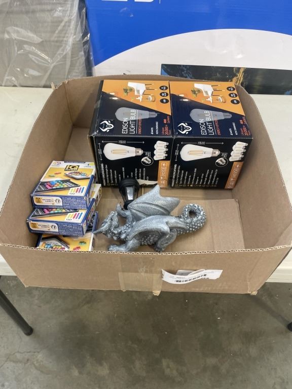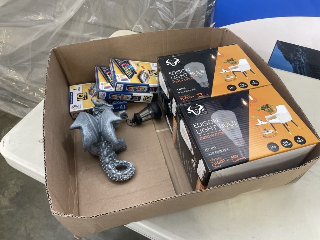 ASSORTED NEW AMAZON ITEMS INDLUDING DRAGON SOLAR LIGHT, EDISON BULBS, IQ GAMES