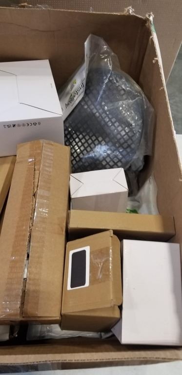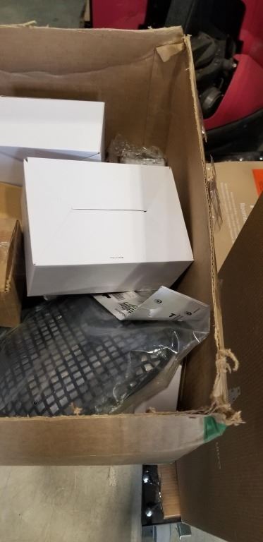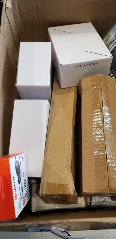 BOX OF NEW AMAZON ITEMS - INK CARTRIDGES, CAR ADAPTERS, SPEAKER GRILL, ETC