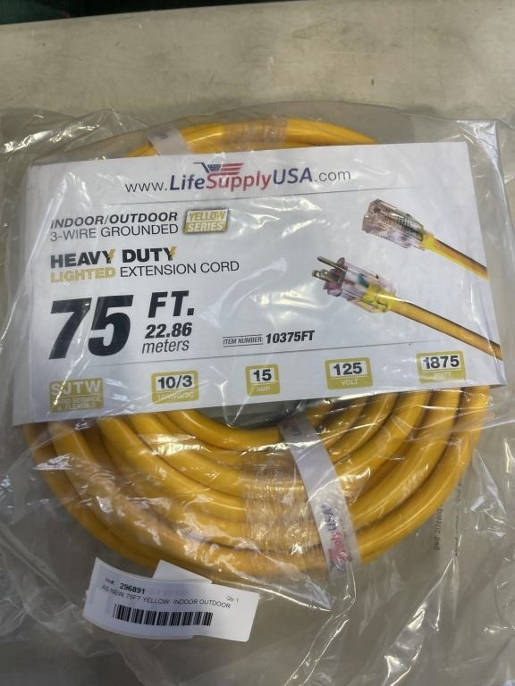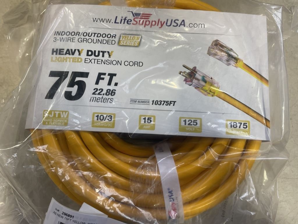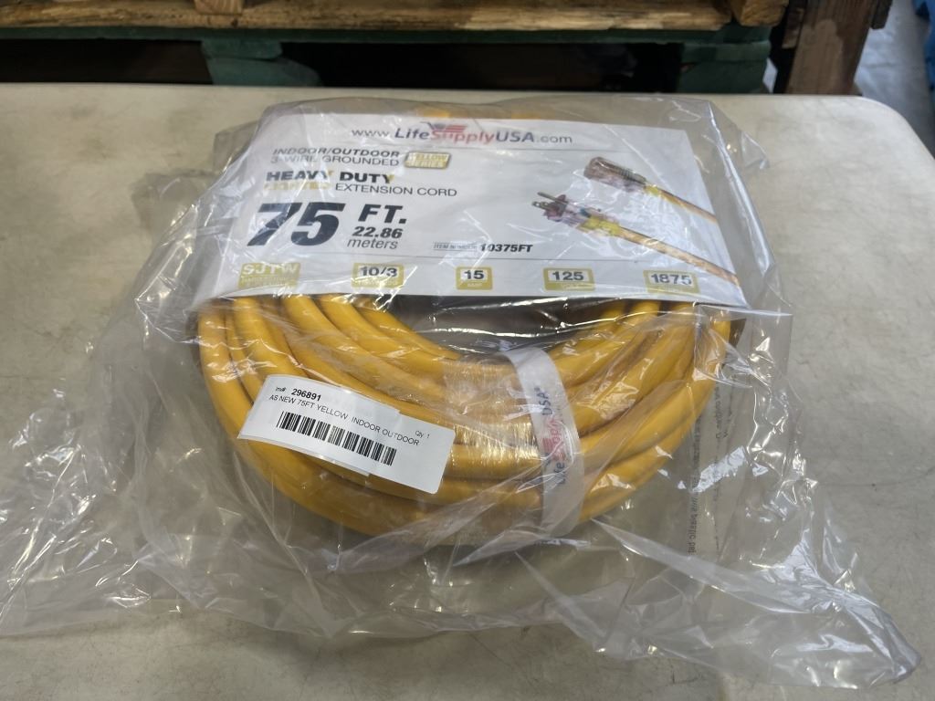 Lot 497 AS NEW 75FT YELLOW INDOOR OUTDOOR HEAVY DUTY LIGHTED 3 WIRE GROUNDED EXTENSION CORD 10AWG