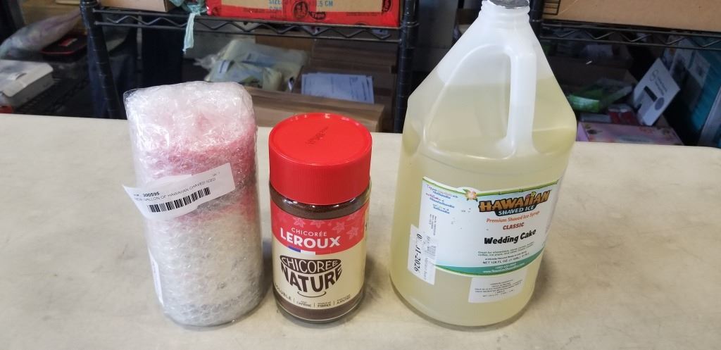 Lot 542 NEW GALLON OF HAWAIIAN CHAVED ICED WEDDING CAKE FLAVOUR AND 2 NEW CHICOREE LEROUX INSTANT COFFEE