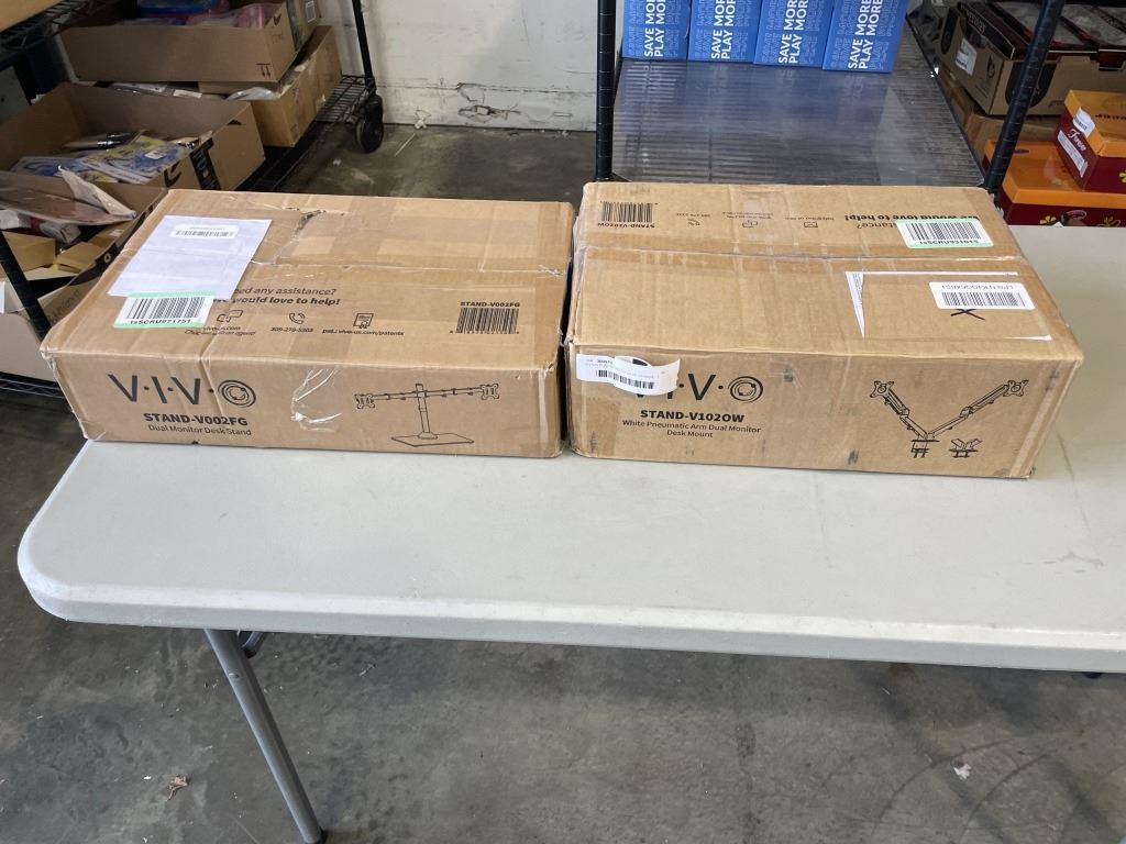 2 VIVO DUAL MONITOR DESK STANDS - 1 FIXED, 1 PNEUMATIC