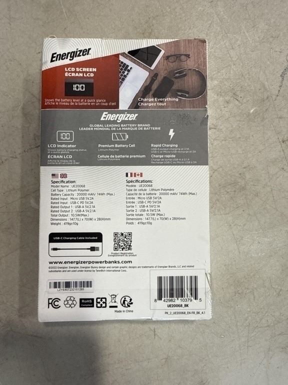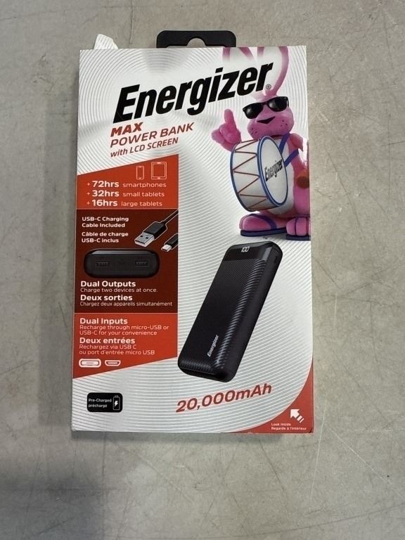 Lot 638 ENERGIZER MAX POWER BANK WITH LCD SCREEN, DUAL CHARGE OUTPUTS, 20,000MAH