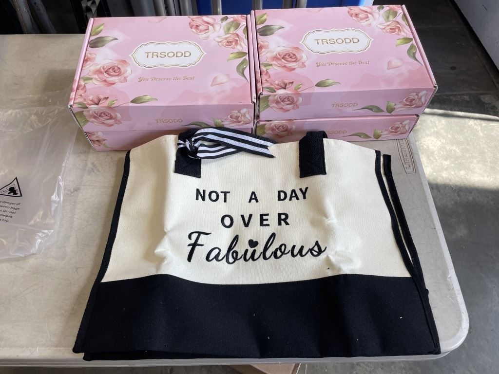 Lot 661 5 NEW CANVAS CARRY TOTES ' NOT A DAY OVER FABULOUS' IN GIFT BOX WITH CARD