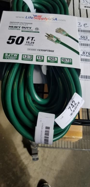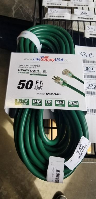 Lot 742 AS NEW 50FT INDOOR OUTDOOR HEAVY DUTY LIGHTED 3 WIRE GROUNDED EXTENSION CORD,GREEN, 12AWG
