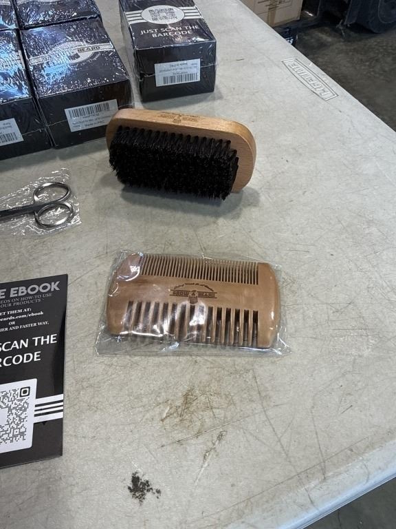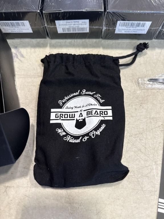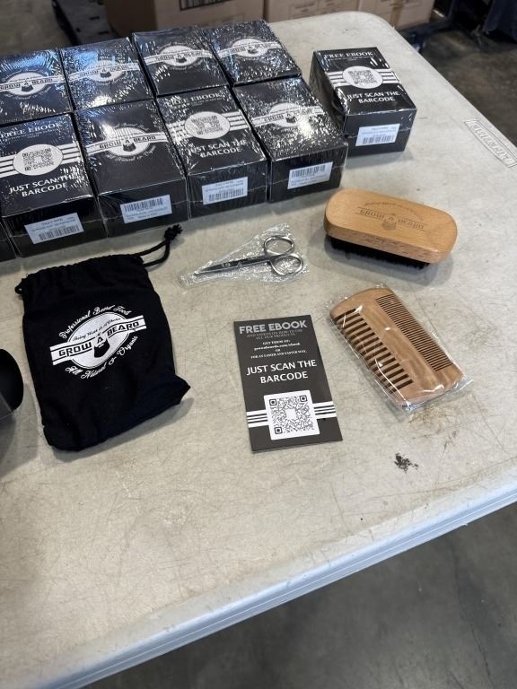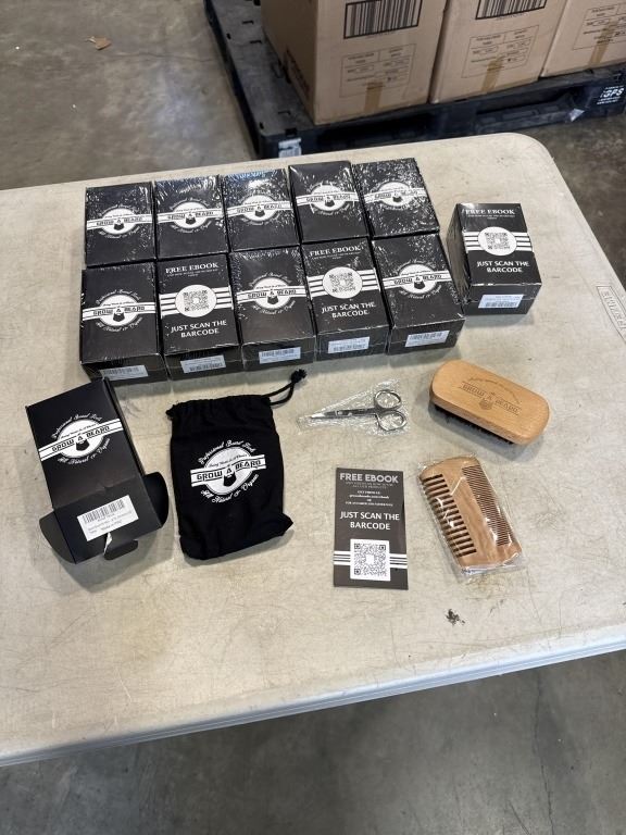 Lot 852 12 NEW GROW A BEARD KITS, EACH KIT INCLUDES WOODEN BRUSH, DOUBLE SIDED COMB, TRIMMING SCISSORS, CARR