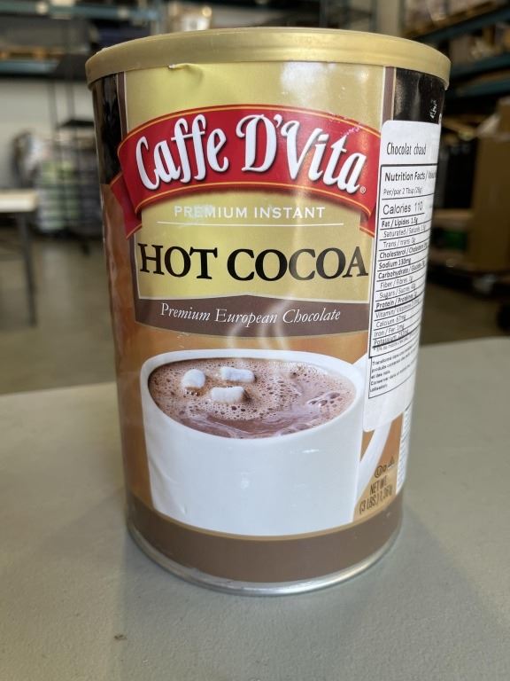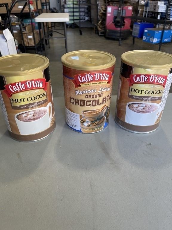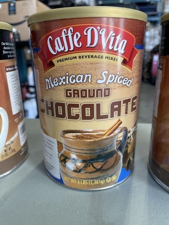 Lot 861 2 NEW CAFFE D'VITA HOT COCOA, 3LBS TUBS AND 1 NEW CAFFE D'VITA MEXICAN SPICED GROUND CHOCOLATE
