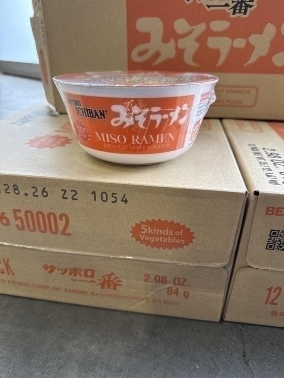 3 NEW CASES OF SAPPORO ICHIBAN MISO RAMEN JAPANESE STYLE NOODLE BOWLS, 12 PER BOX, 36 TOTAL BB. APRIL 28.2026