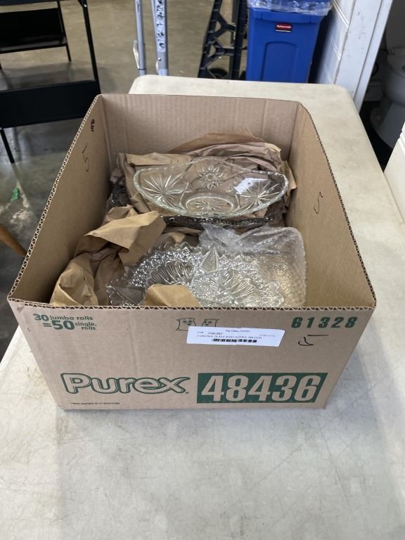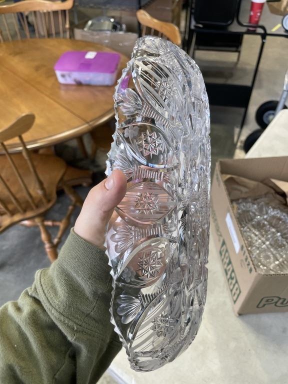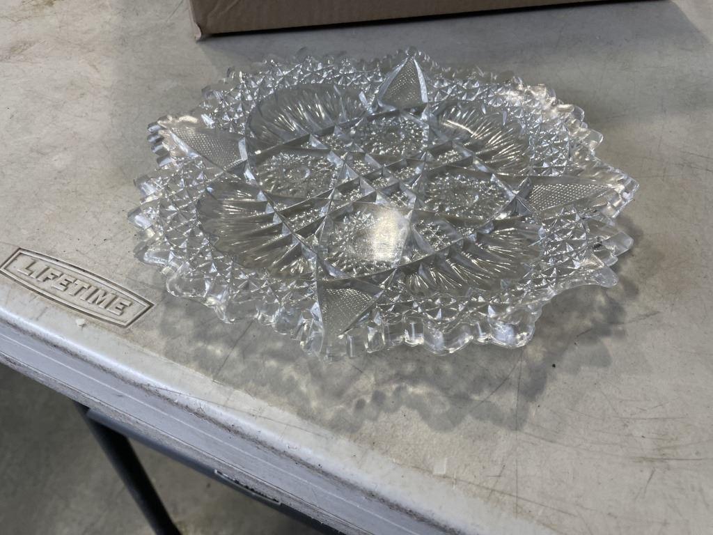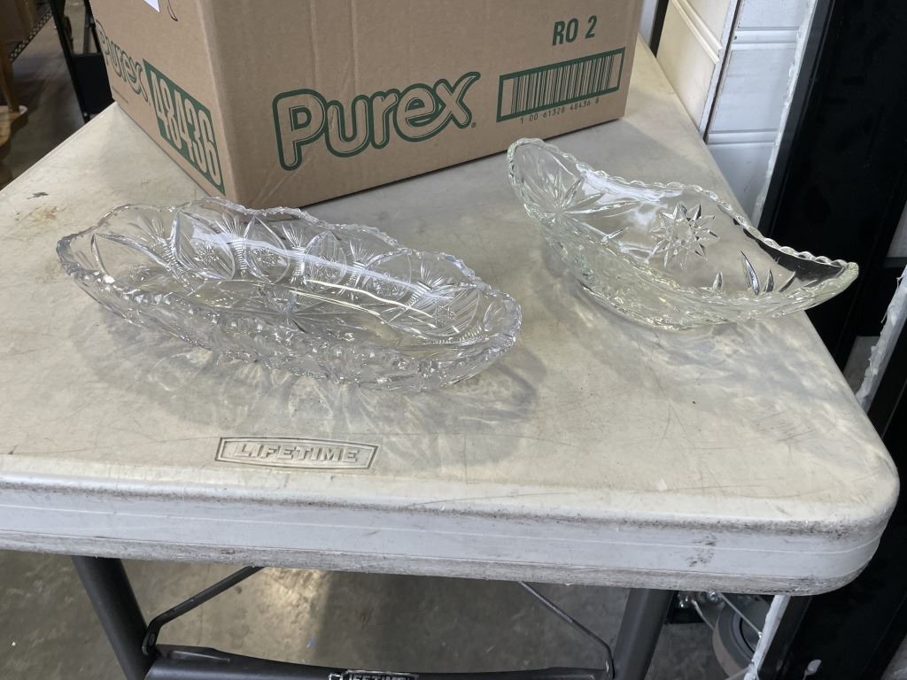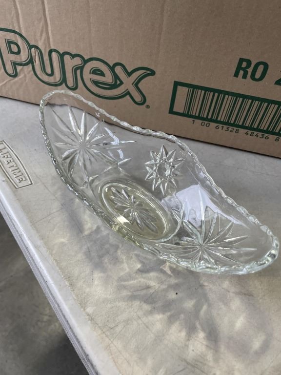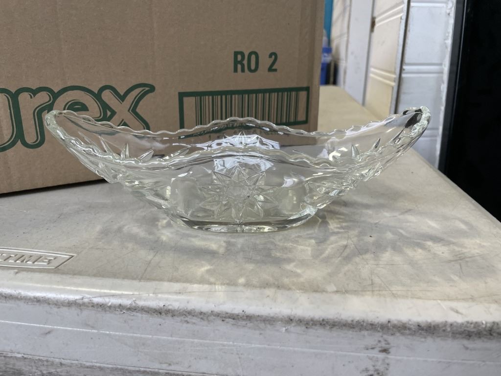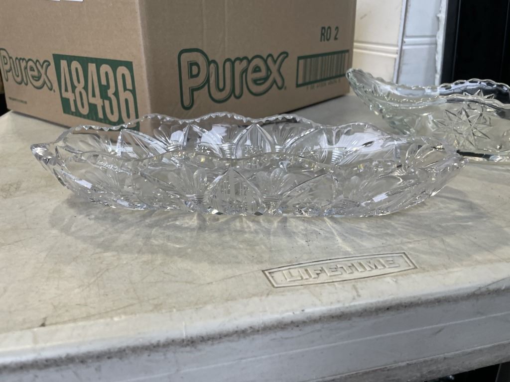 2 VINTAGE GLASS BOAT DISHES, ANCHOR HOCKING CUT GLASS AND VINTAGE AMERICAN BRILLIANT PERIOD CUT GLASS WITH PLATE