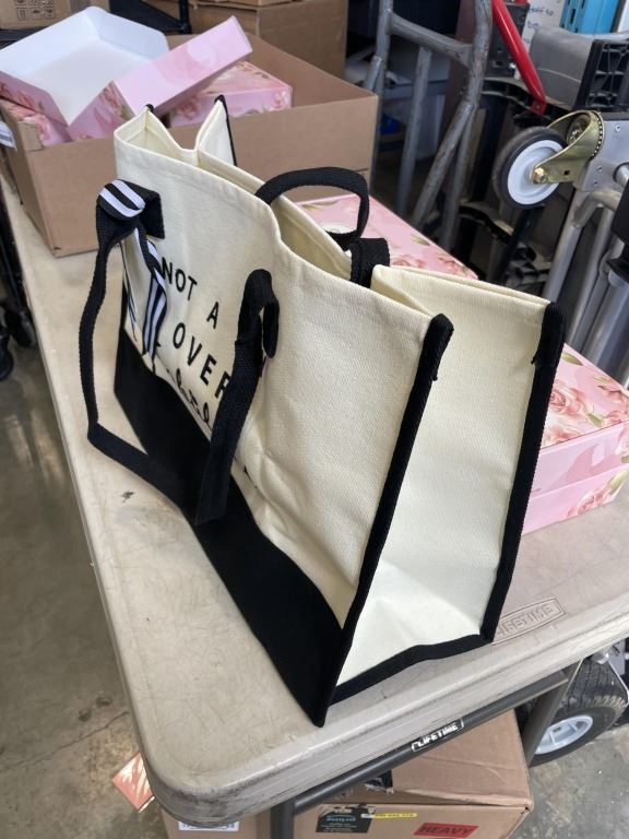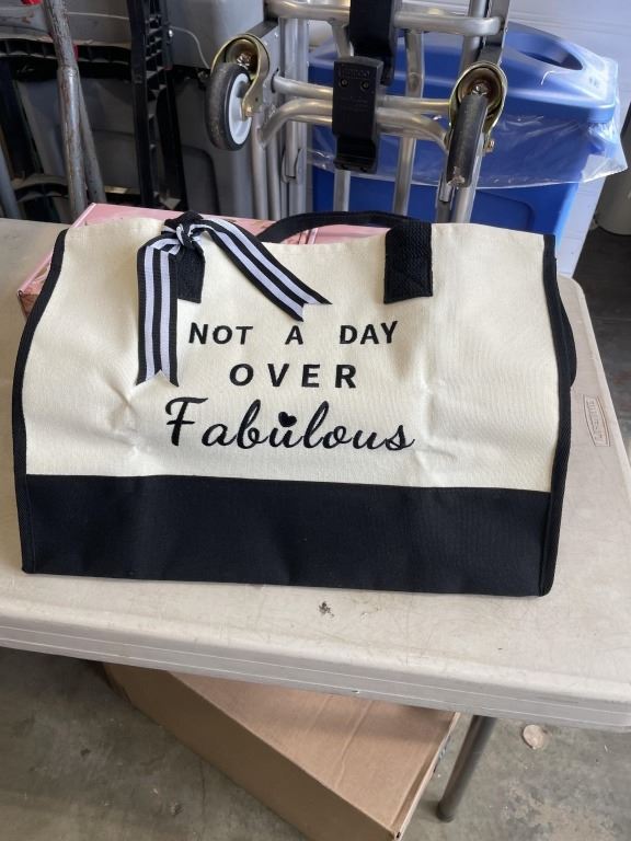 Lot 908 5 NEW CANVAS CARRY TOTES ' NOT A DAY OVER FABULOUS' IN GIFT BOX WITH CARD