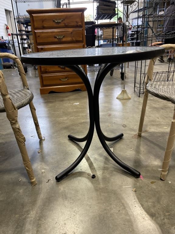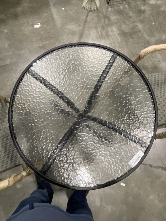 Lot 958 BRAND NEW PATIO BISTRO SET, GLASS TOP ROUND PATIO TABLE, 30 INCH DIAMETER AND 2 STACKING GREY STAINL
