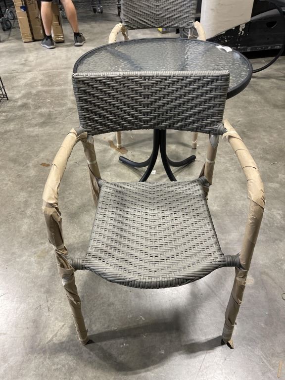 BRAND NEW PATIO BISTRO SET, GLASS TOP ROUND PATIO TABLE, 30 INCH DIAMETER AND 2 STACKING GREY STAINLESS AND RATTAN CHAIRS