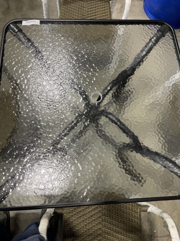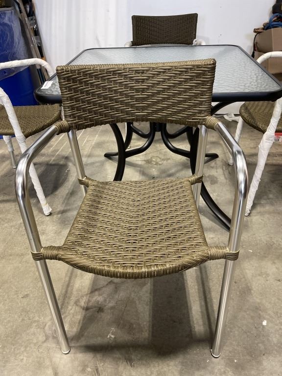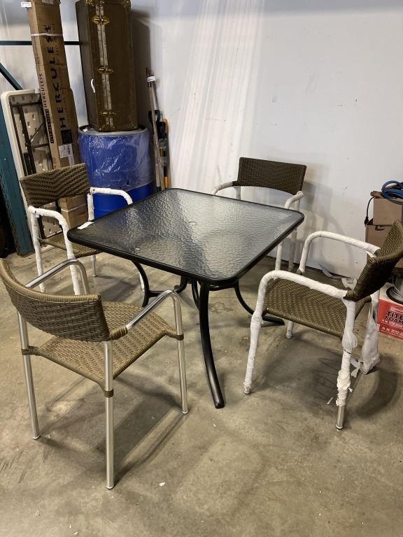 BRAND NEW GLASS TOP SQAURE PATIO WITH 4 BROWN STACKING CHAIRS, 36 INCH SQUARE TABLE