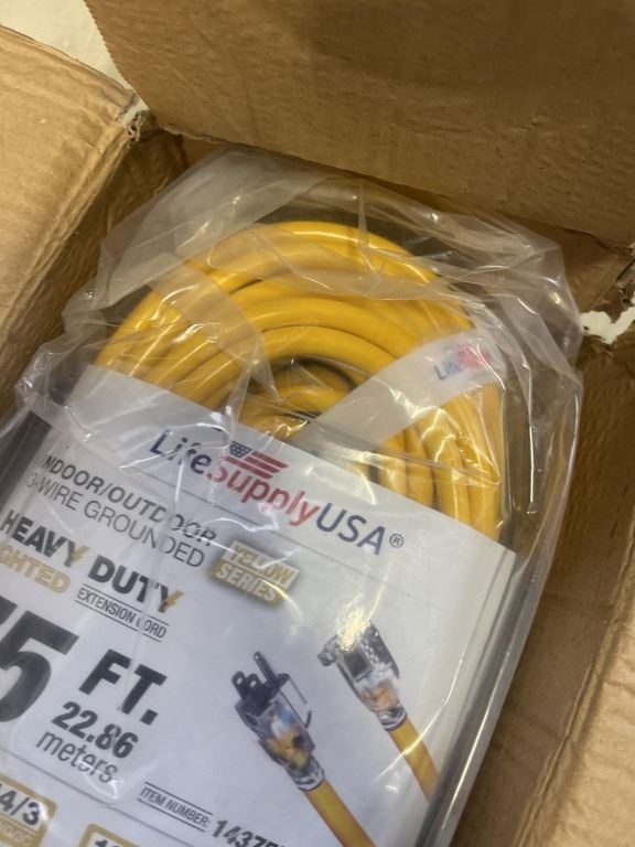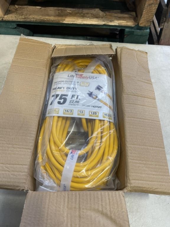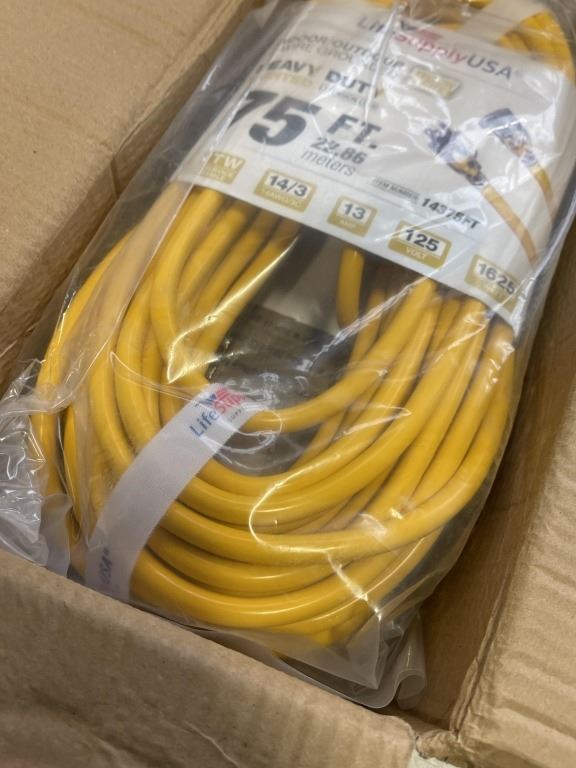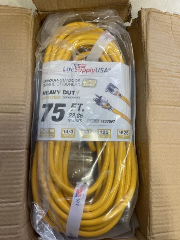 Lot 1014 AS NEW 75FT YELLOW INDOOR OUTDOOR HEAVY DUTY LIGHTED 3 WIRE GROUNDED EXTENSION CORD 14AWG