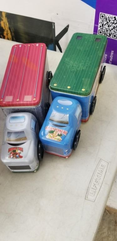 SET OF ANTIQUE LIQUOR DECANTERS , EMPTY, VINTAGE CAPRET KNIFE, 2 TRUCK TINS
