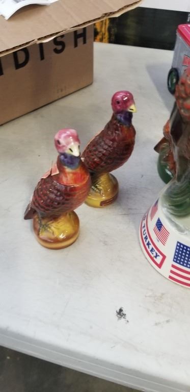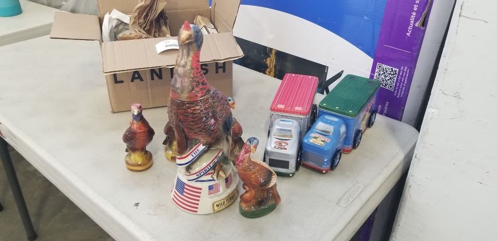 Lot 1035 SET OF ANTIQUE LIQUOR DECANTERS , EMPTY, VINTAGE CAPRET KNIFE, 2 TRUCK TINS