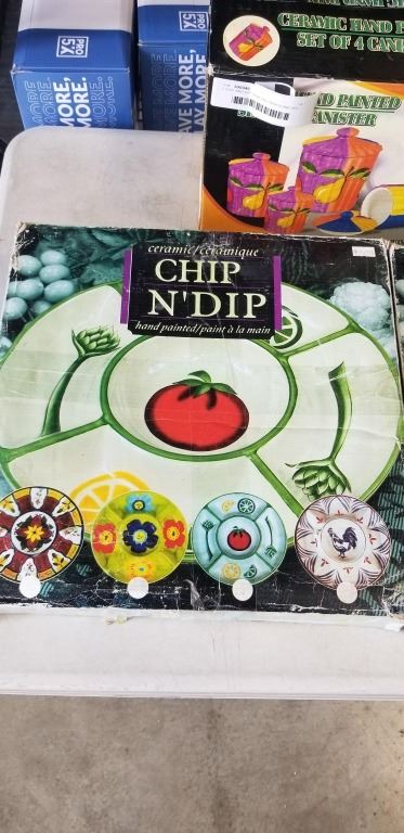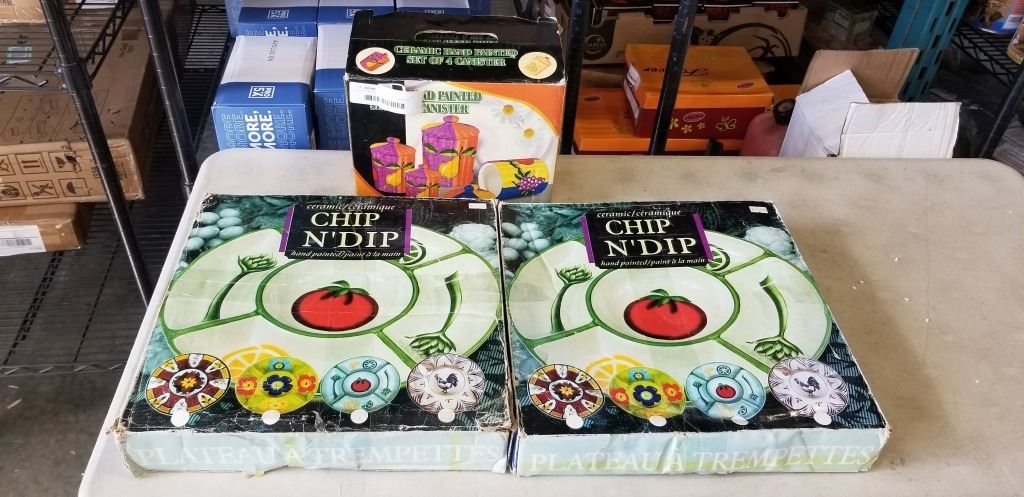 Lot 1038 2 CHIP AND DIP SERCING TRAYS AND 4PC LIDDED CANNISTER SET