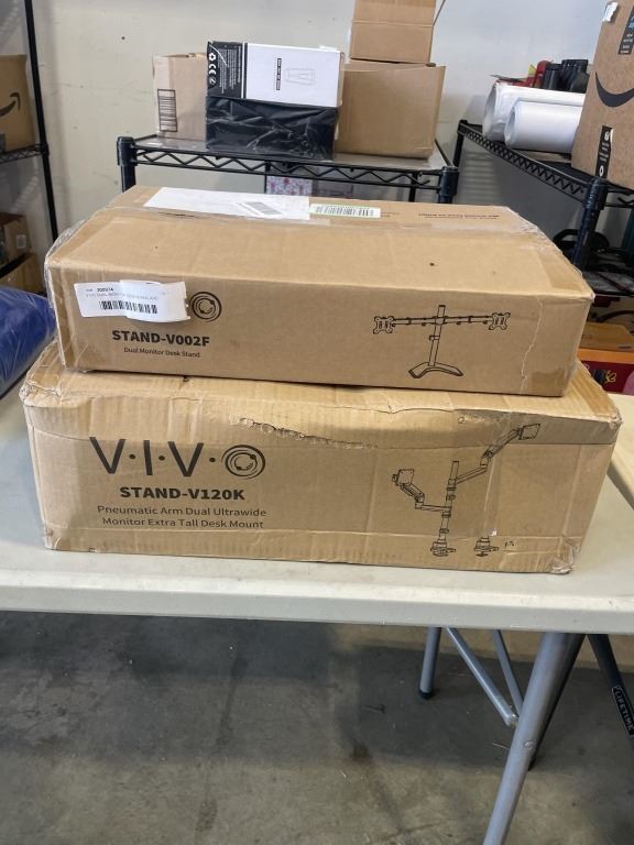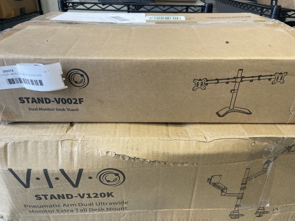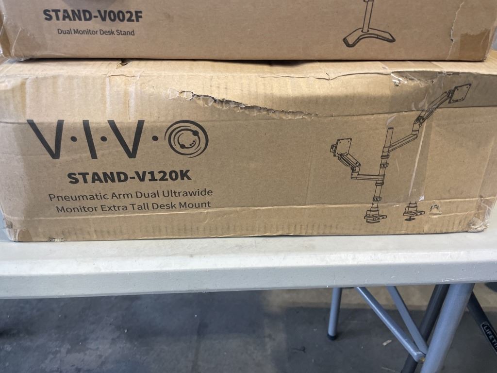 Lot 1042 VIVO DUAL MONITOR DESK STAND AND VIVO DUAL PNEUMATIC ULTRAWIDE AND TALL DESK MOUNT