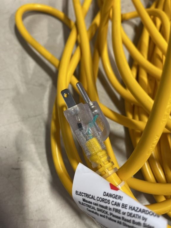 AS NEW 75FT YELLOW INDOOR OUTDOOR HEAVY DUTY LIGHTED 3 WIRE GROUNDED EXTENSION CORD 16AWG