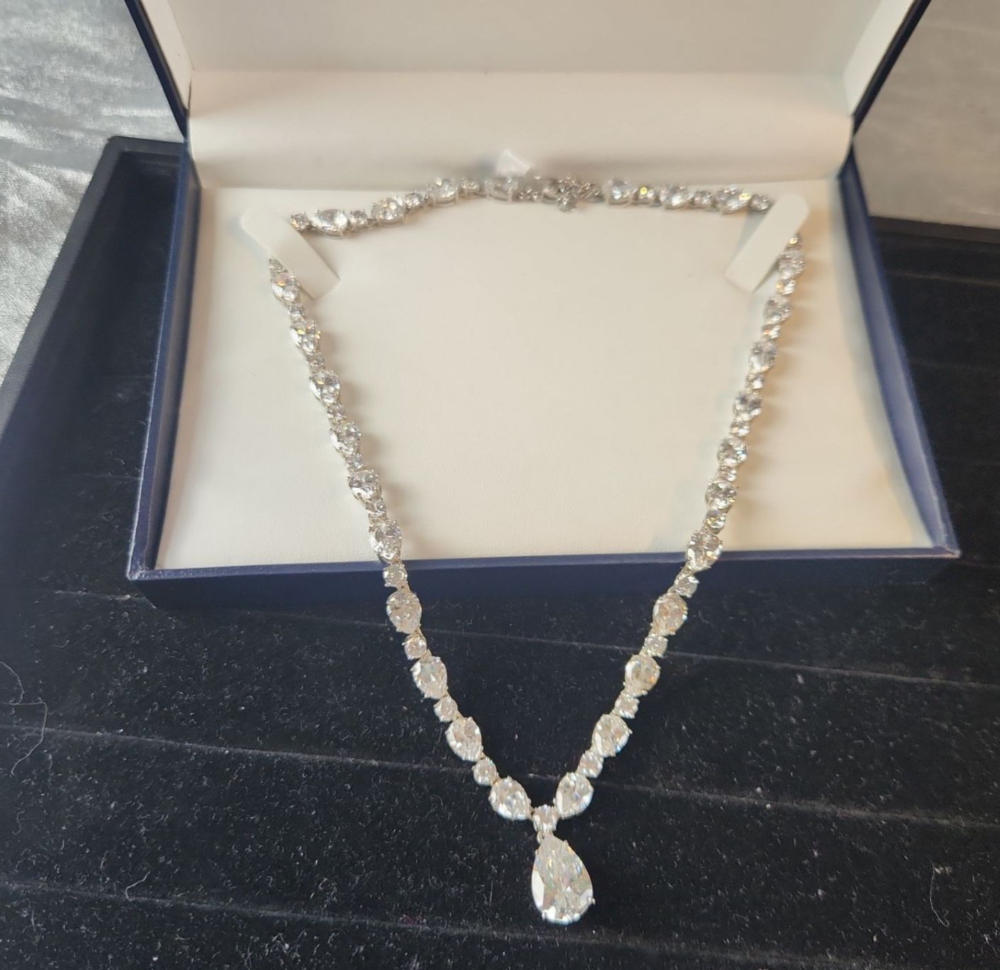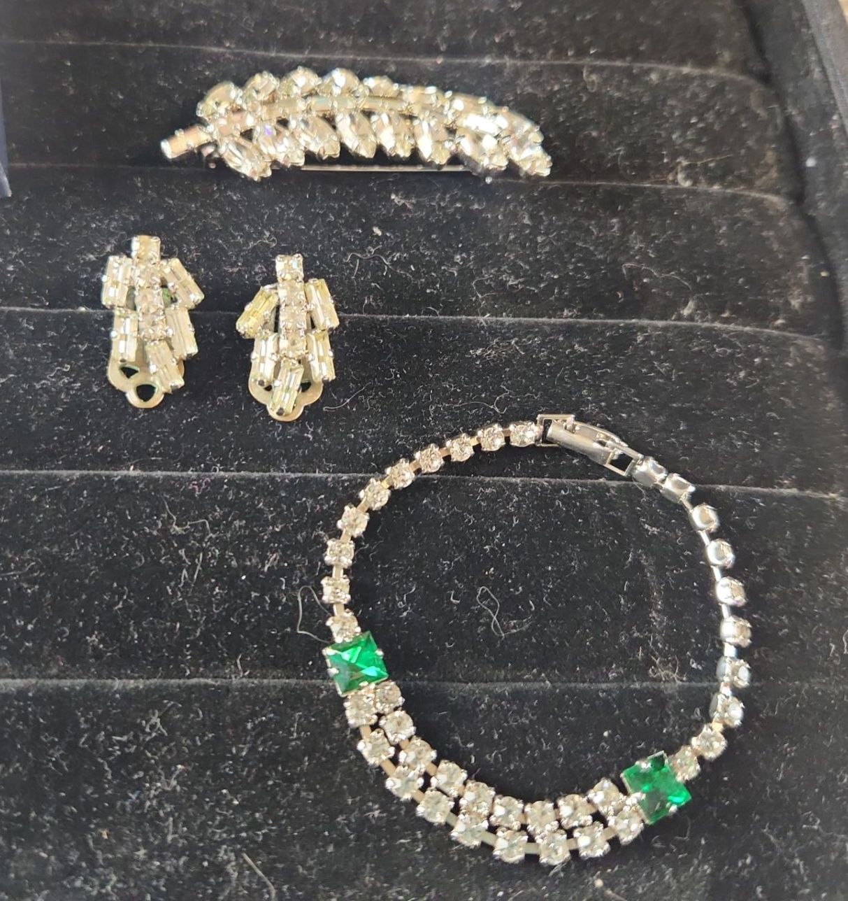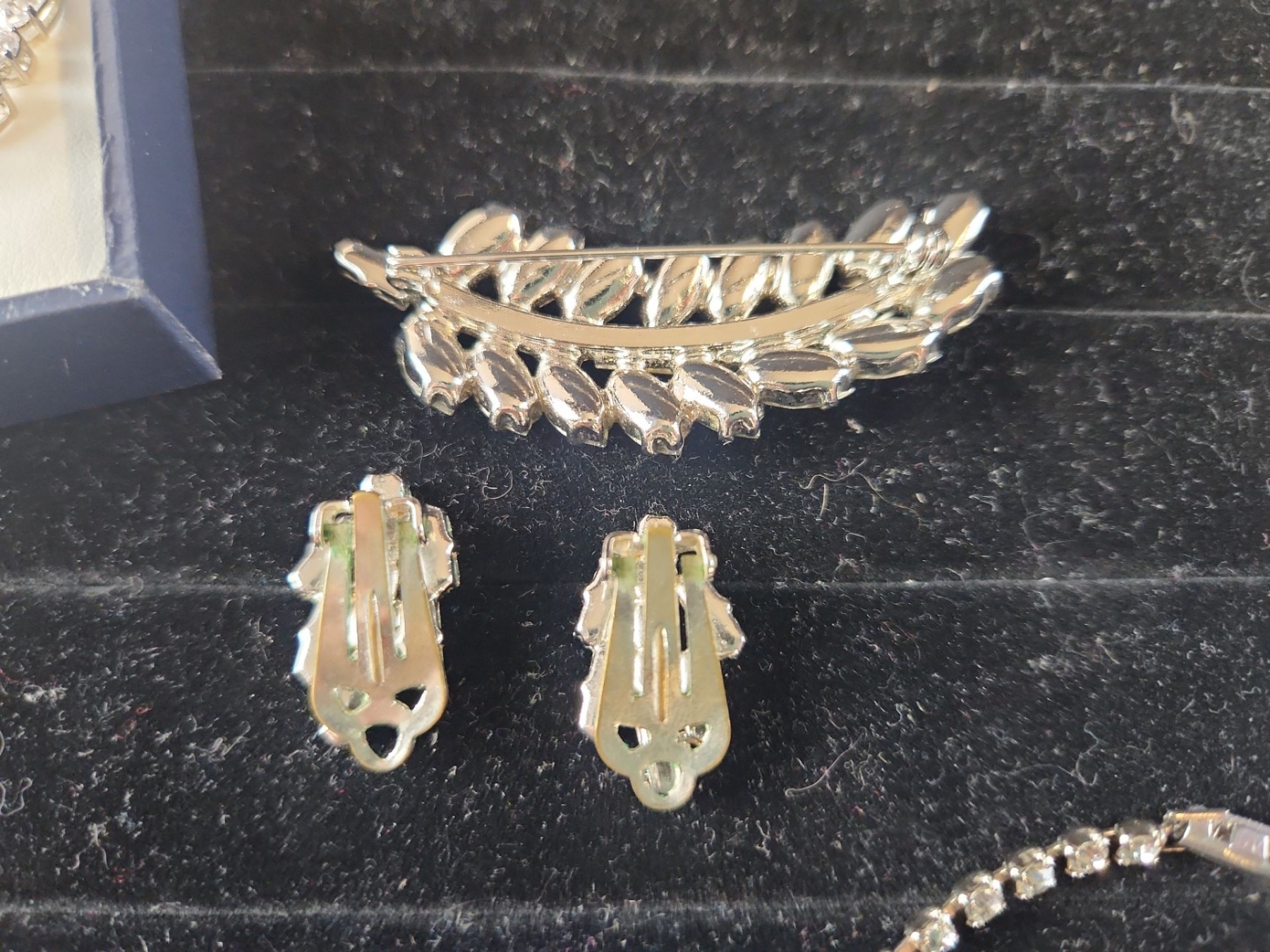 This Jewelry Set Features Various Silver-Tone Pieces Including a Necklace, Bracelet, Earrings, and a Brooch, Likely Showcasing Simulated Diamonds or Crystal