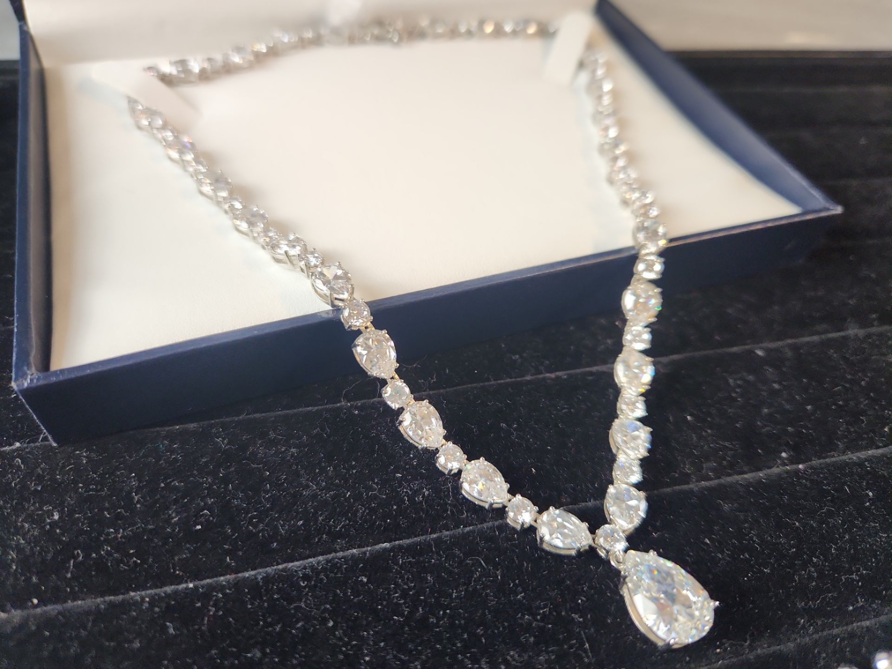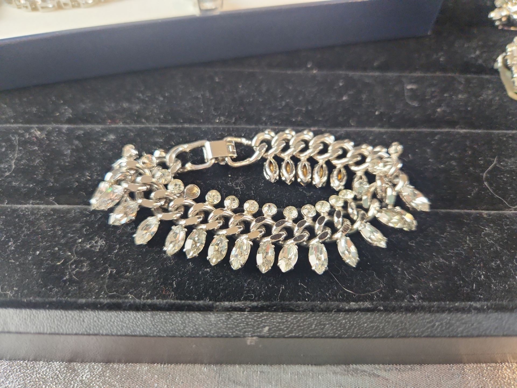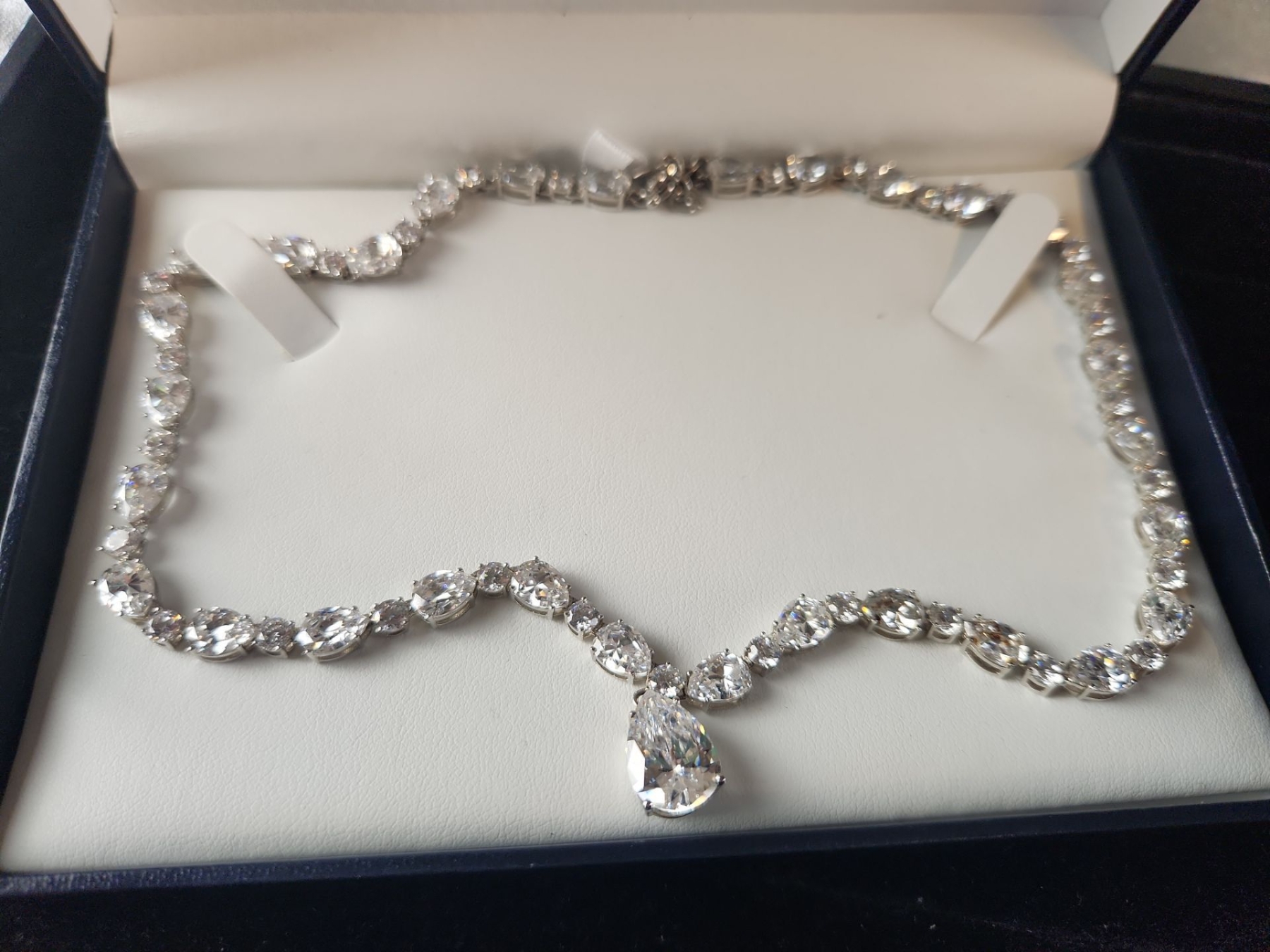 This Jewelry Set Features Various Silver-Tone Pieces Including a Necklace, Bracelet, Earrings, and a Brooch, Likely Showcasing Simulated Diamonds or Crystal