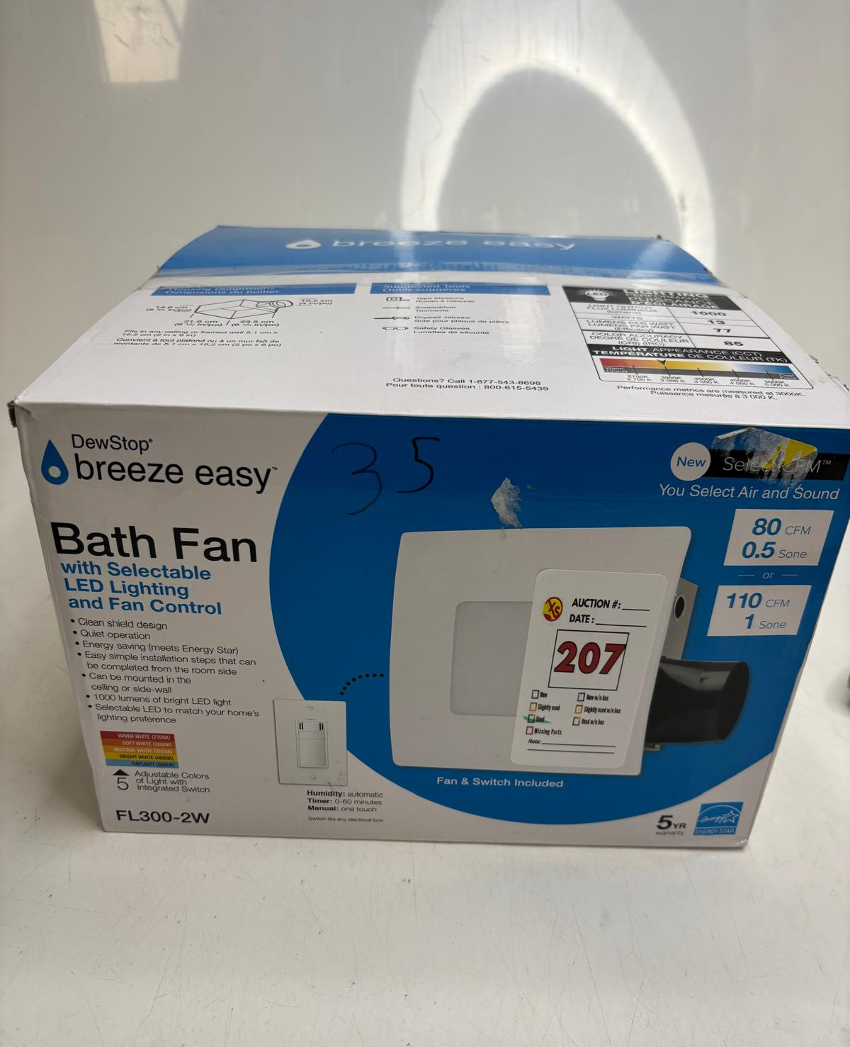 Lot 207 DEWSTOP 80-110 CFM EASY INSTALL BATHROOM/BATH EXHAUST FAN WITH ADJUSTABLE LED LIGHT (USED)