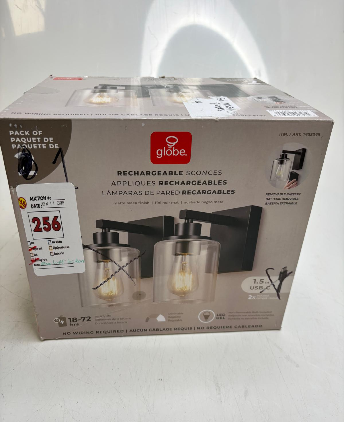 Lot 256 GLOBE ELECTRIC RECHARGEABLE GLASS WALL SCONCE -SUMP