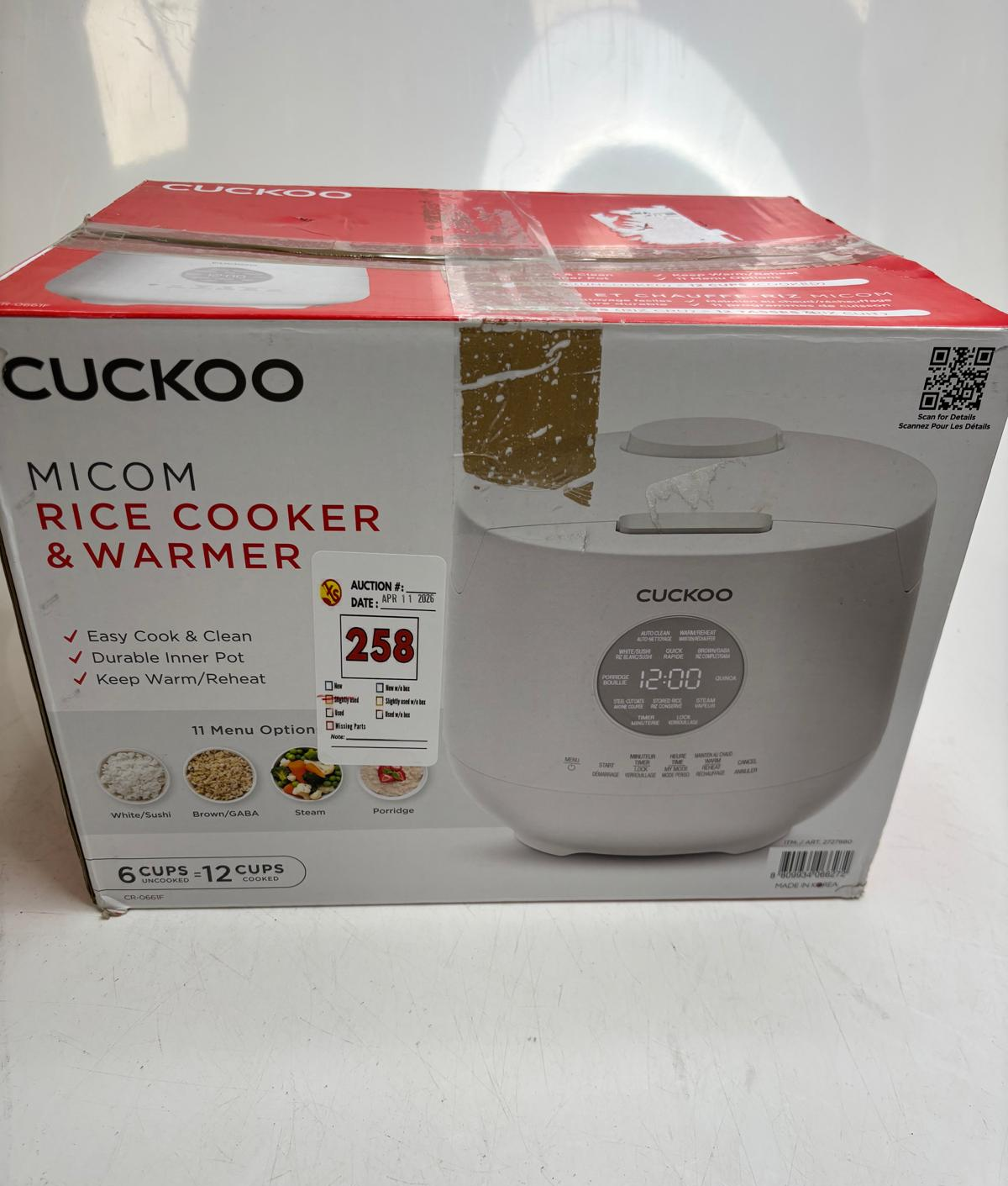 Lot 258 CUCKOO 6 CUP MULTIFUNCTIONAL MICOM RICE COOKER AND WARMER - (USED, MISSING CUP)