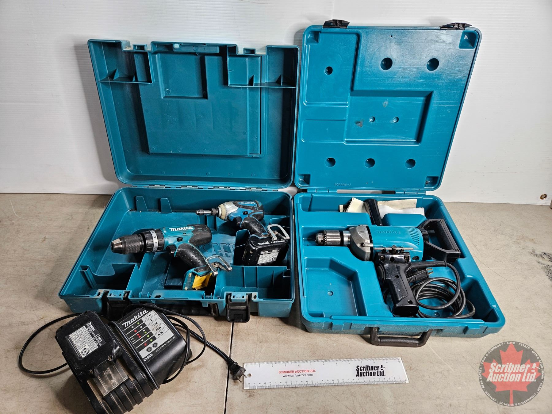 Lot 1053 Makita Combo : - 18v Drill & 1/4" Impact - 1/2" Drive Corded Drill (w/Cases)