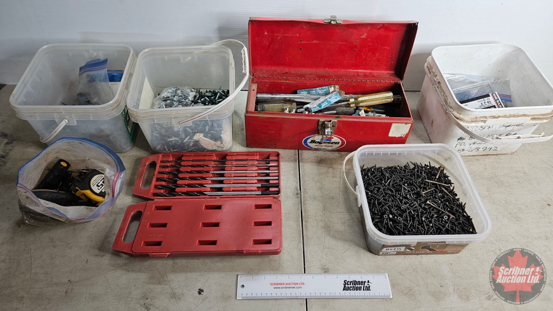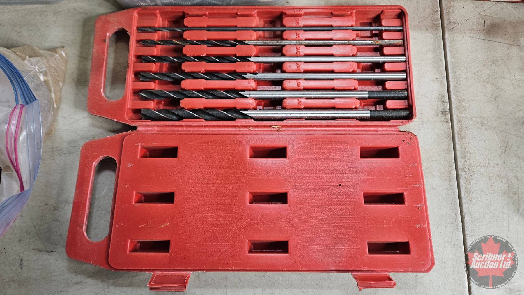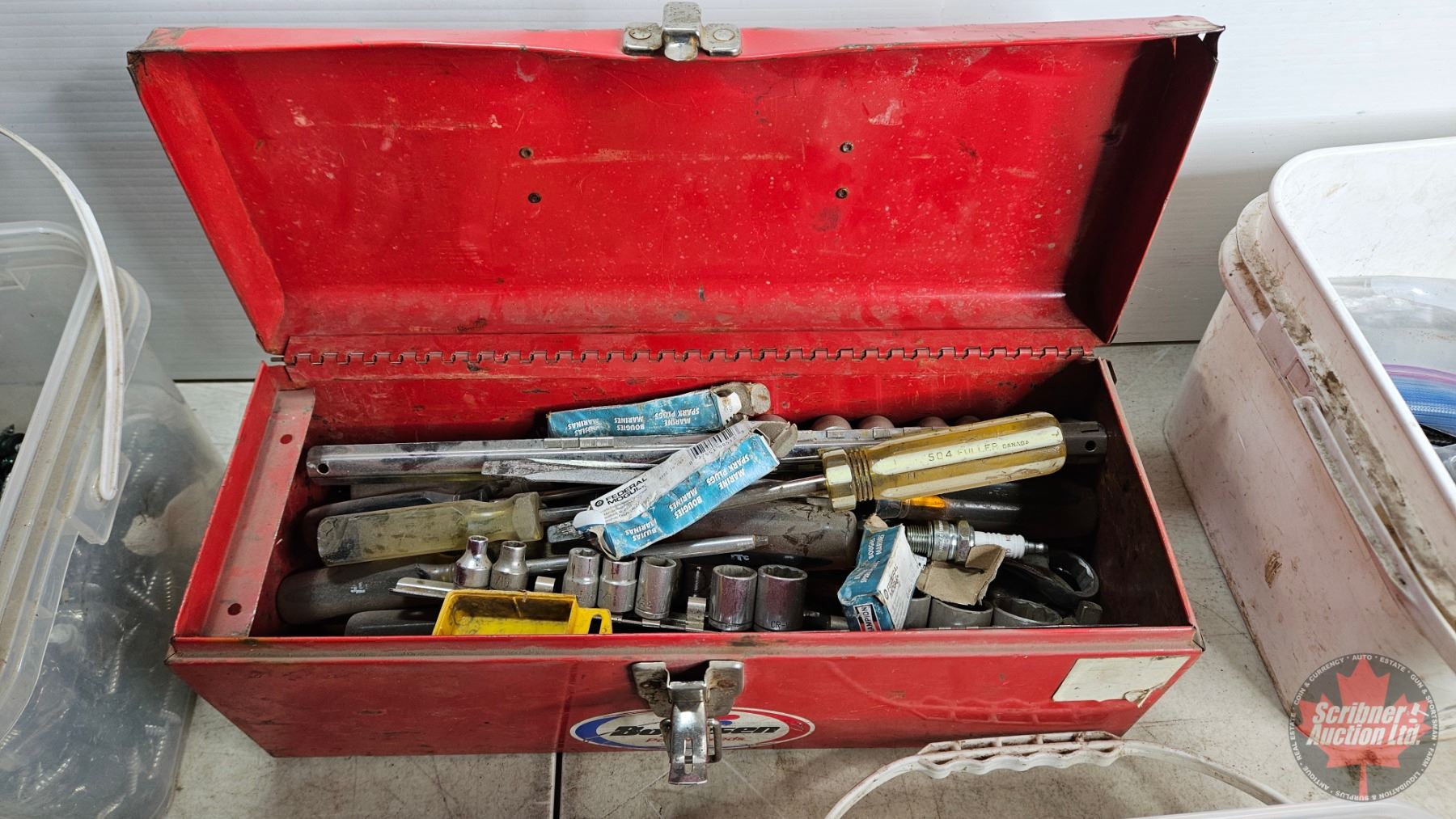 Lot 1061 Variety Grouping/Combo : Drill Bits; Sockets; Wrenches; Screw Drivers; etc + Metal Hand Held Tool Bo