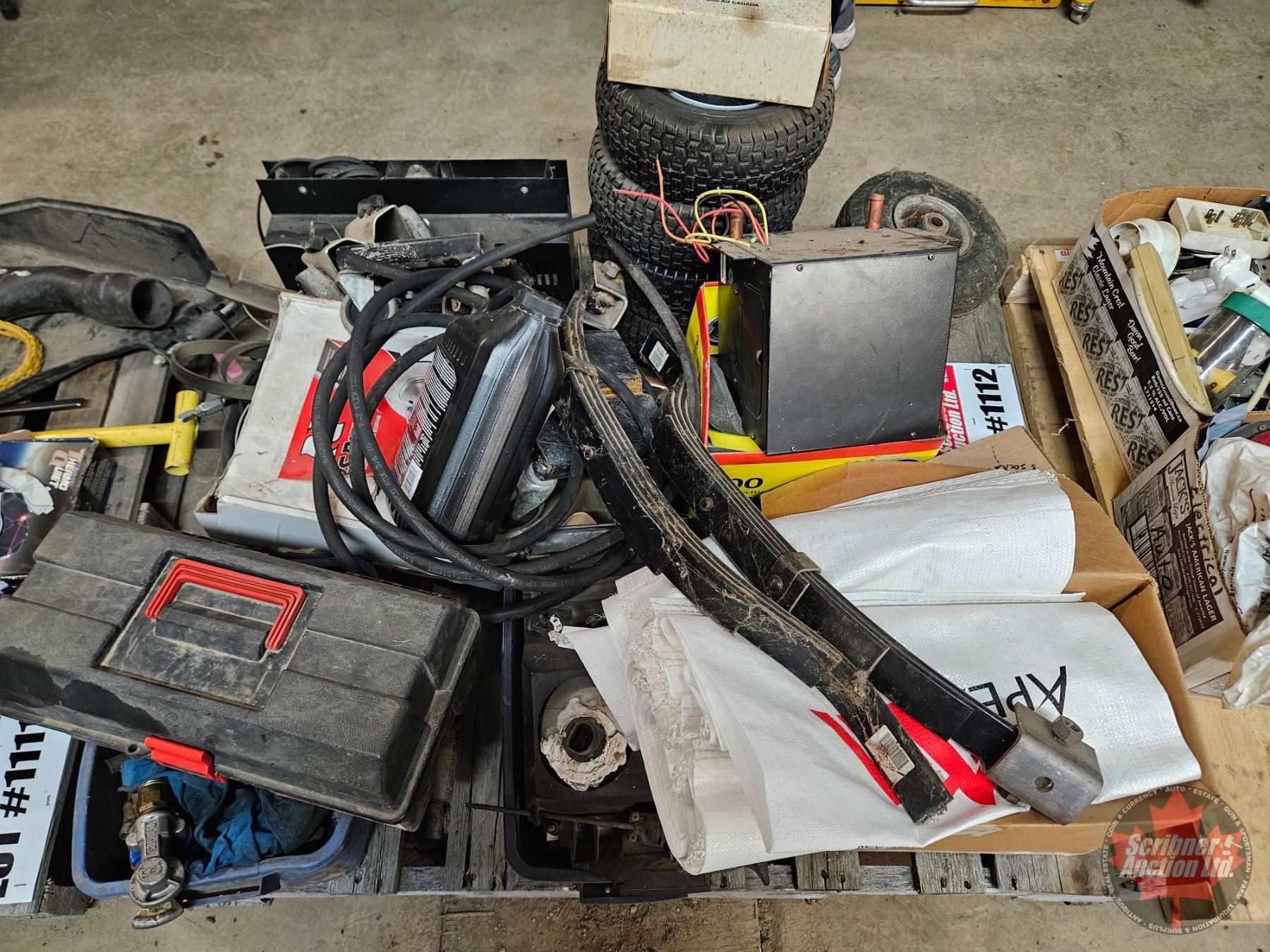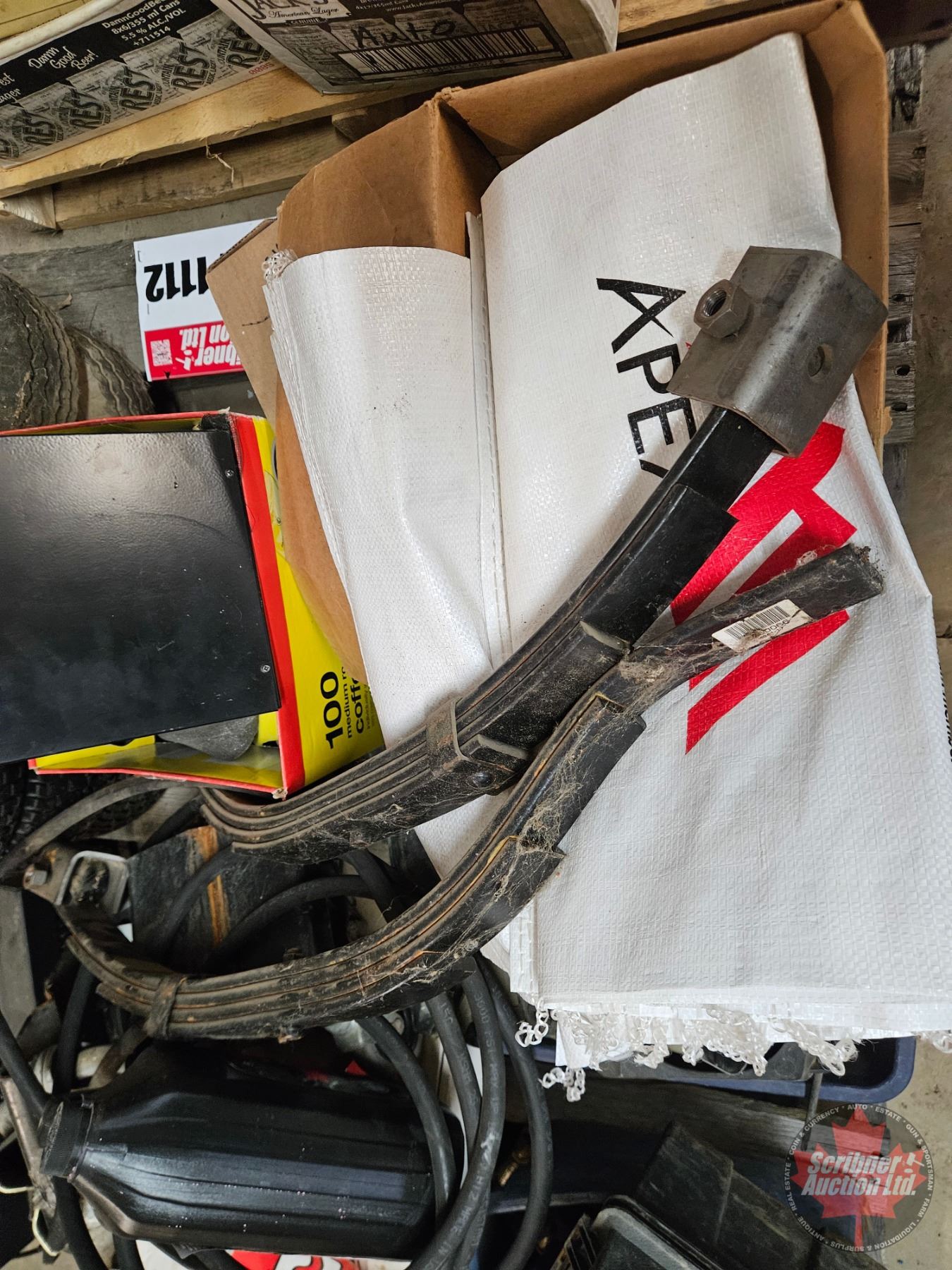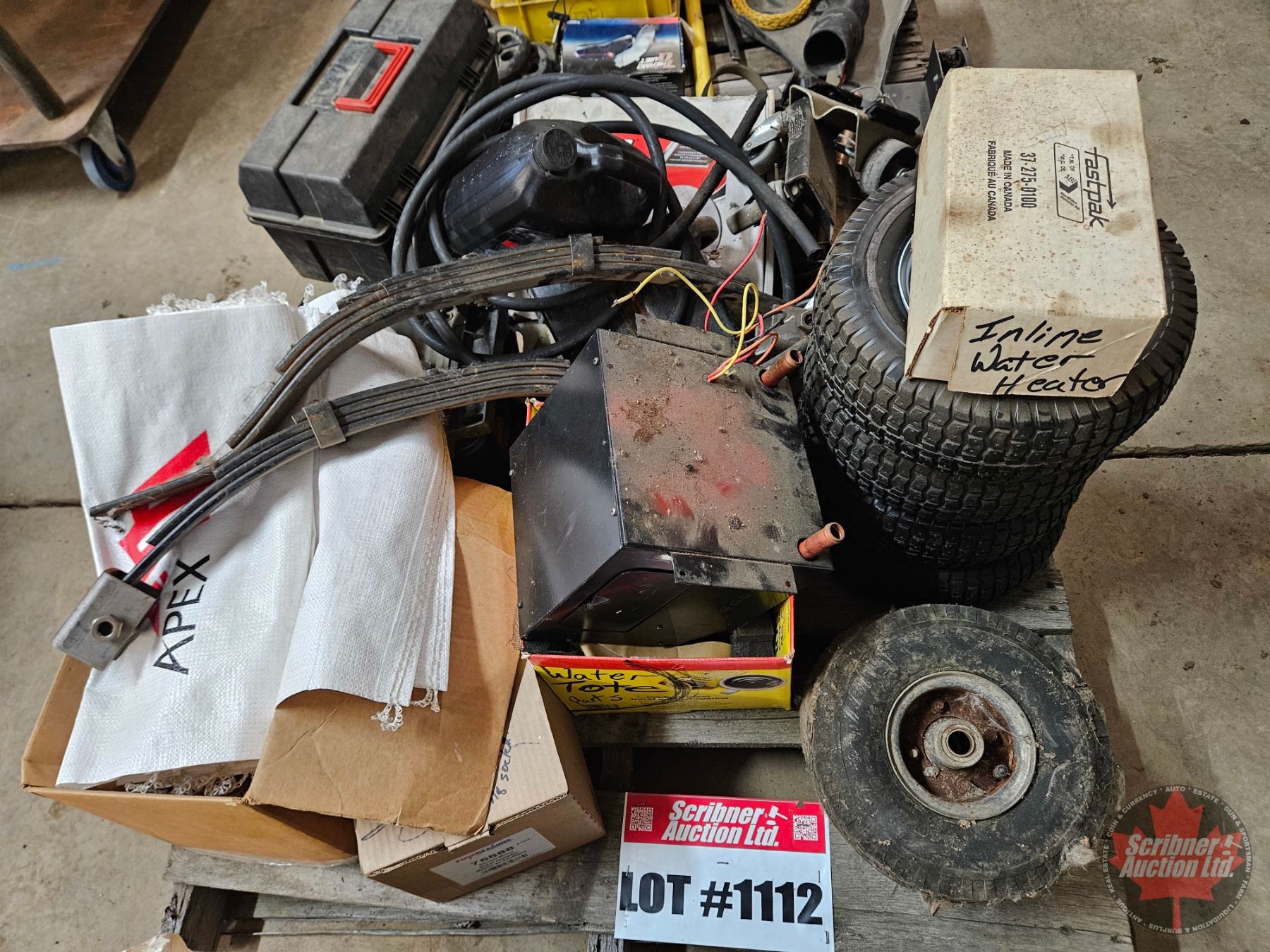 Lot 1112 Pallet Lot : Variety of Fittings ; Leaf Springs; Small Tires; Bus Heater; etc