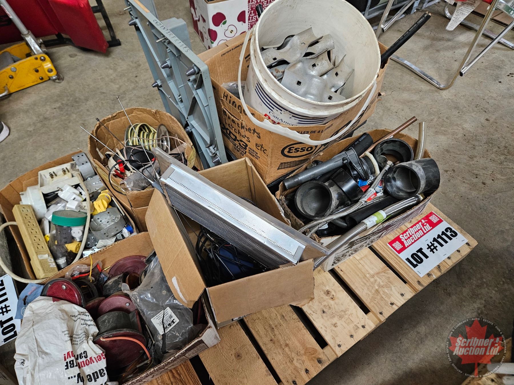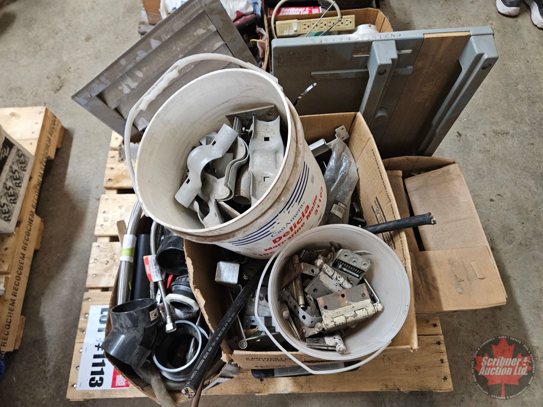 Lot 1113 Pallet Lot: Variety of Plumbing / Electrical (12v / 110v) ; Joist Hangers; Hinges