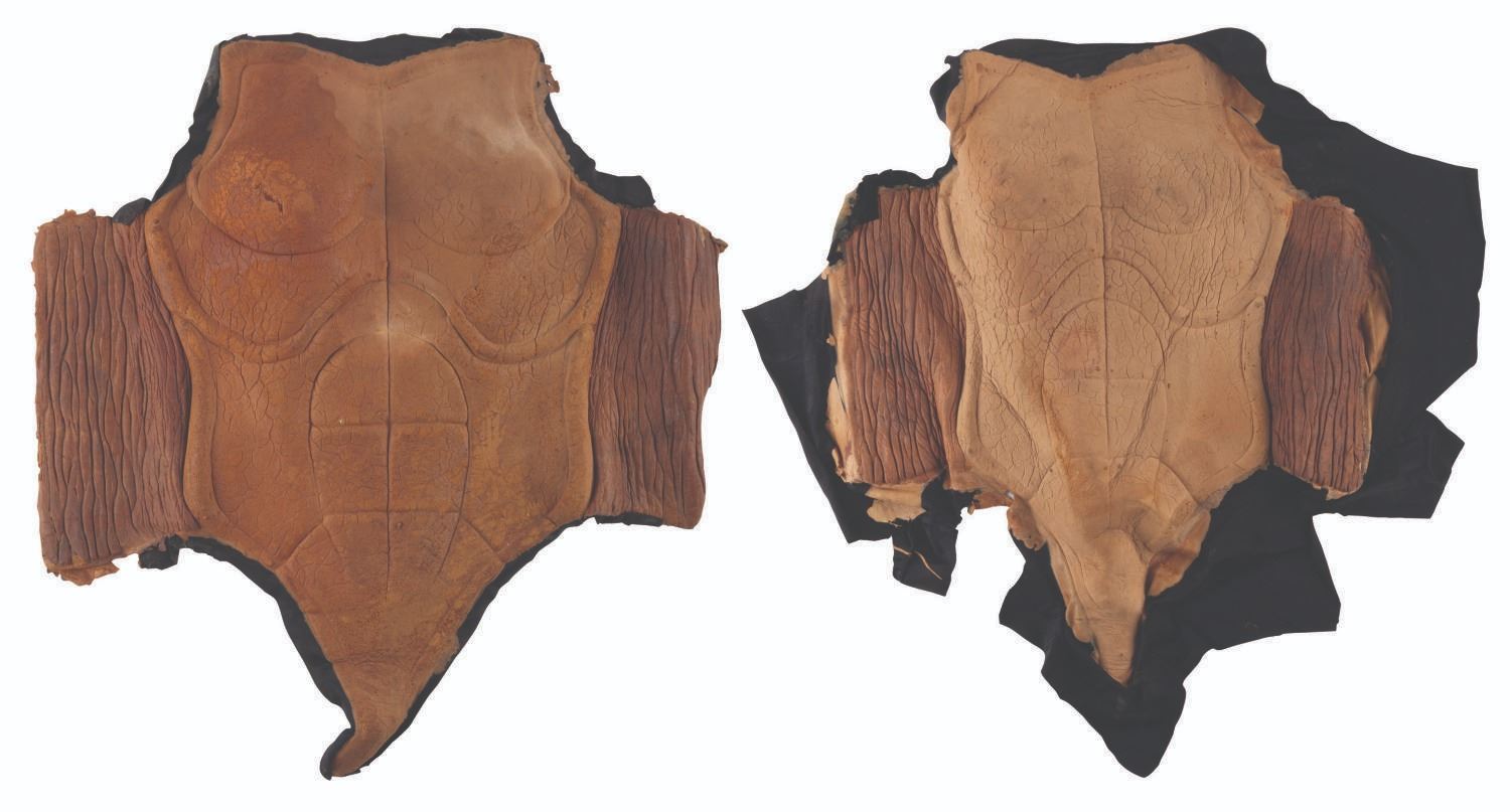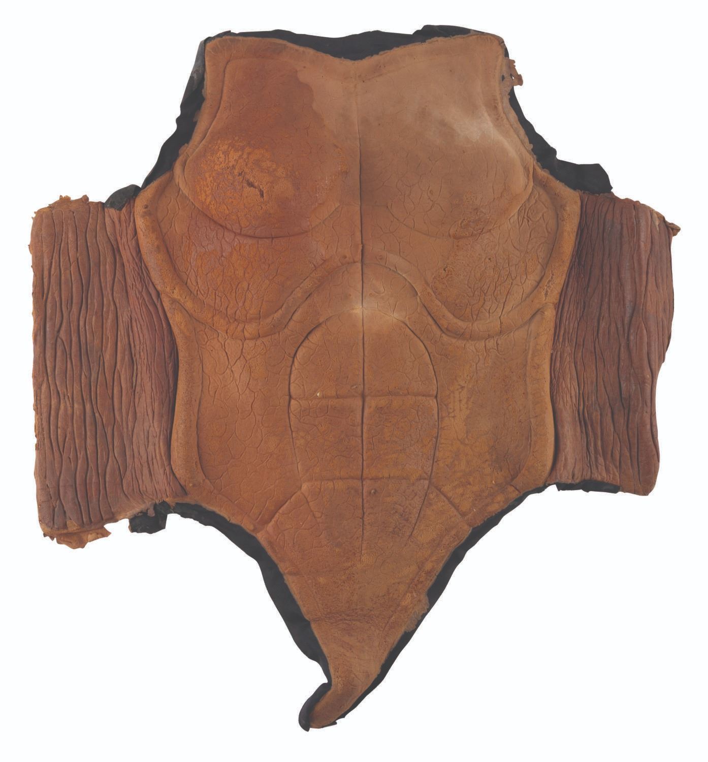 (Fox, 1997-98) A pair of costume torso pieces for Venus de Milo from "Ninja Turtles: The Next Mutation. " Created for this live-action series, Venus was the fifth member of the group and the first female turtle. Measuring 21 " x 25 " each, the torso skins display in good condition with paint loss, light material loss, surface tackiness, and wear from production use.