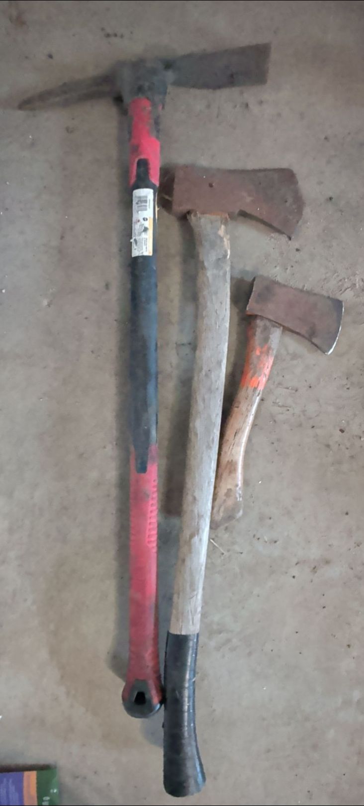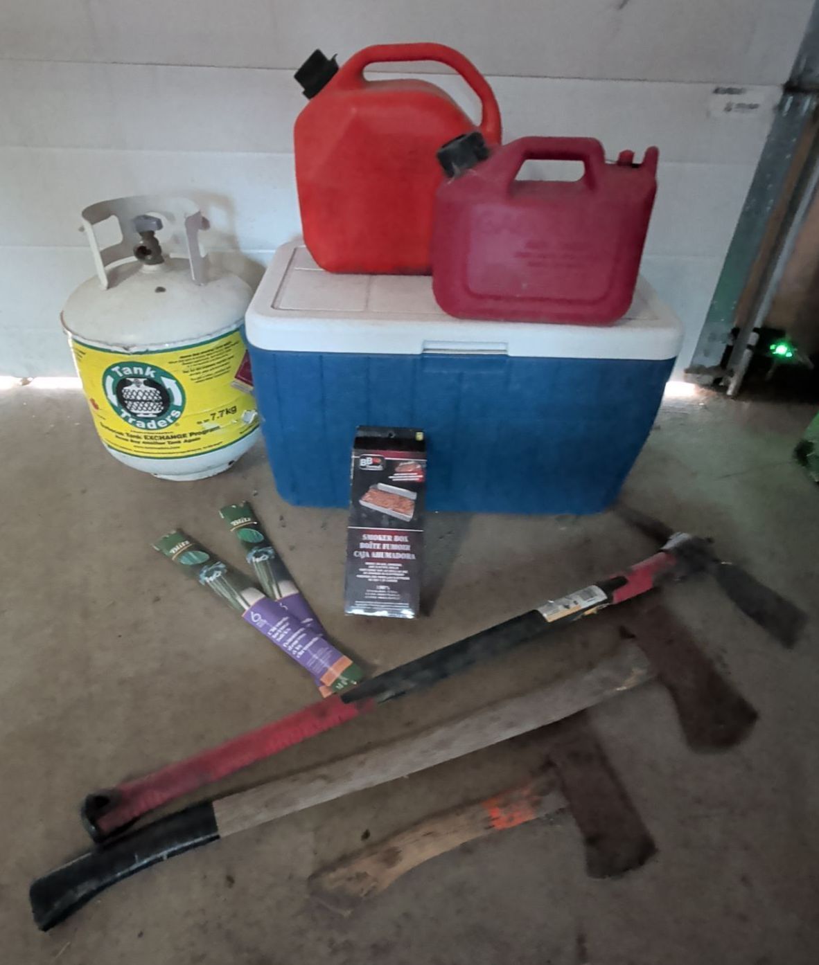 Lot 198 Camper's Pack - Pick Axe Axe Hatchet Citronella Stakes Jerry cans Cooler & more