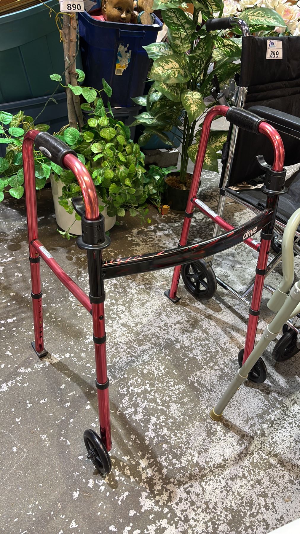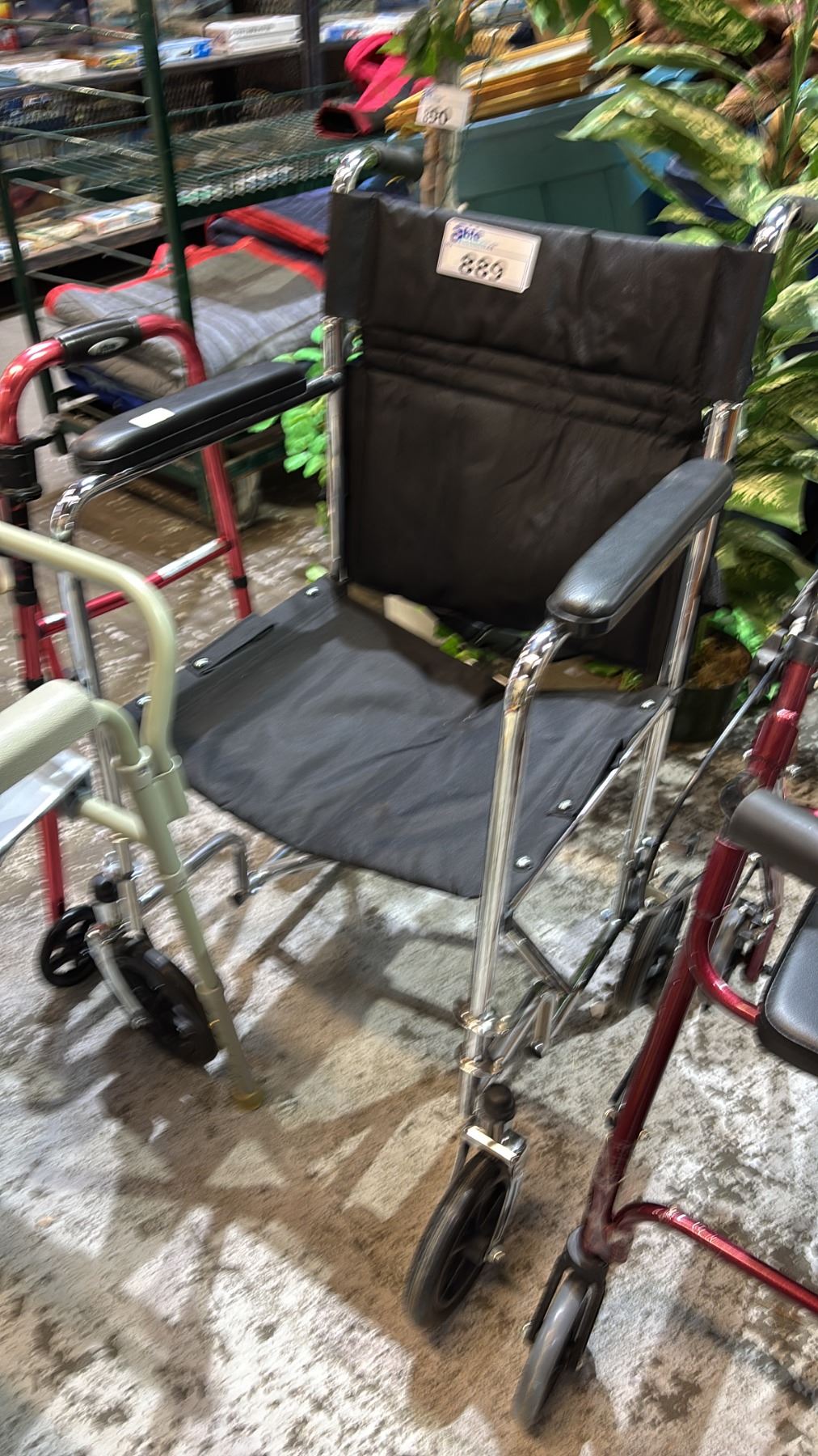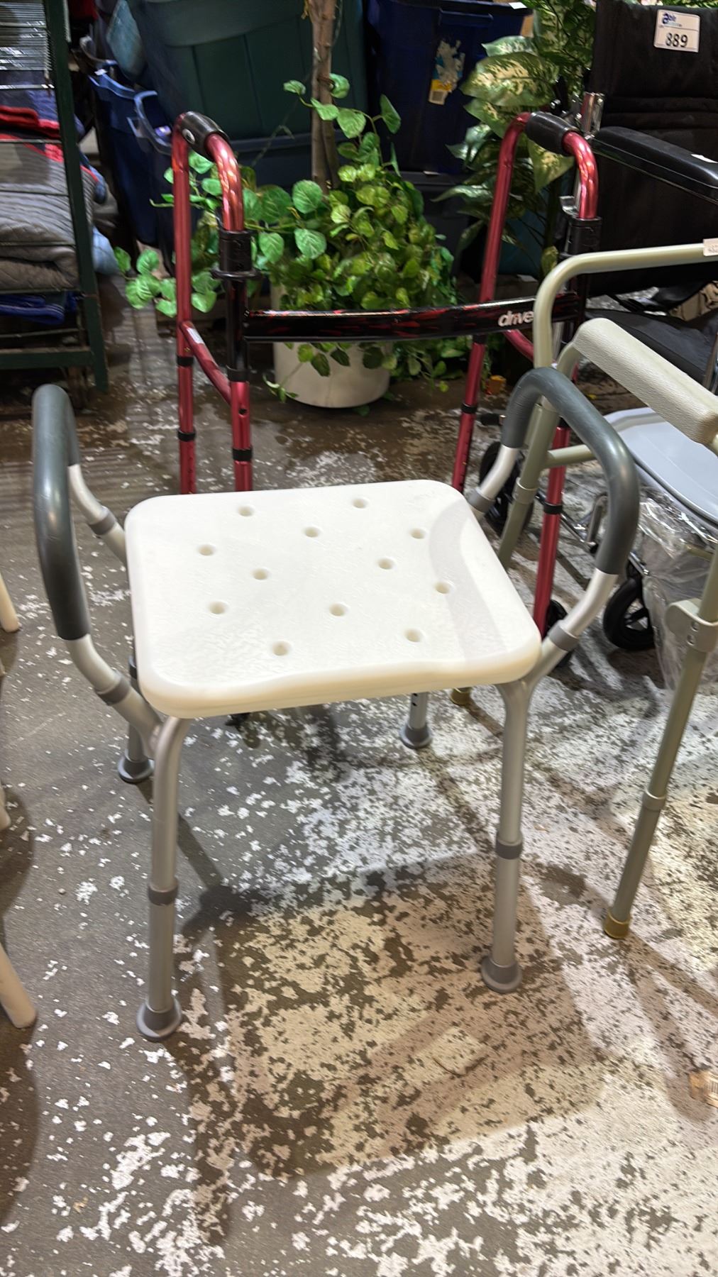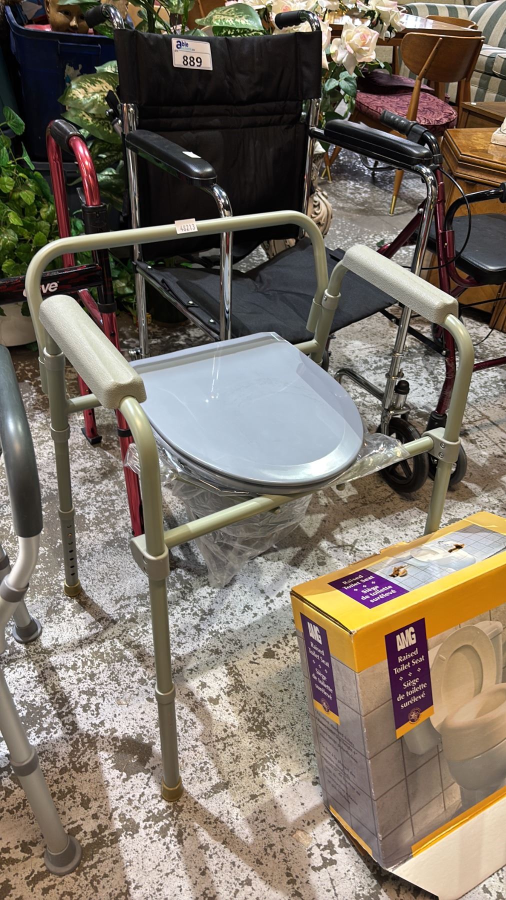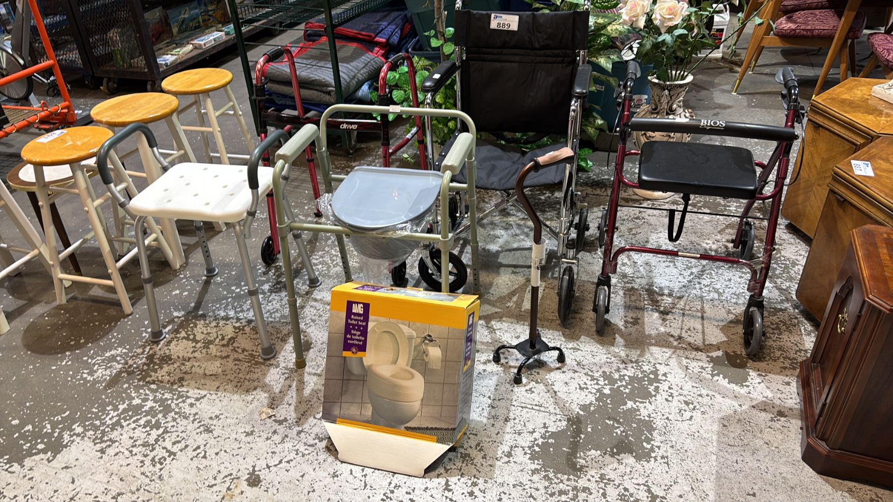 Lot 889 WALKERS, WHEELCHAIR, SHOWER SEAT, COMMODE CHAIR, CANE WITH QUAD BASE & RAISED TOILET SEAT
