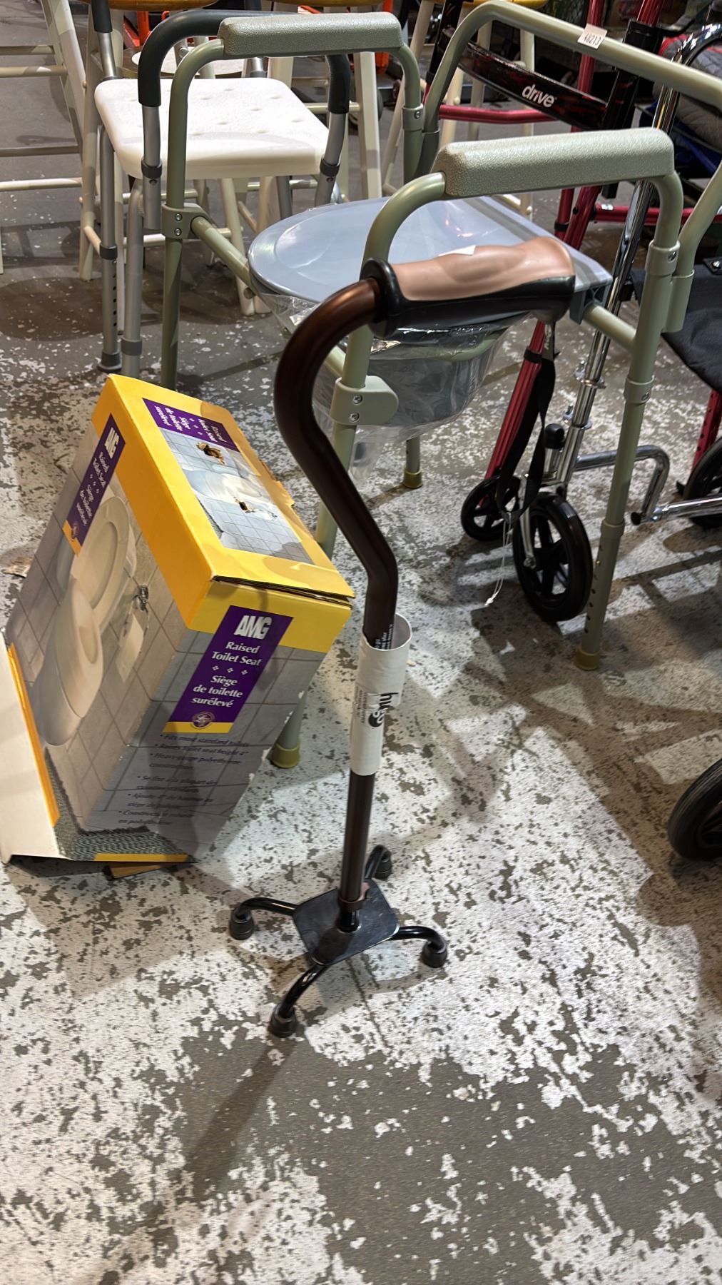 WALKERS, WHEELCHAIR, SHOWER SEAT, COMMODE CHAIR, CANE WITH QUAD BASE & RAISED TOILET SEAT
