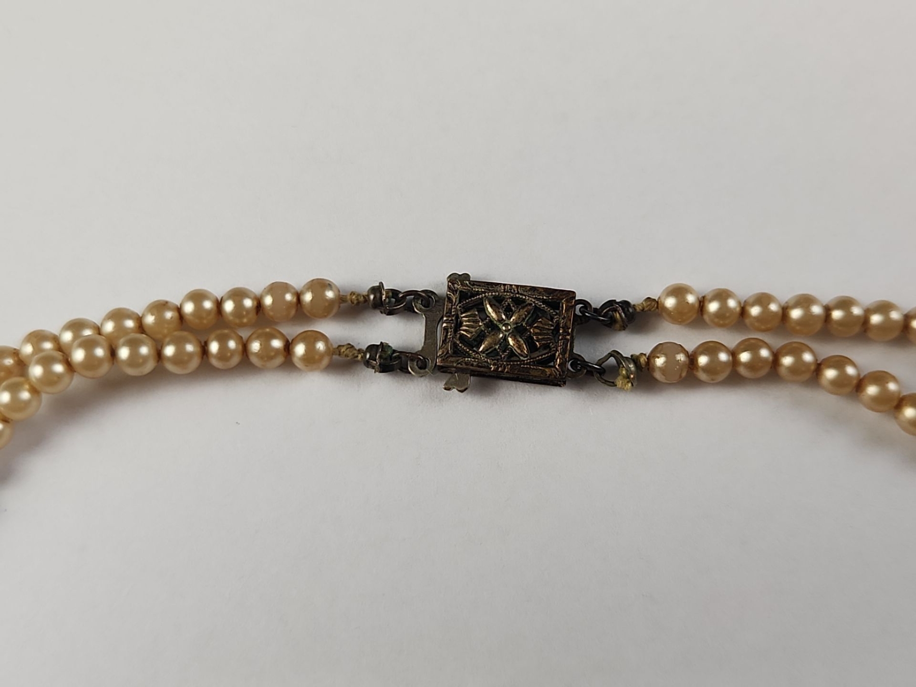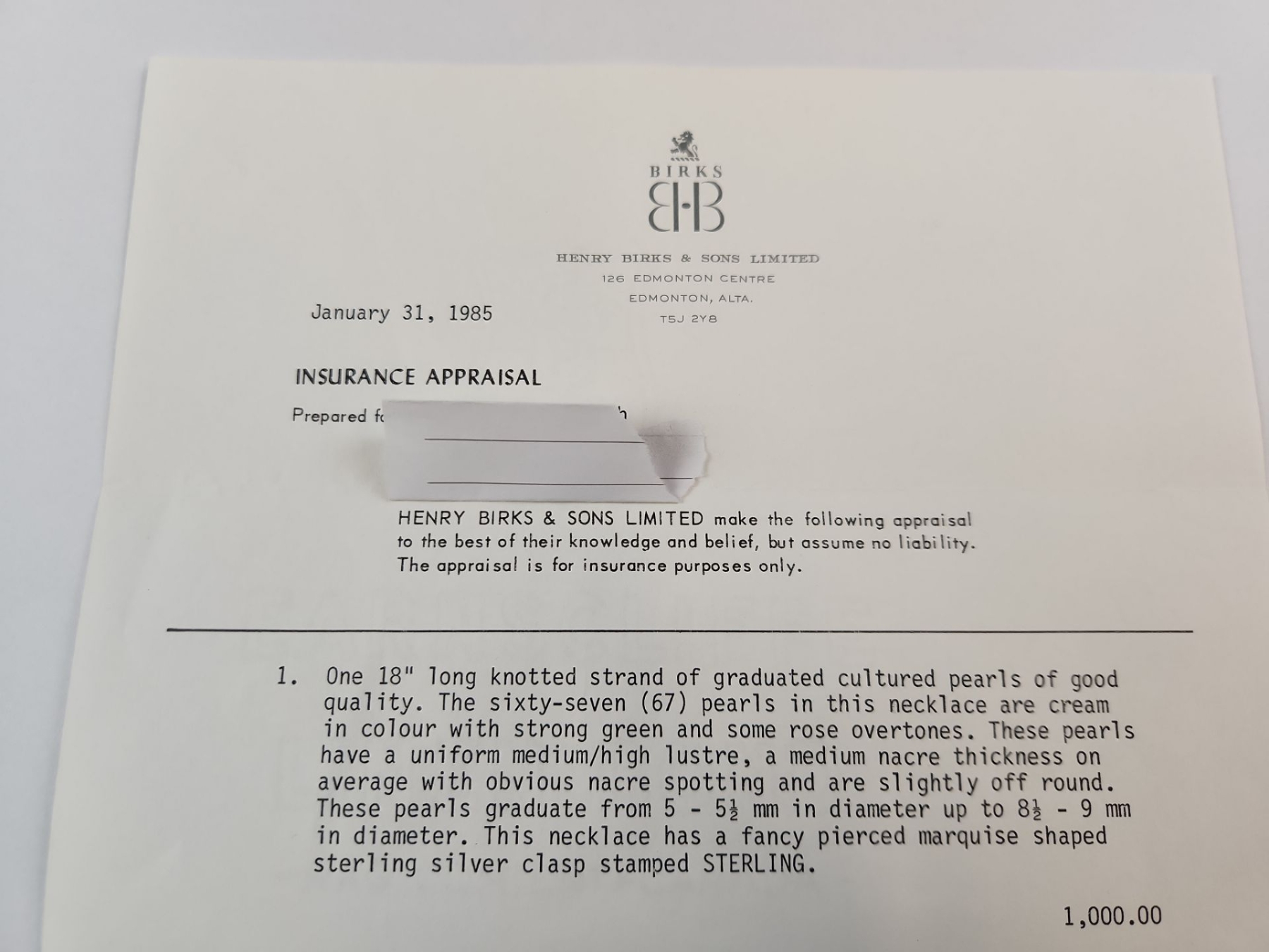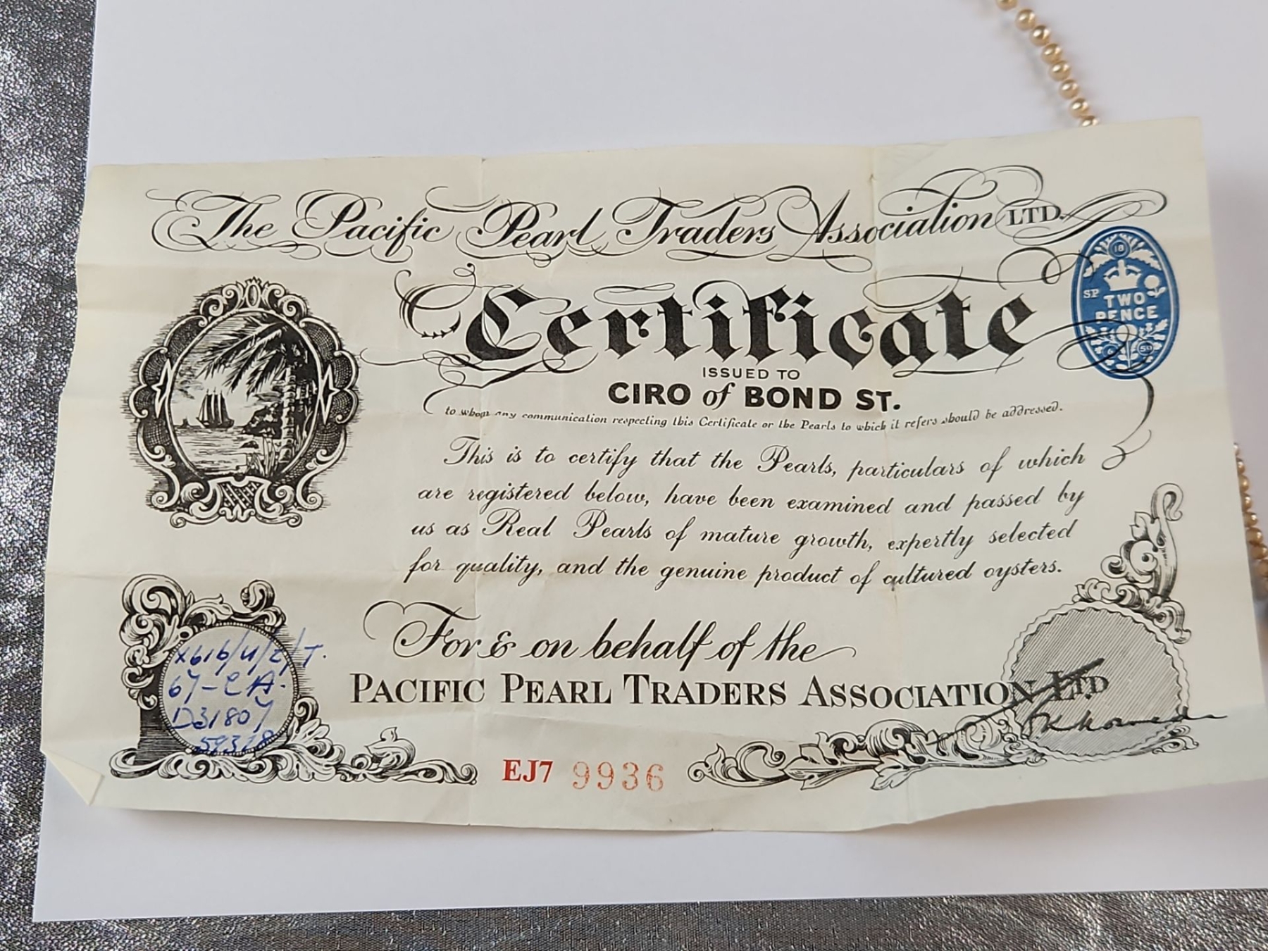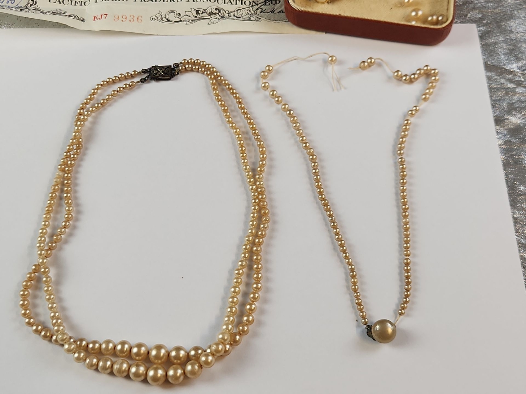 The set contains a double-strand necklace, a single-strand necklace, all cultured pearls. The included certificate confirms the items are genuine cultured pearls, expertly selected and verified by the association. Visible damage due to age. The stud pearl earrings are designer costume accessories
