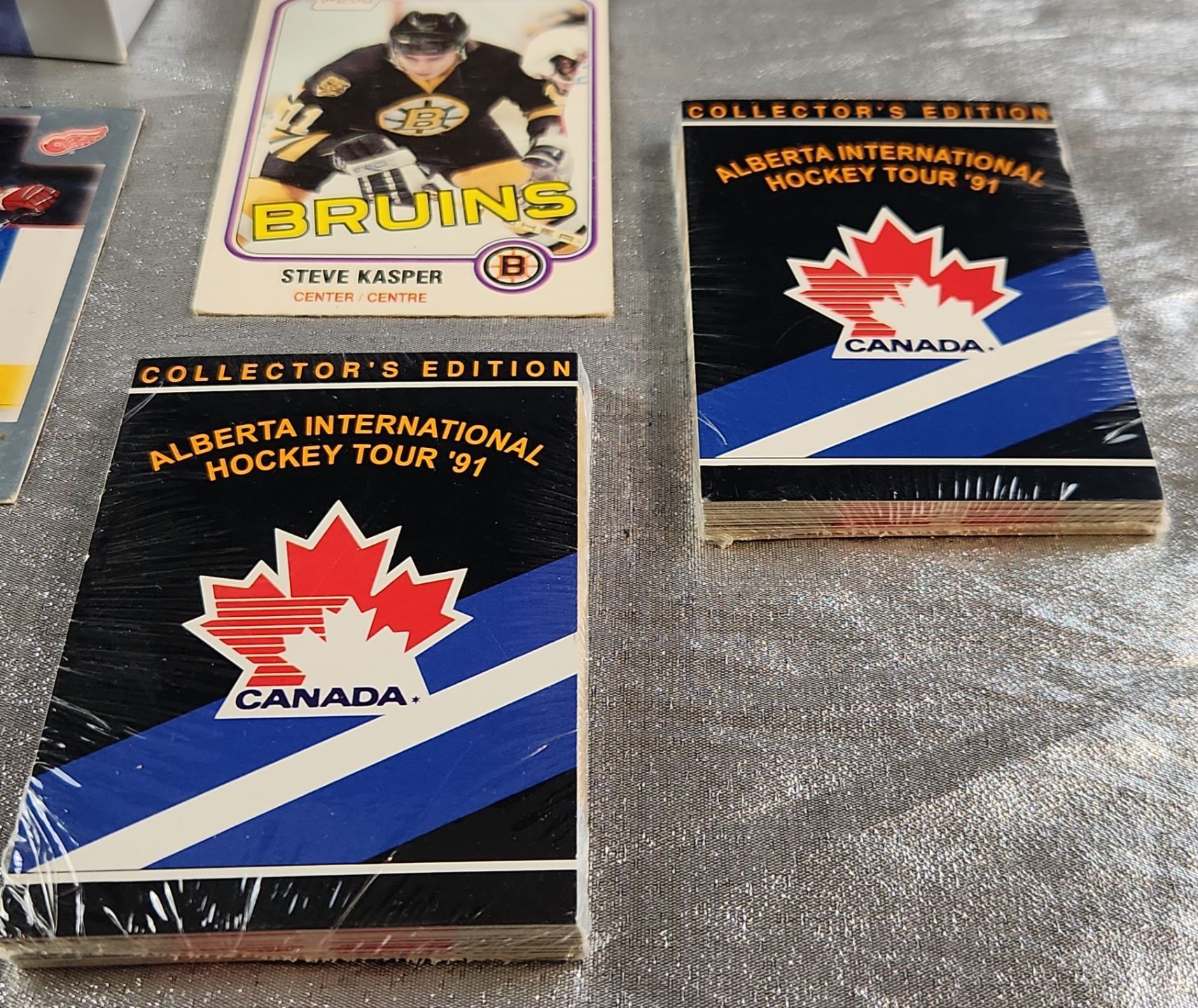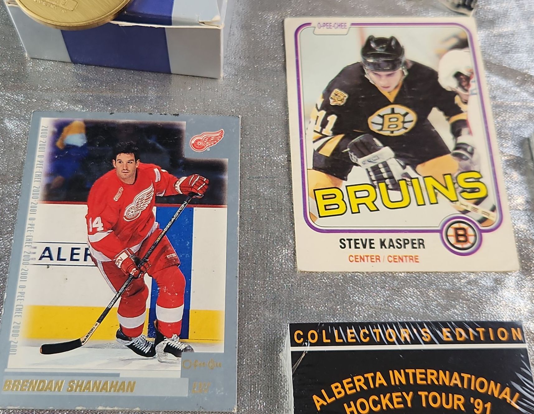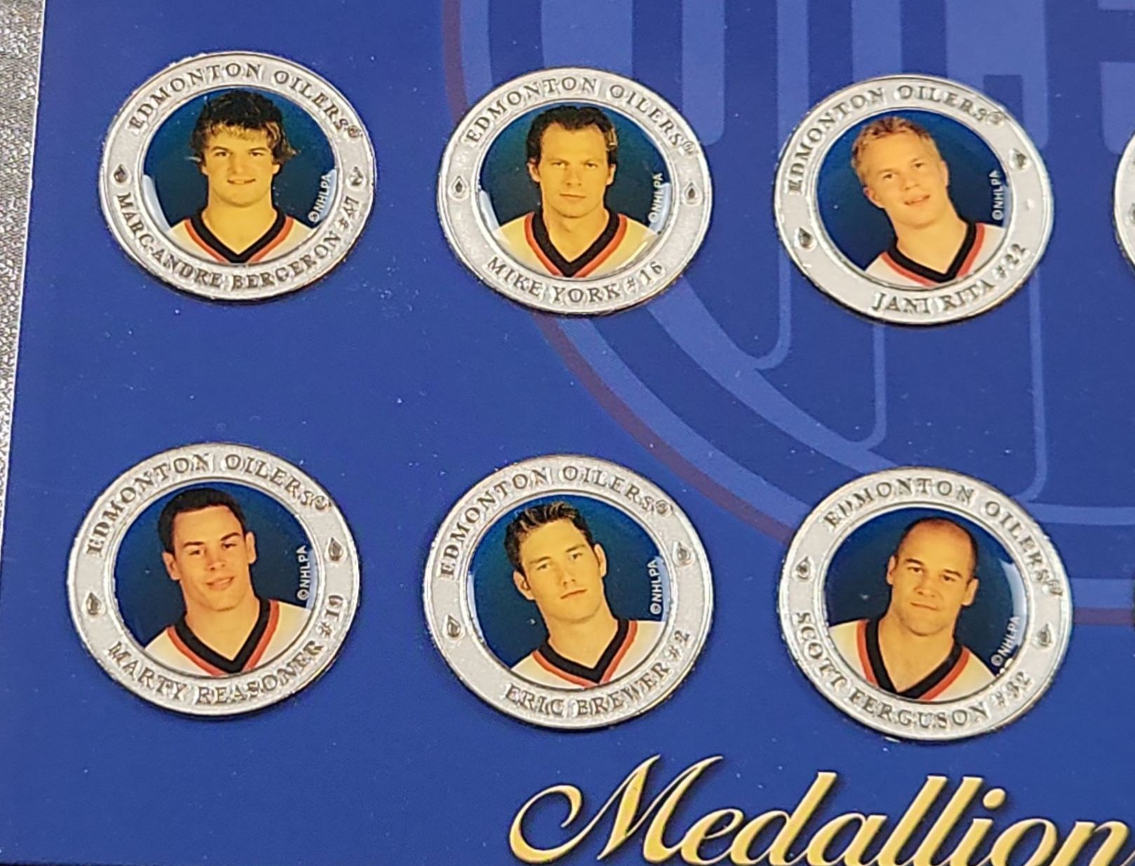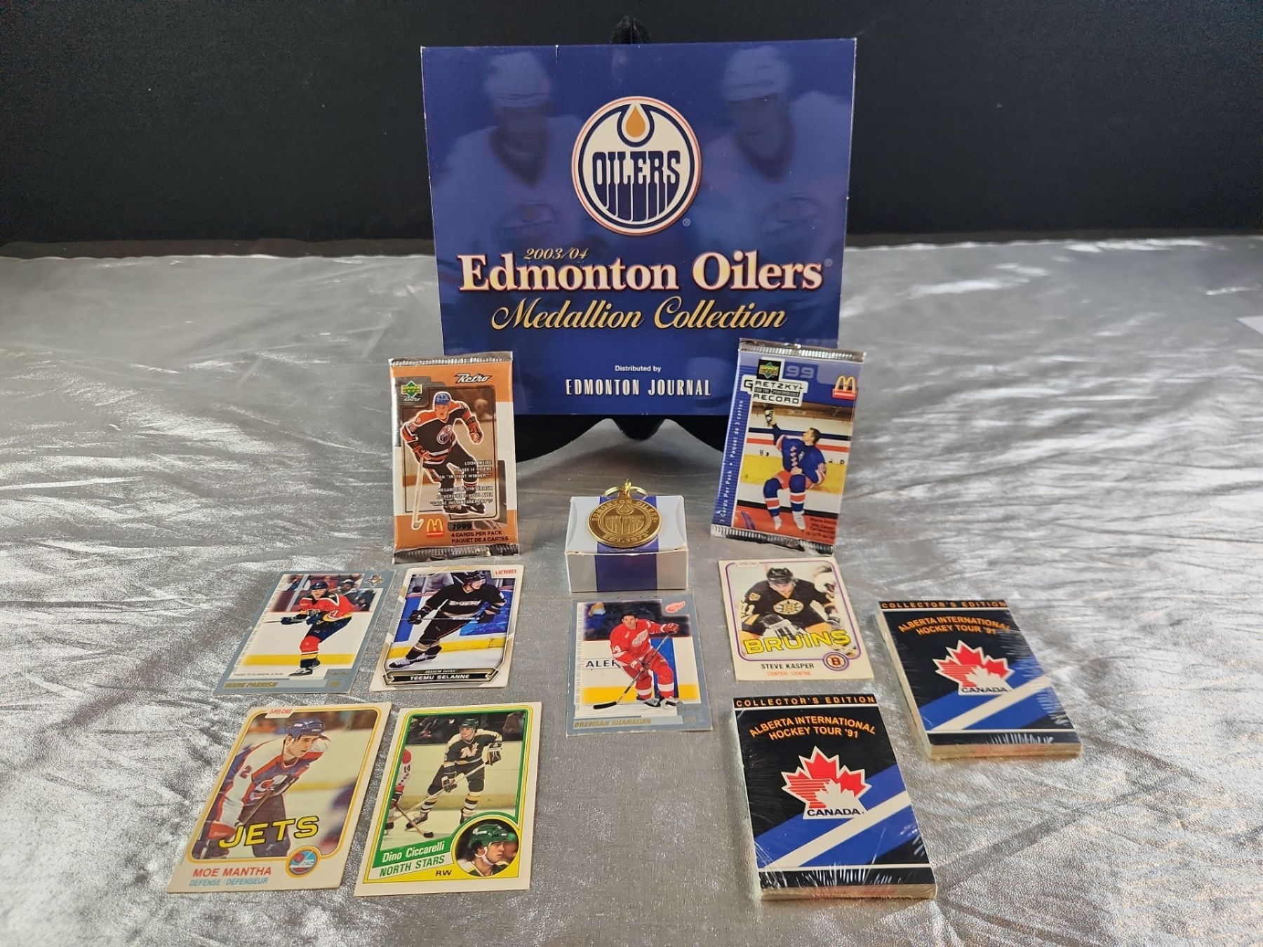 Collection of vintage Edmonton Oilers memorabilia, featuring the 2003/04 Medallion Collection. This set includes a medallion, trading cards and sealed packs, from the early 1990's featuring players like Wayne Gretzky (Oilers), Steve Kasper (Bruins) and Moe Mantha (Jets)
