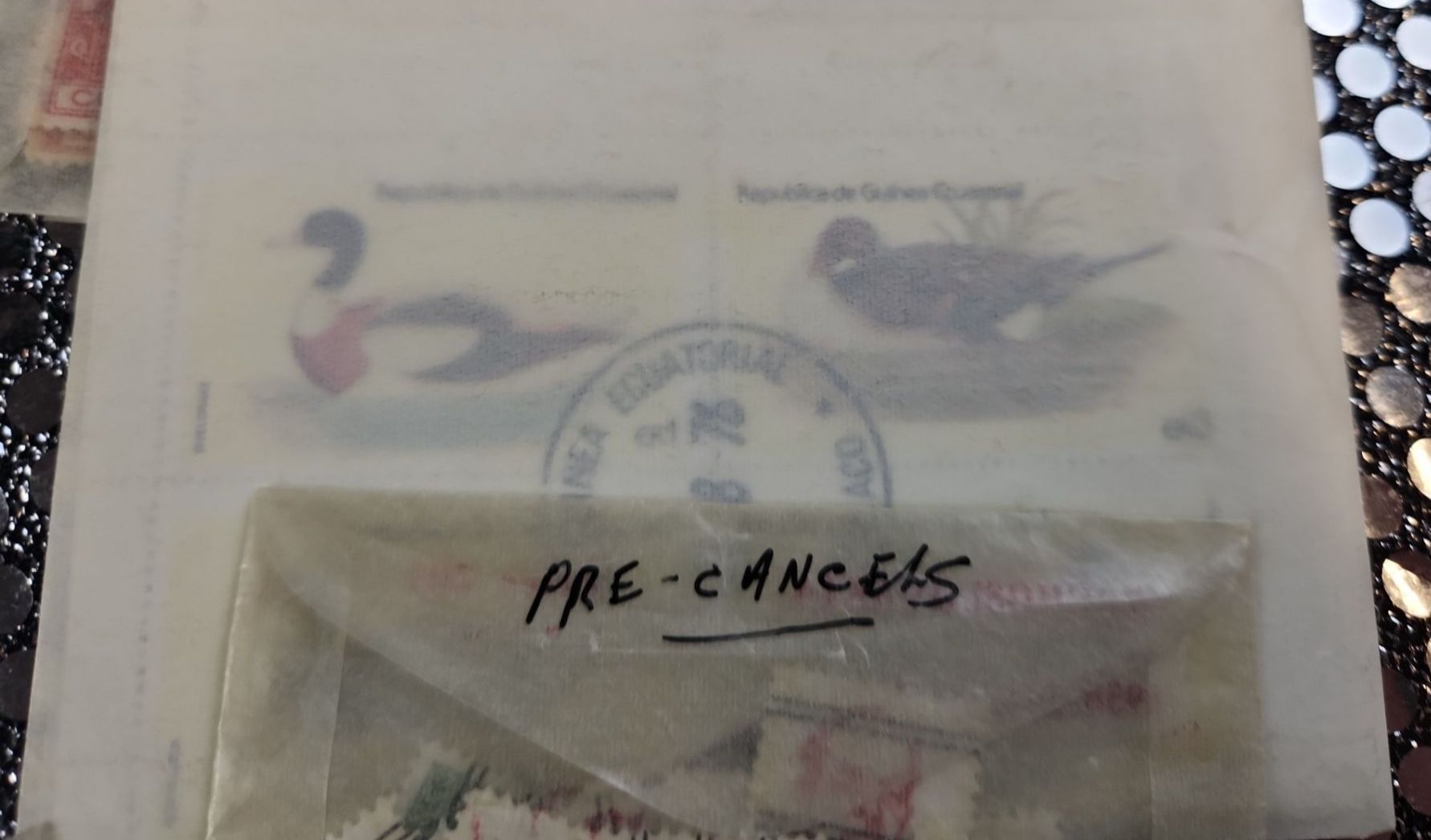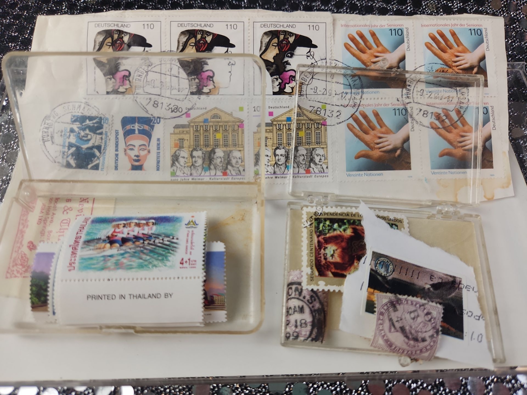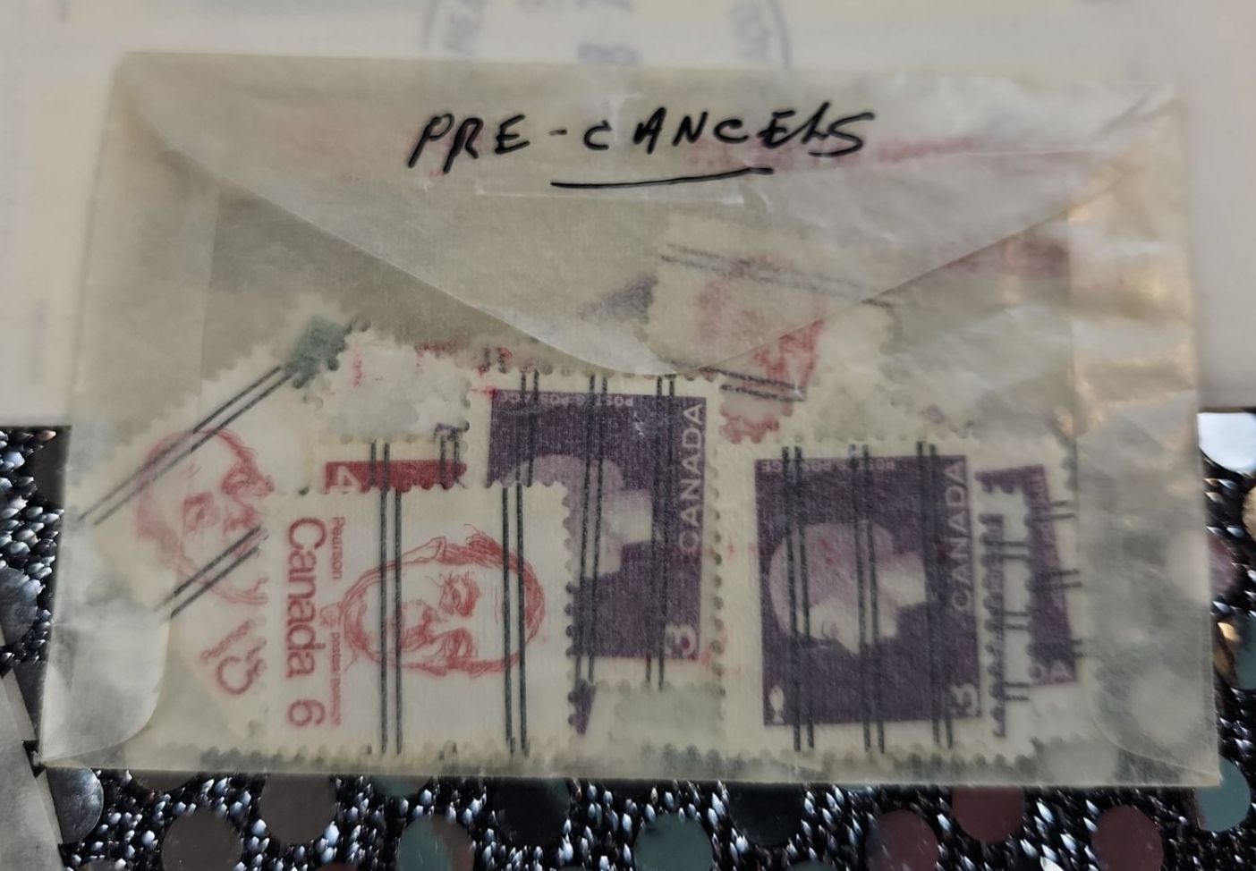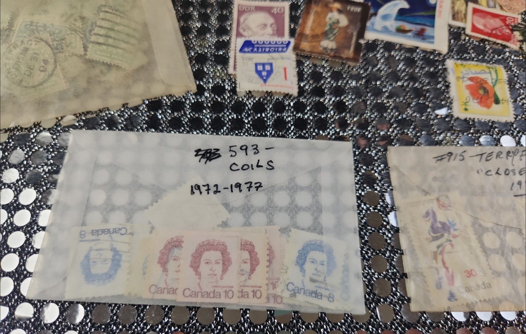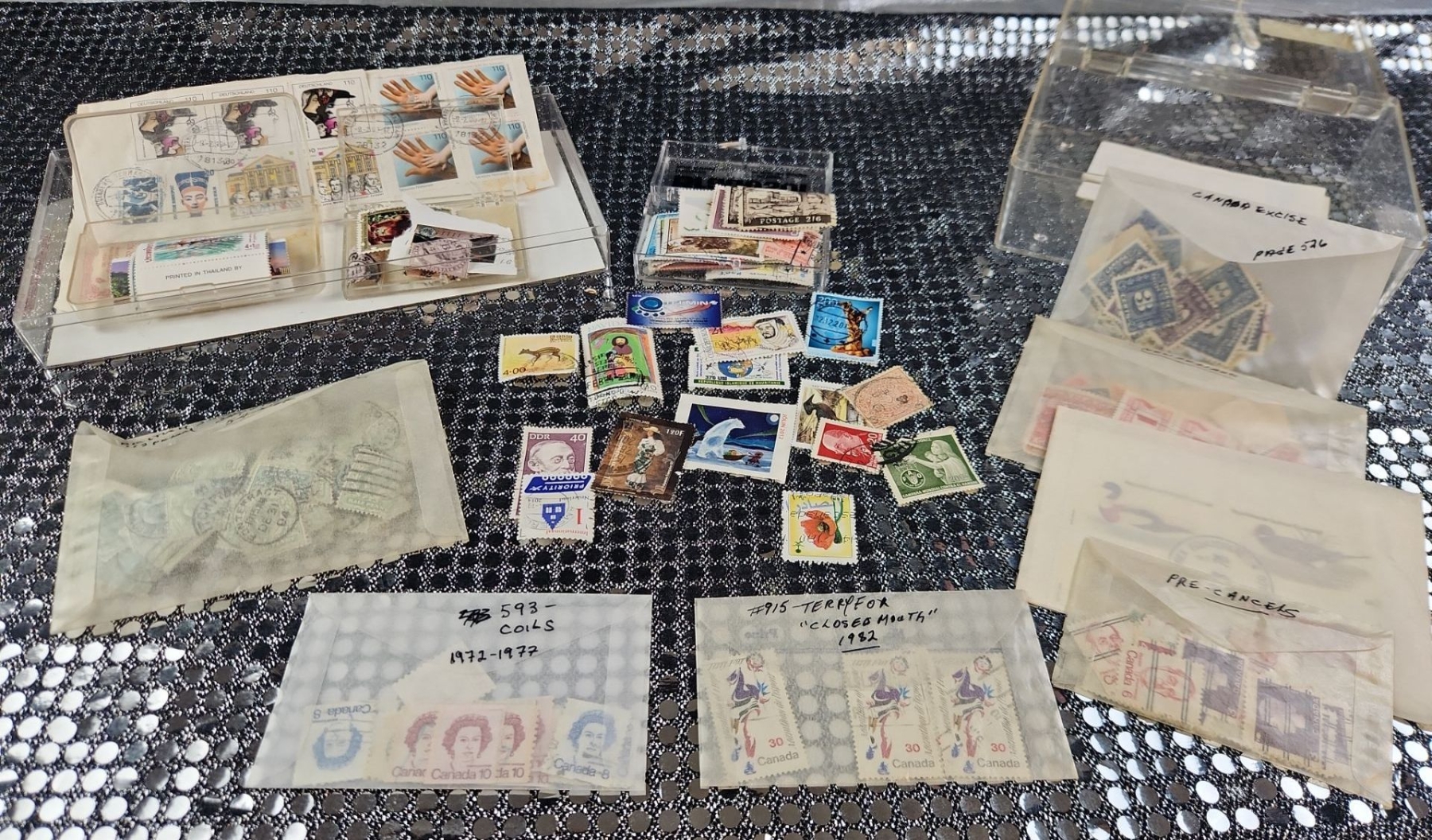This collection of International postage stamps features mint and used stamps, likely dating from the 1960's and later. Specific stamps include Terry Fox issue from 1982 and various "pre-cancel" stamps. They are organized in protective sleeves and plastic containers.