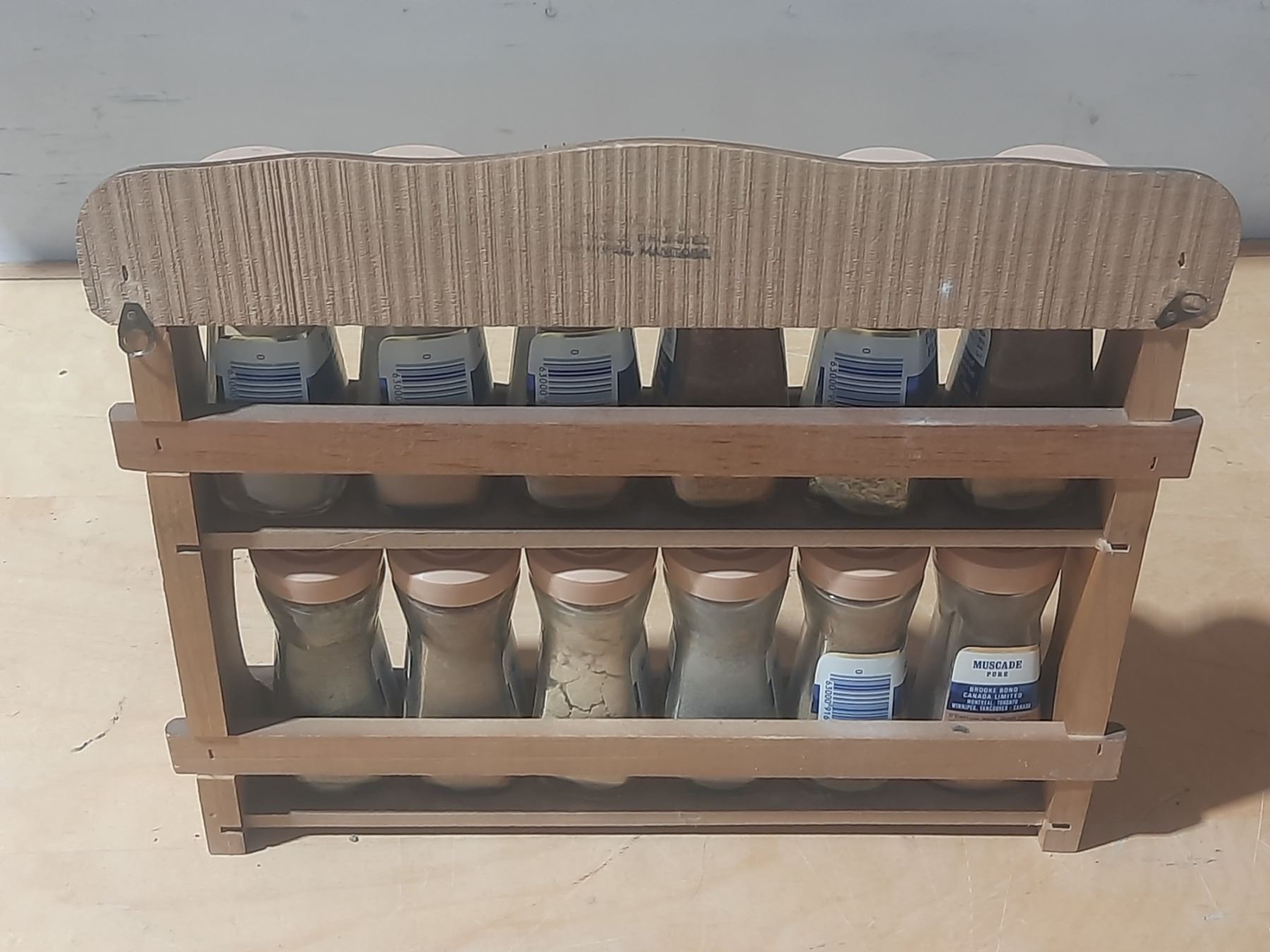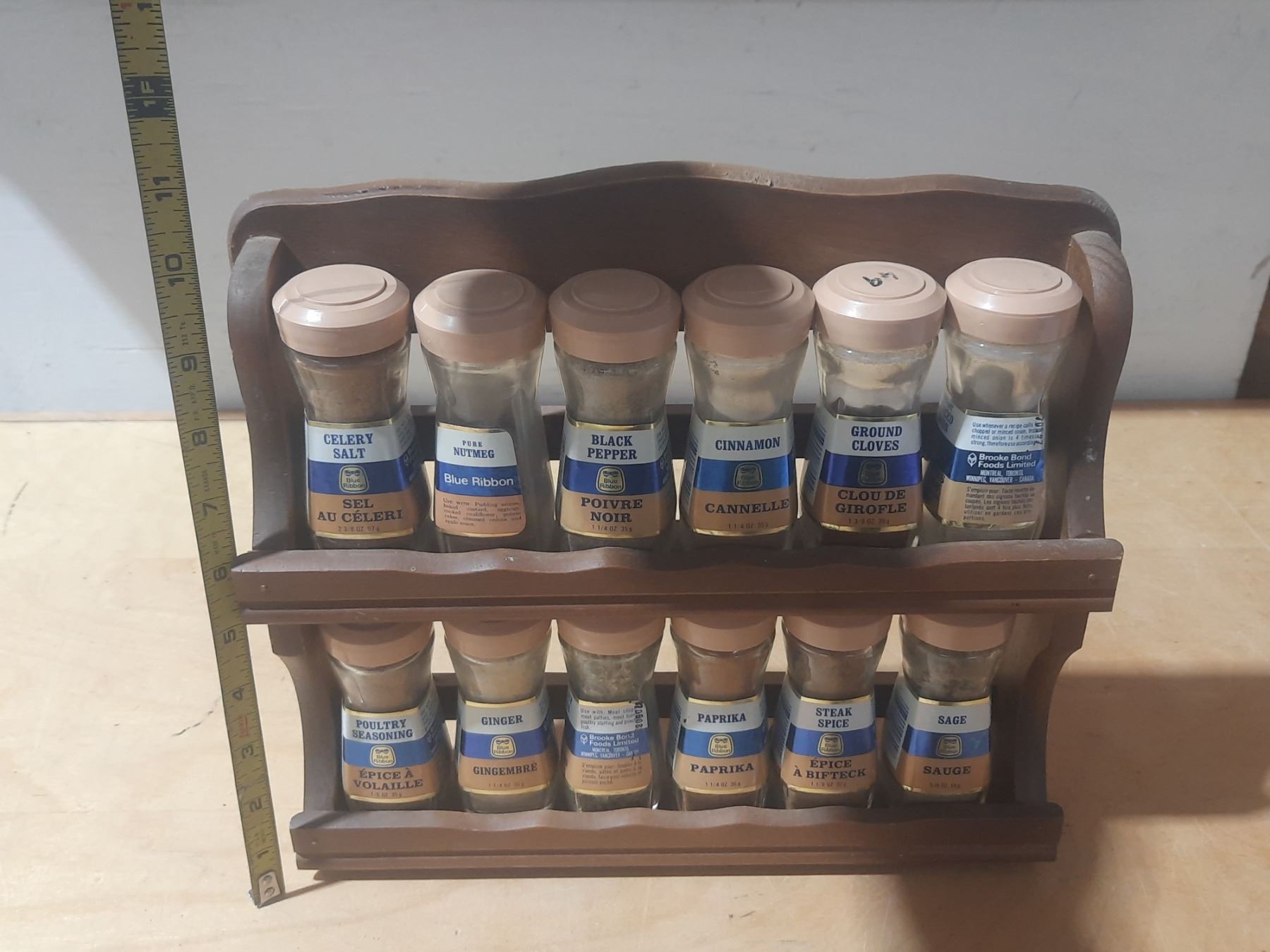 Lot 1369 Vintage Blue Ribbon wooden spice rack featuring 12 glass spice jars with spice. (One is Empty)