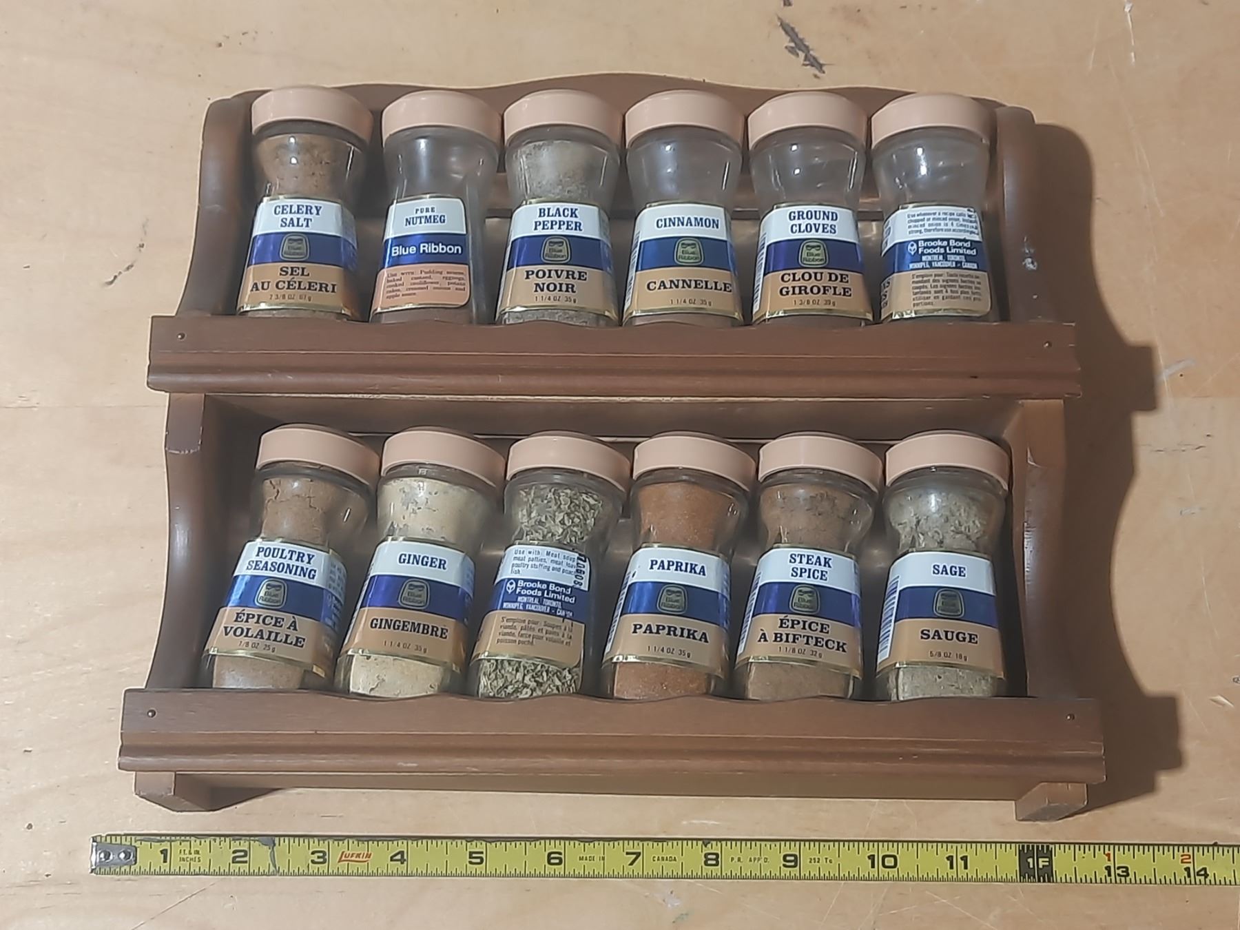 Vintage Blue Ribbon wooden spice rack featuring 12 glass spice jars with spice. (One is Empty)