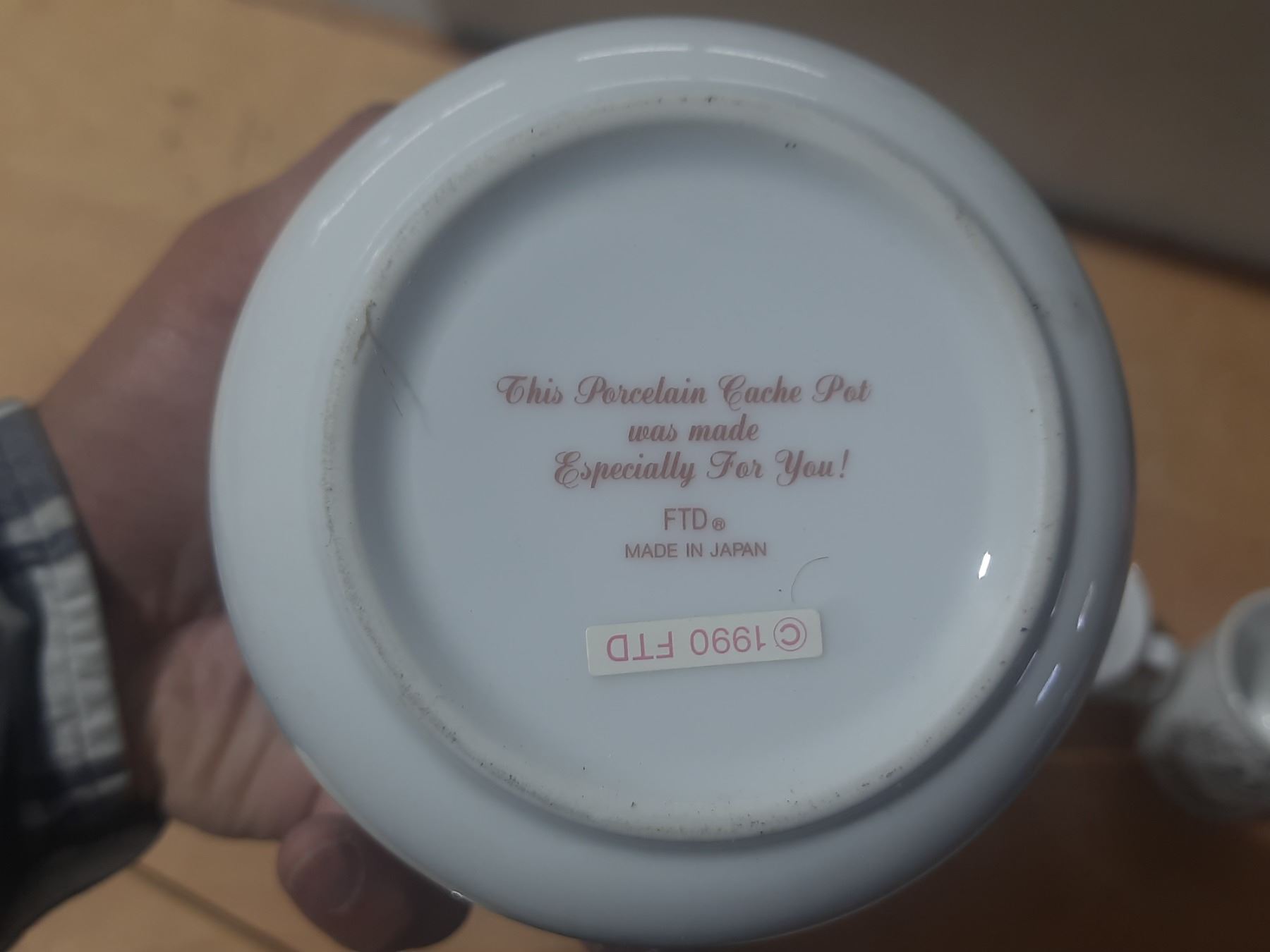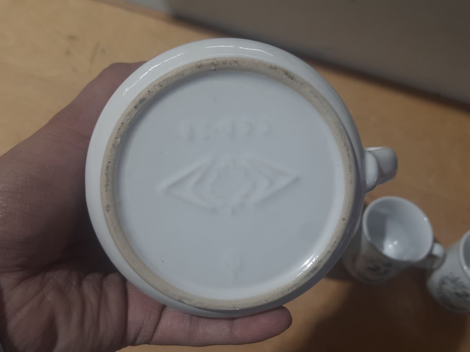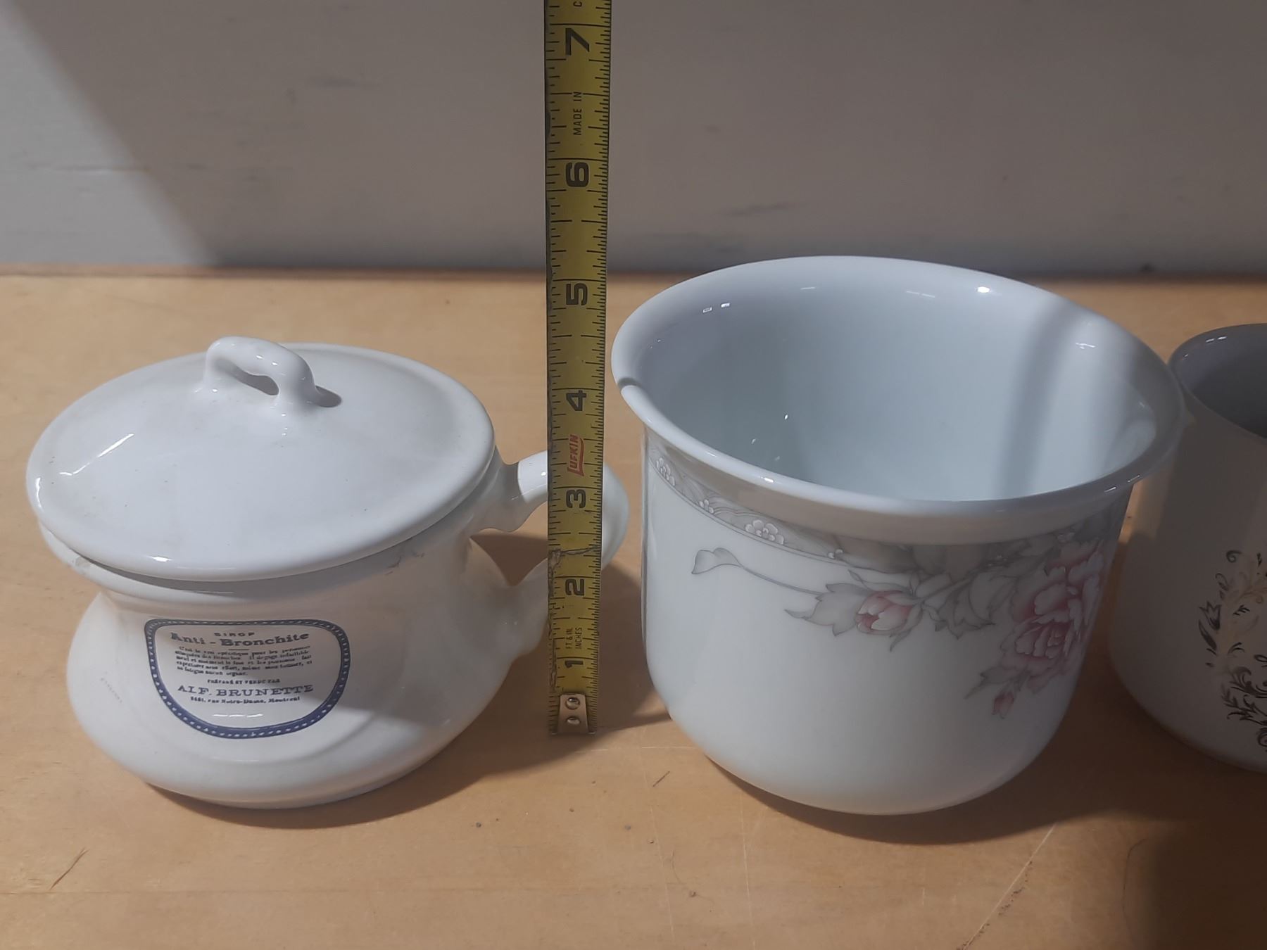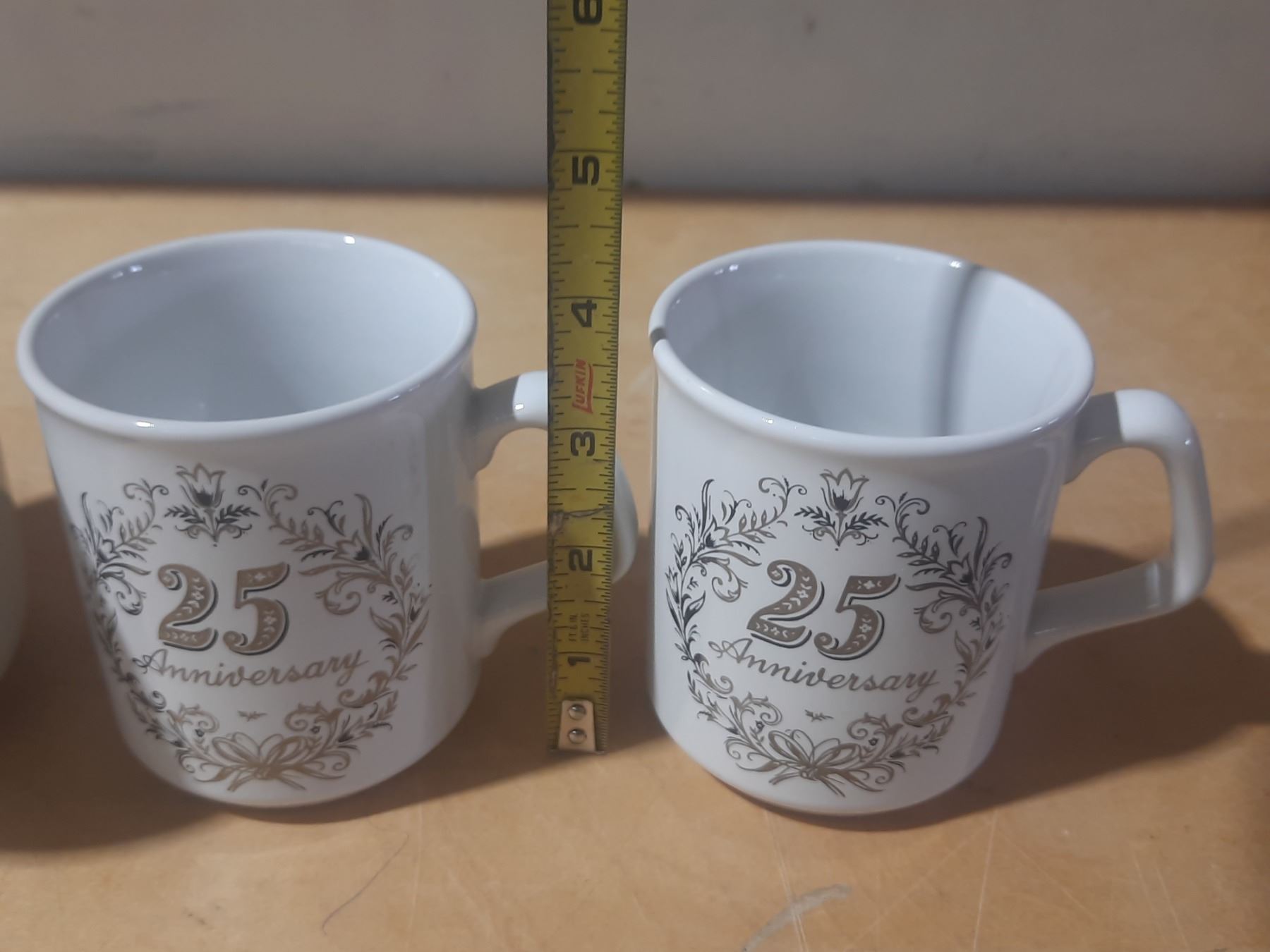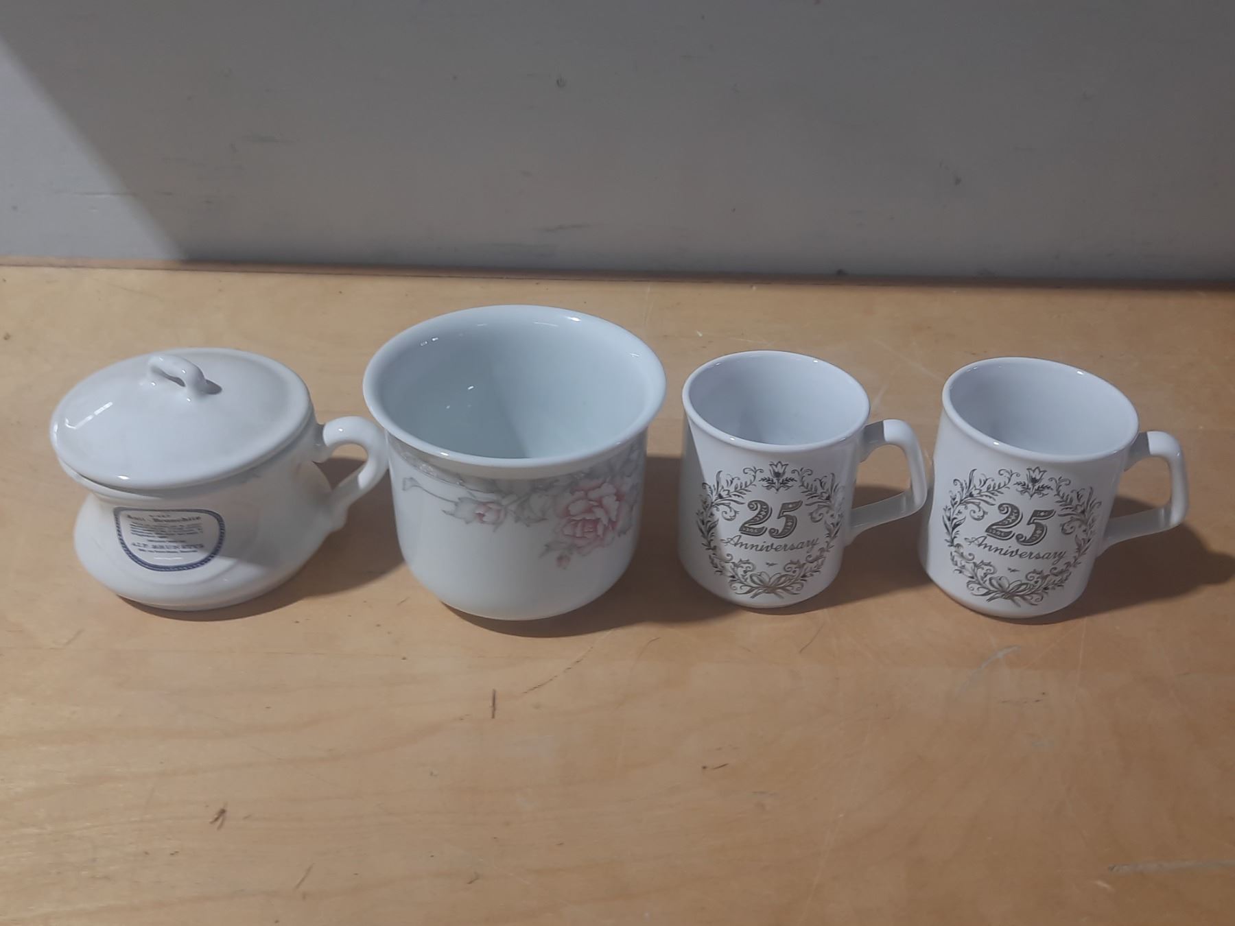 Vintage porcelain pieces, featuring a covered dish and two mugs celebrating a 25th anniversary.