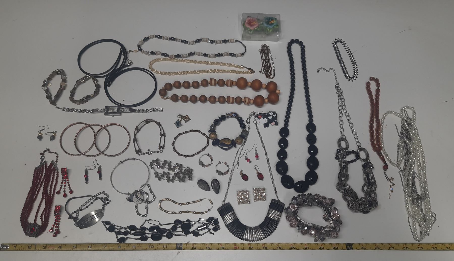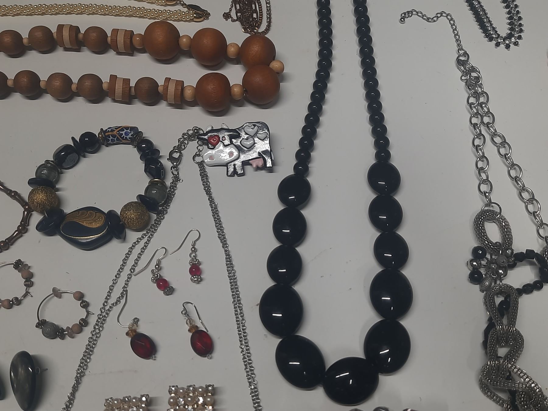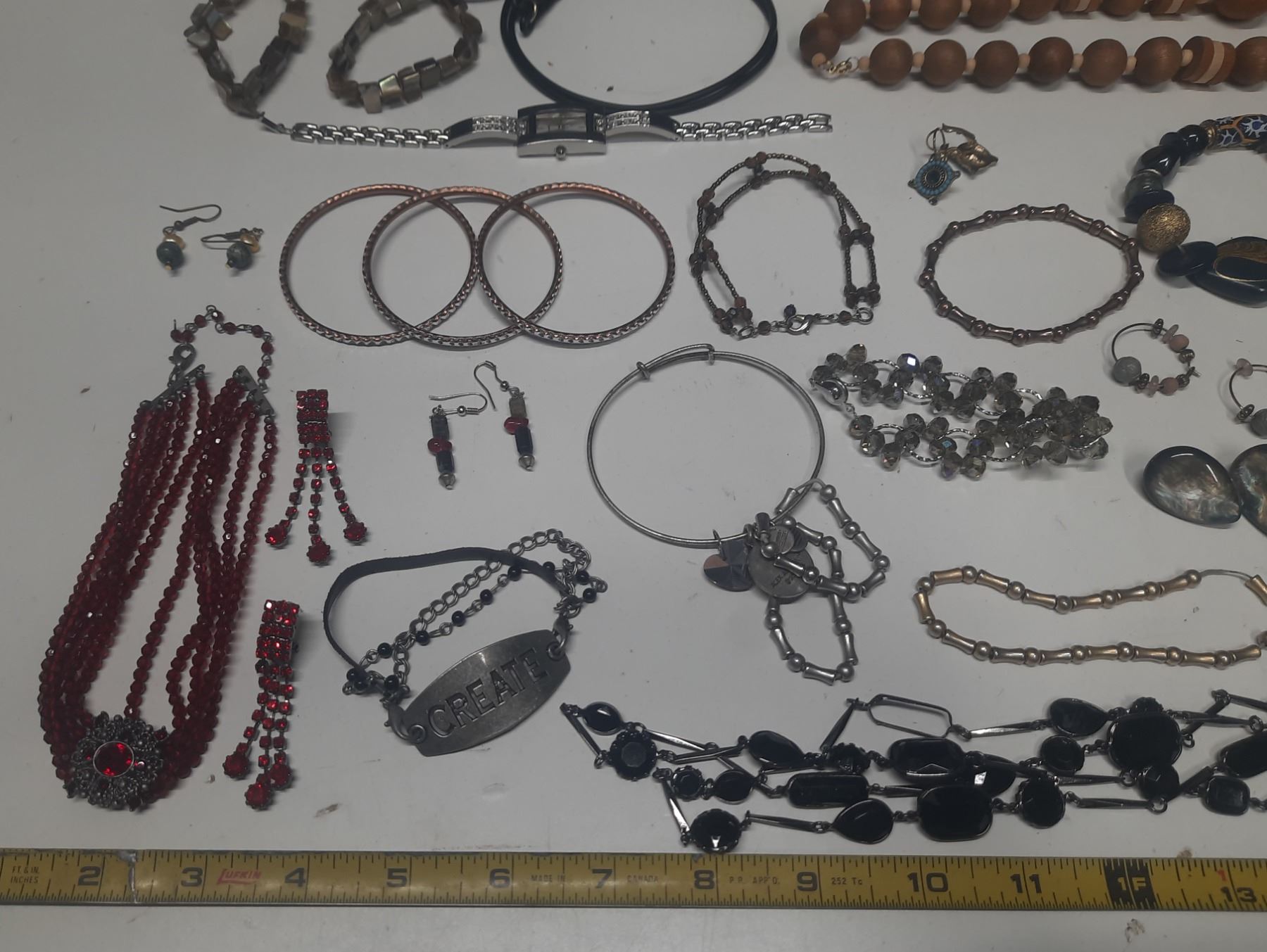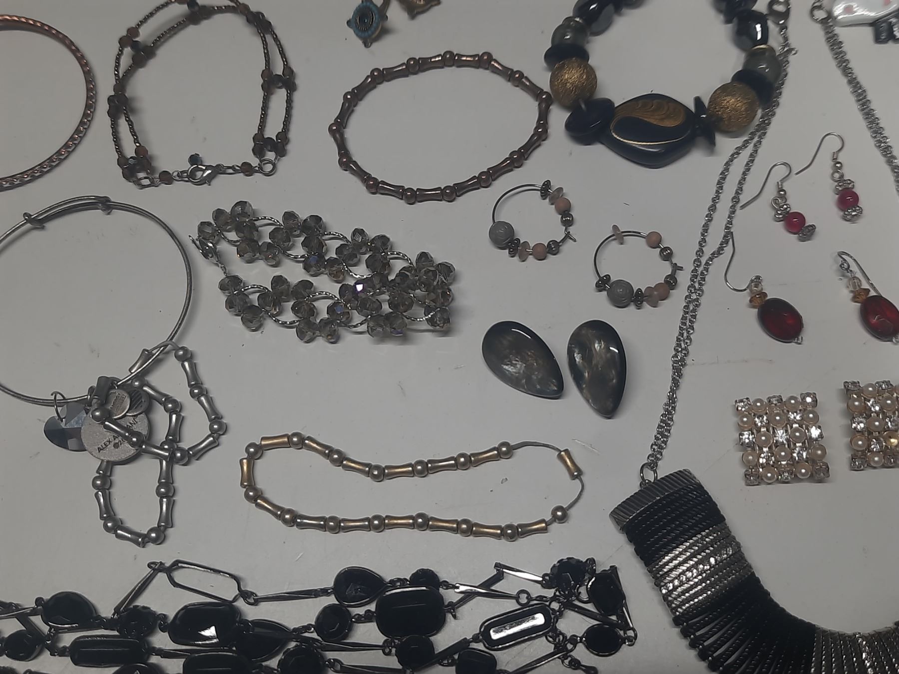 Vintage costume jewelry, including a variety of bracelets, earrings, and necklaces.