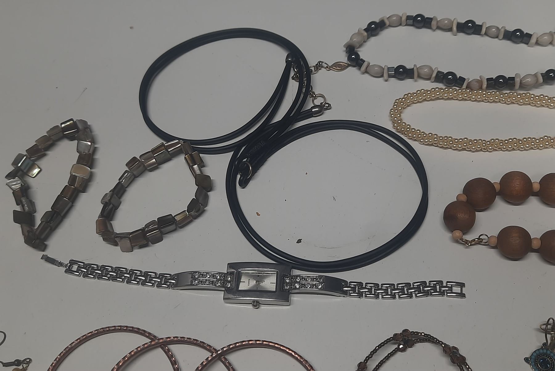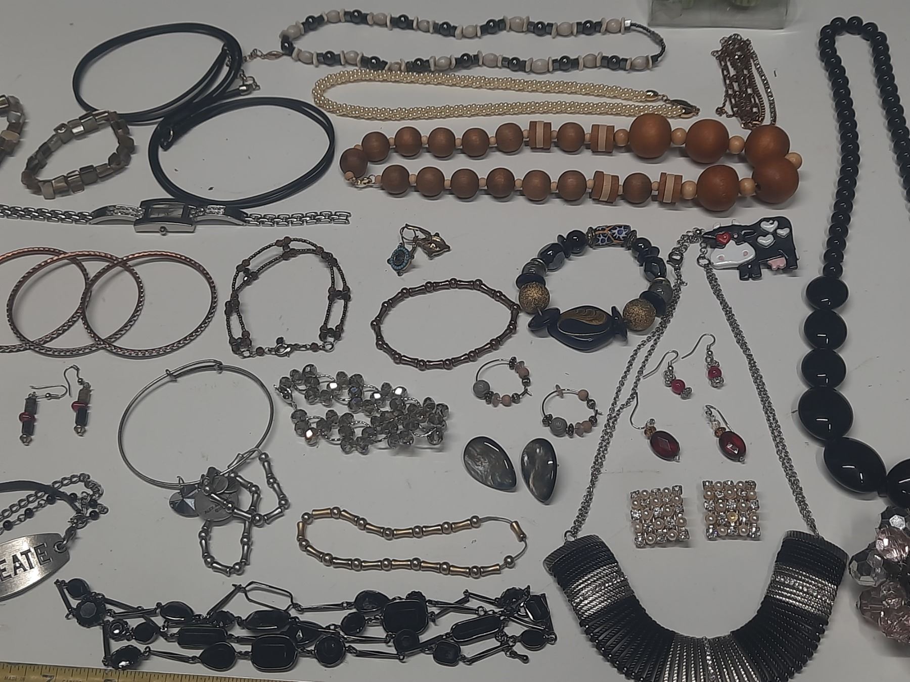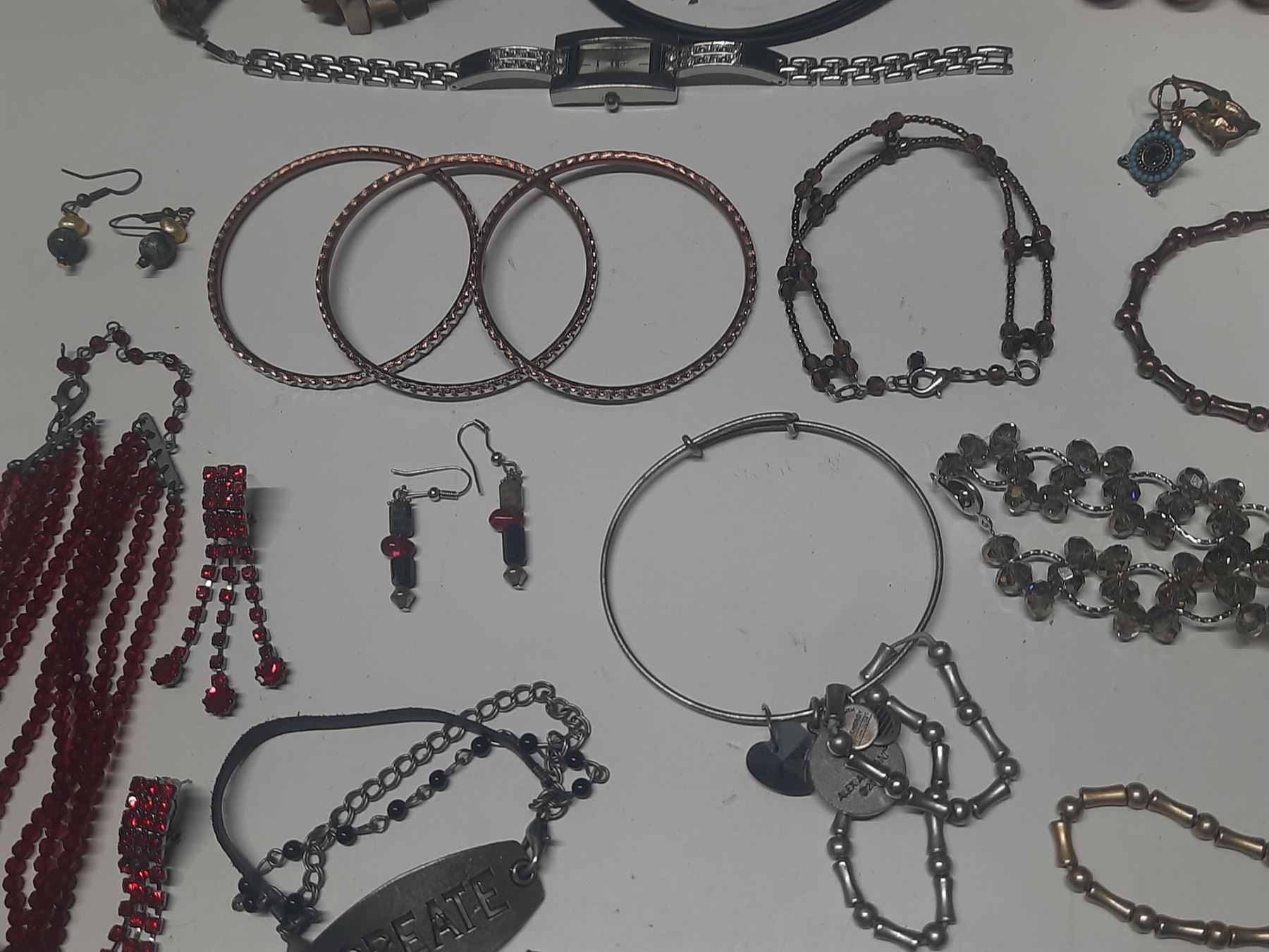 Vintage costume jewelry, including a variety of bracelets, earrings, and necklaces.