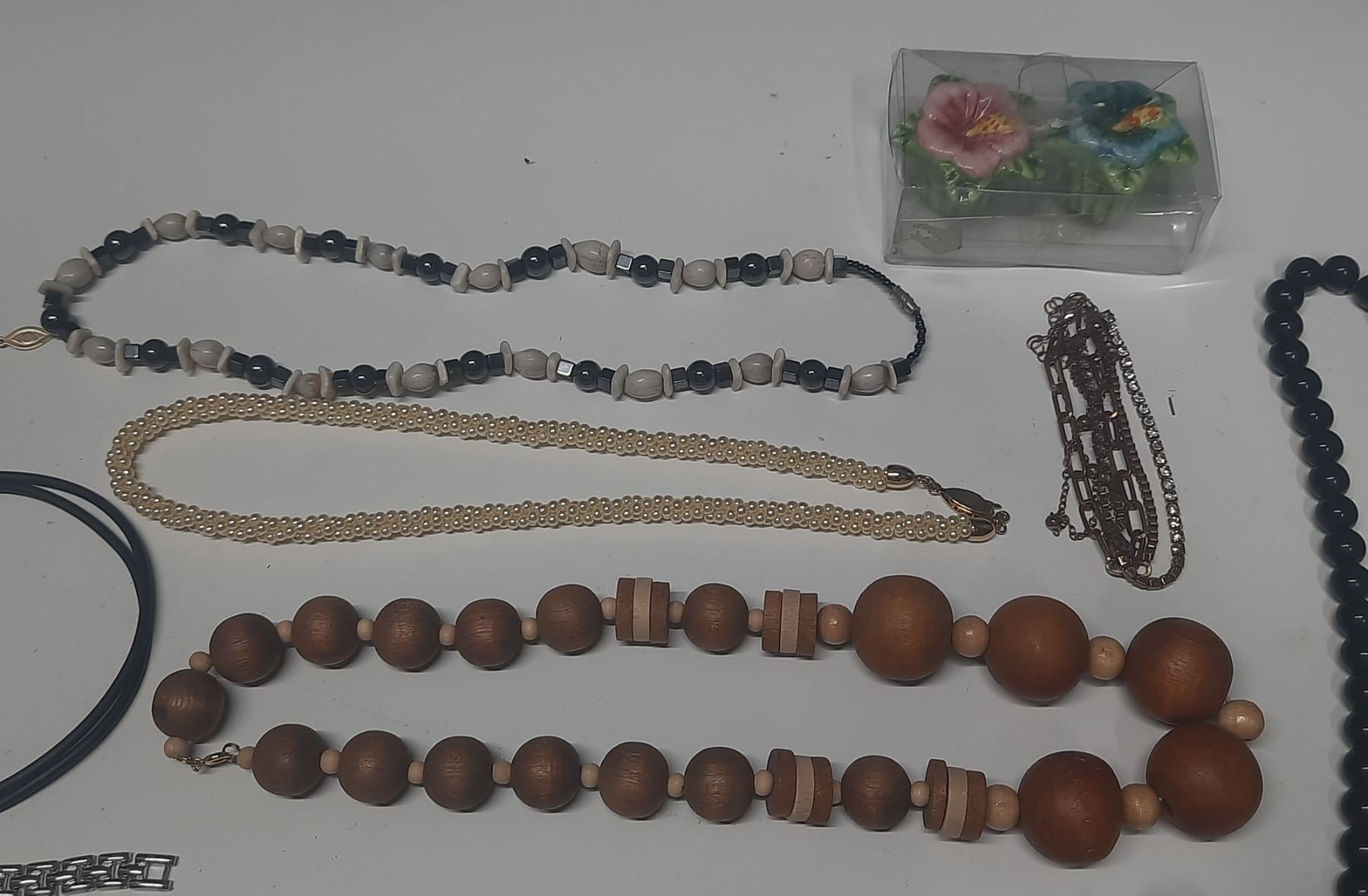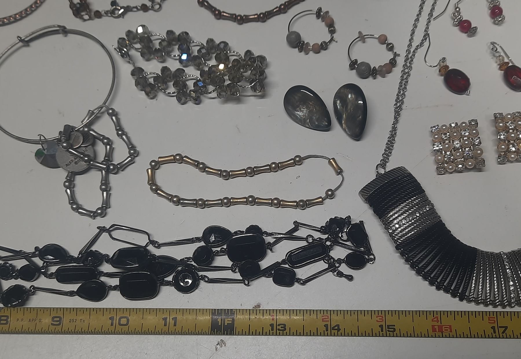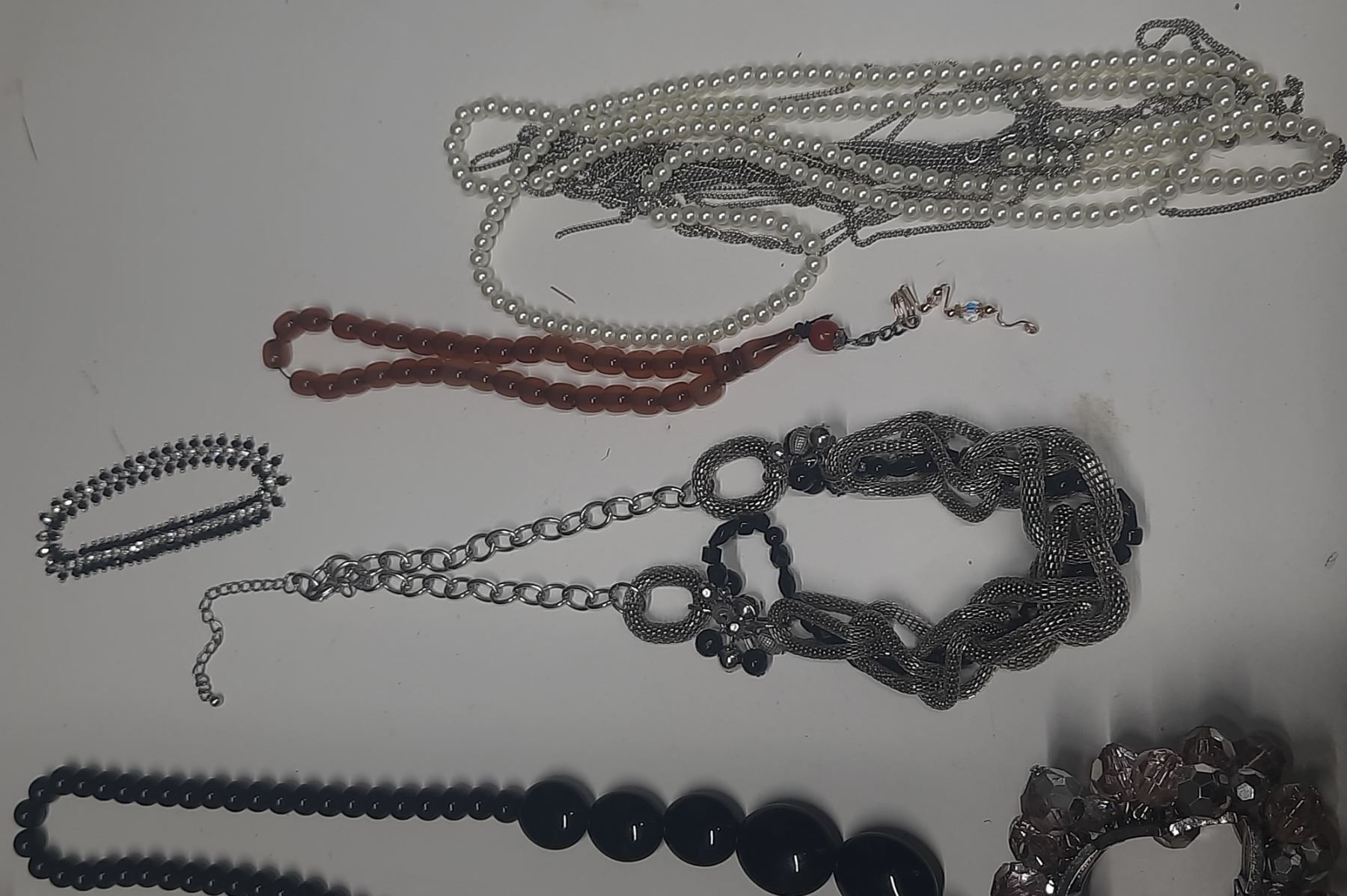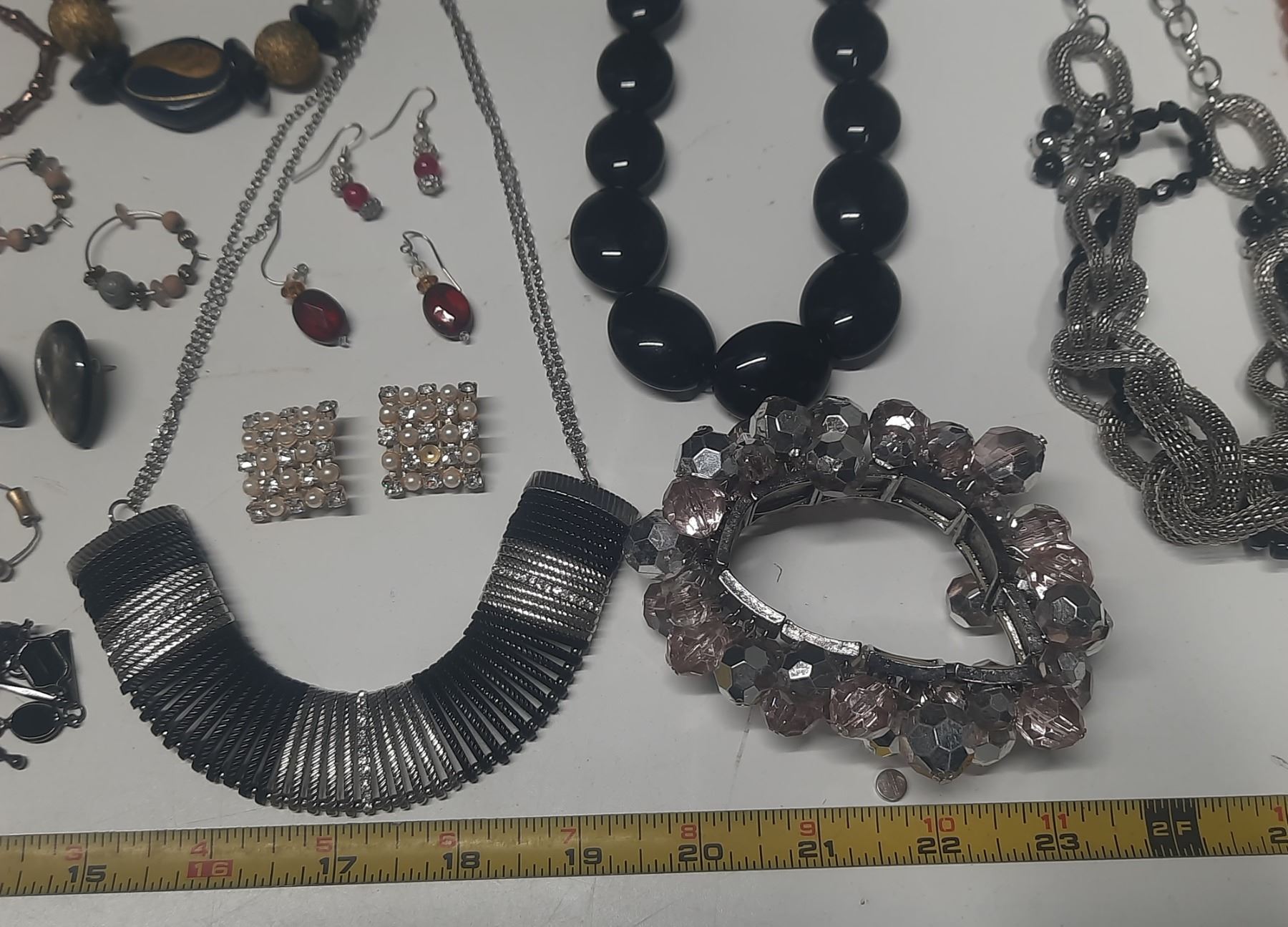 Vintage costume jewelry, including a variety of bracelets, earrings, and necklaces.
