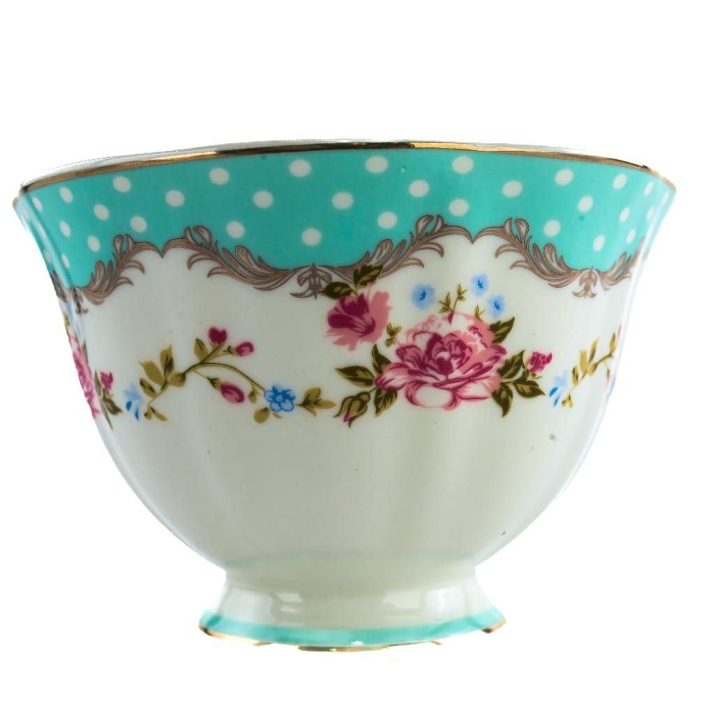 Charming vintage tea set featuring five cups and five matching saucers in a romantic floral pattern. Each piece has a turquoise band with white polka dots, pink rose bouquets with small blue accents, and gold-toned trim along the rim and edges. The saucers have a scalloped shape with a centered rose medallion and decorative scrollwork, giving the set a classic, elegant lookÑperfect for afternoon tea, display, or a vintage-inspired table setting. Pre-owned condition with light surface wear consistent with age; no obvious chips or cracks visible in the provided photos. Ð A8538