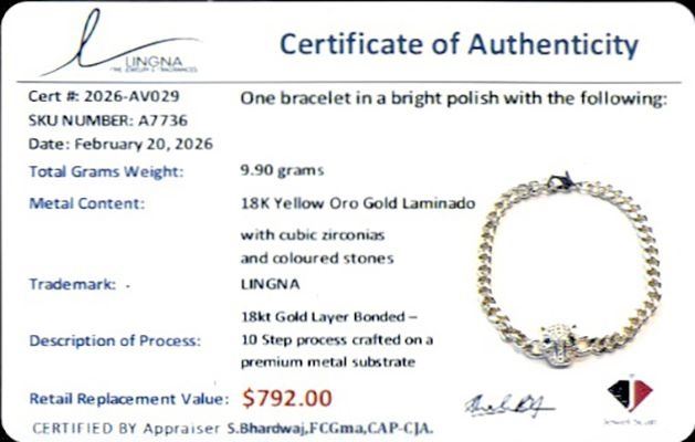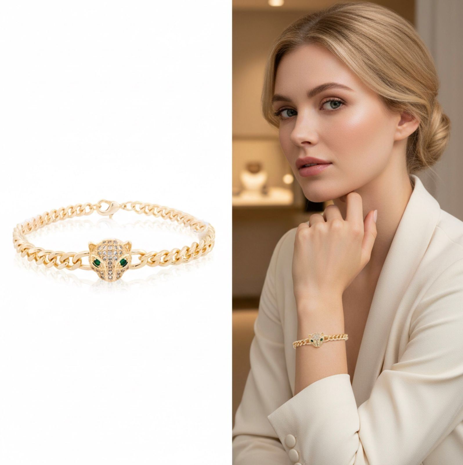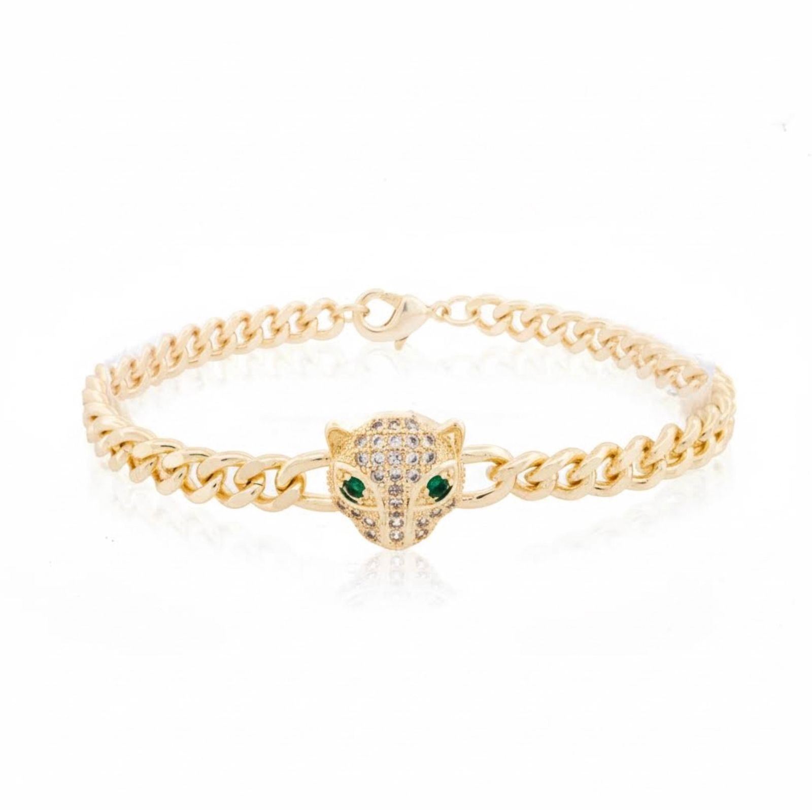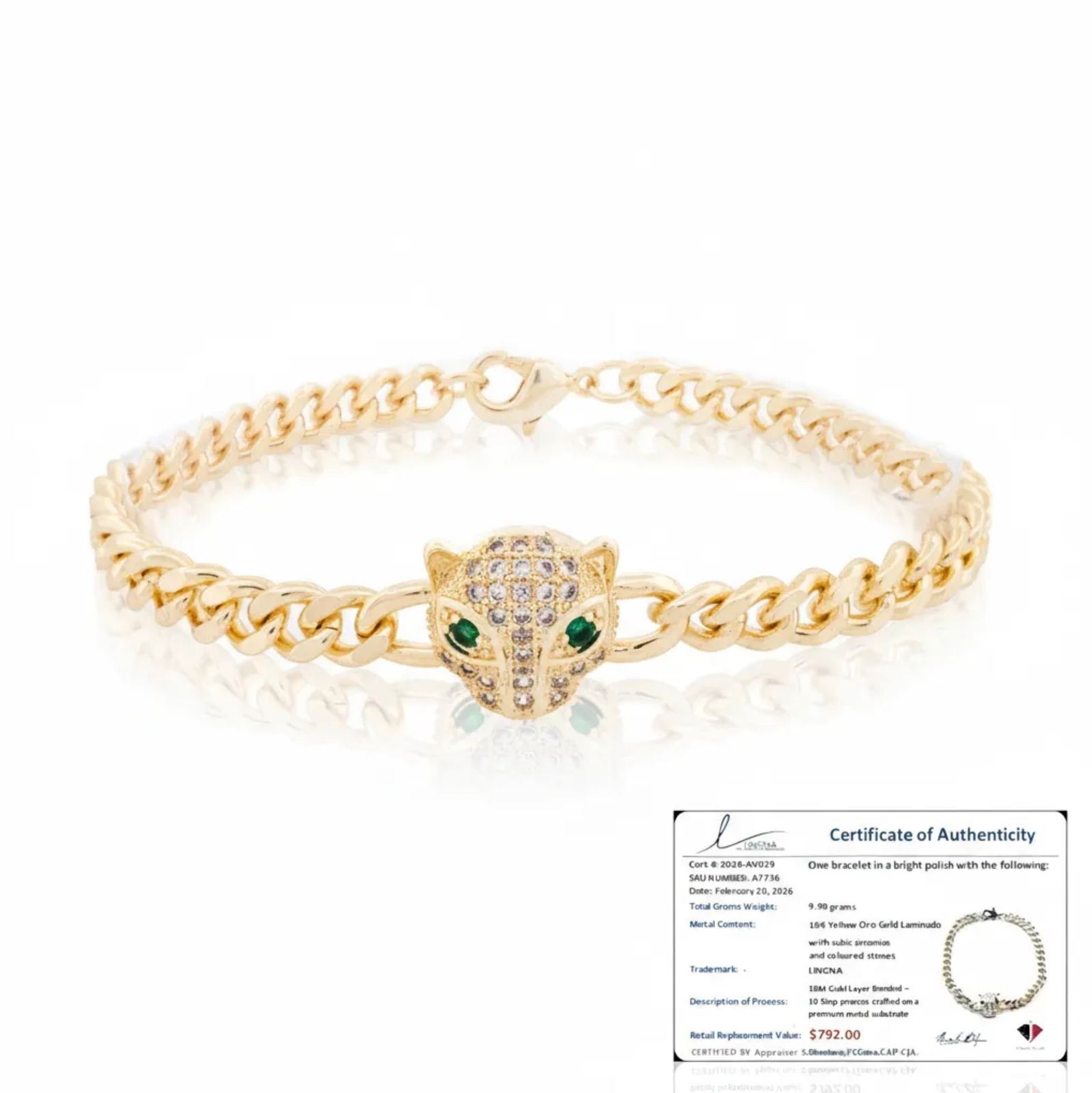 18kt Gold-Overlay Oro Laminado Panther Head Bracelet, fully Micro-PavŽ hand-set with emerald-green eyes on a Cuban link chain, secured with a lobster-claw clasp. COA.RRV:$792.00 Ð A7736