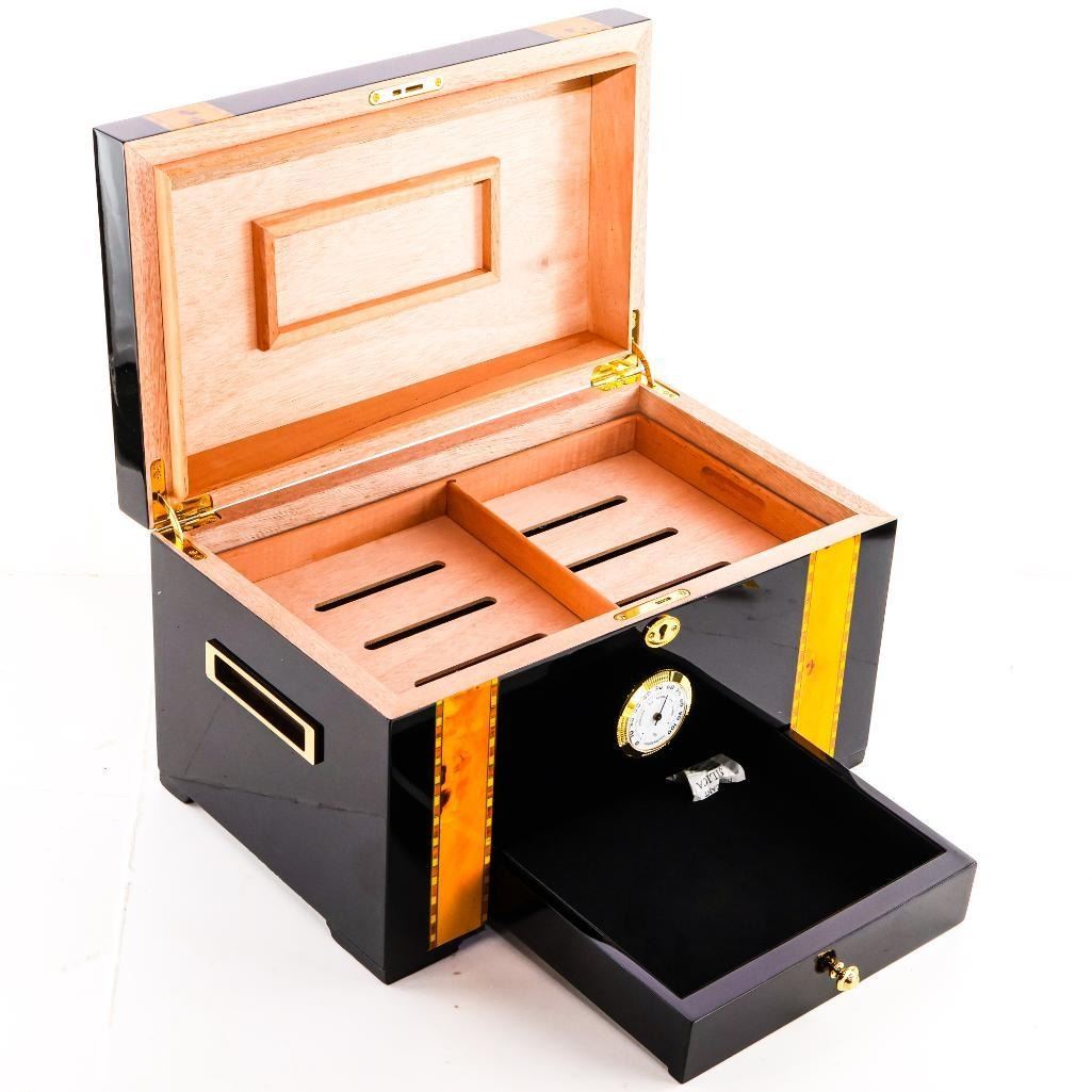 Elevate your collection with this distinguished multi-category offering, centered around an Executive 150-Count Cigar Humidor finished in a rich piano high-polish lacquer, designed to preserve and present cigars with sophistication and precision.