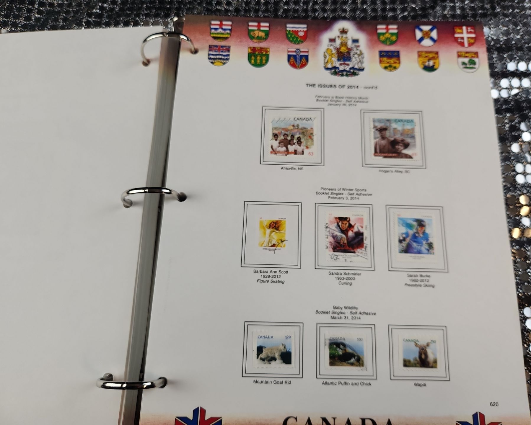 This item lot is a 2 binder collection of Canadian philatelic collectibles, containing First Day Covers (FDCs) from Canada Post, which are envelopes featuring postage stamps, cancelled on their first day of release. These covers depict various scenes related to Canadian history and culture, Canadian wildlife and commemorative stamps. Housed in protective plastic sheets.