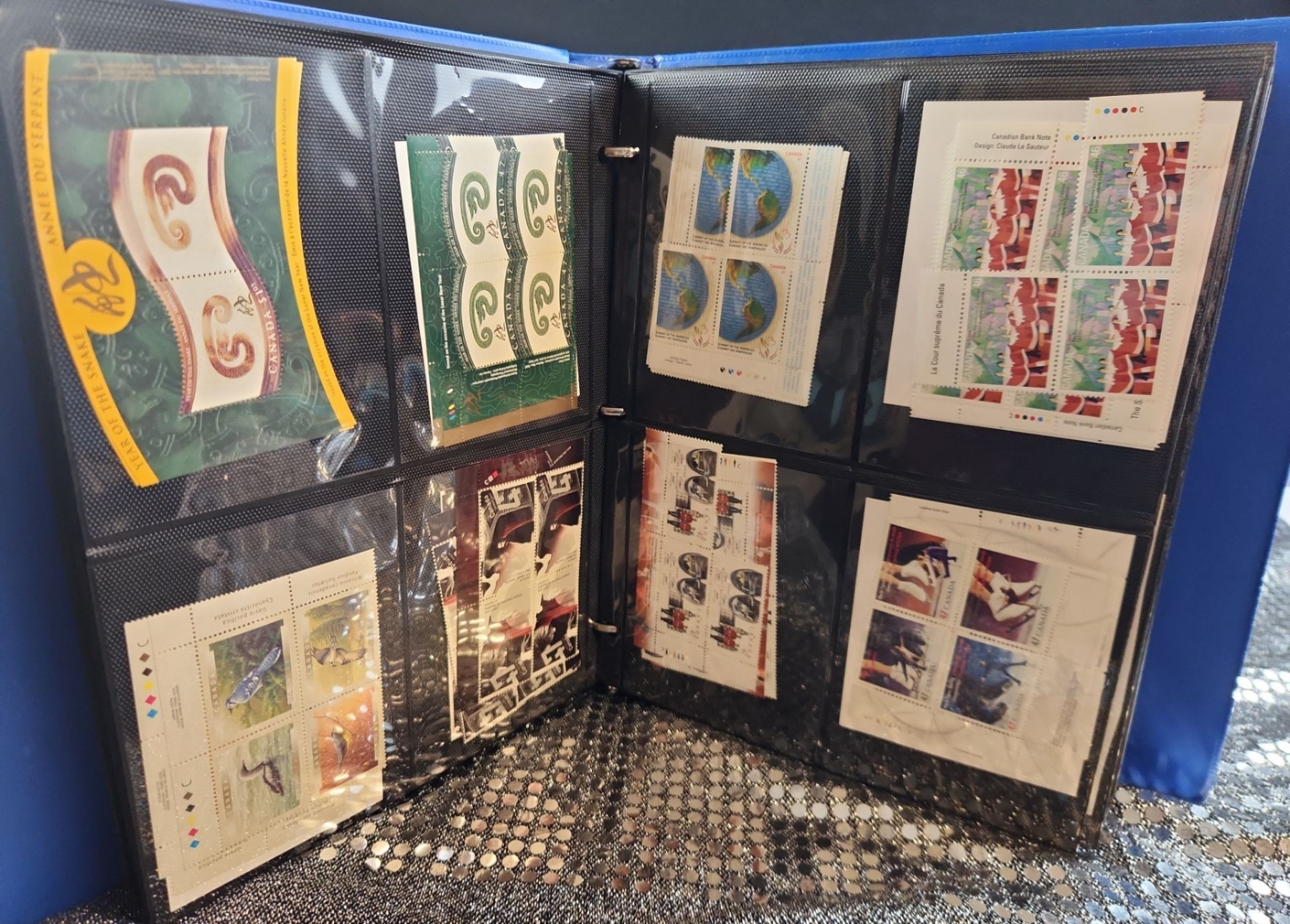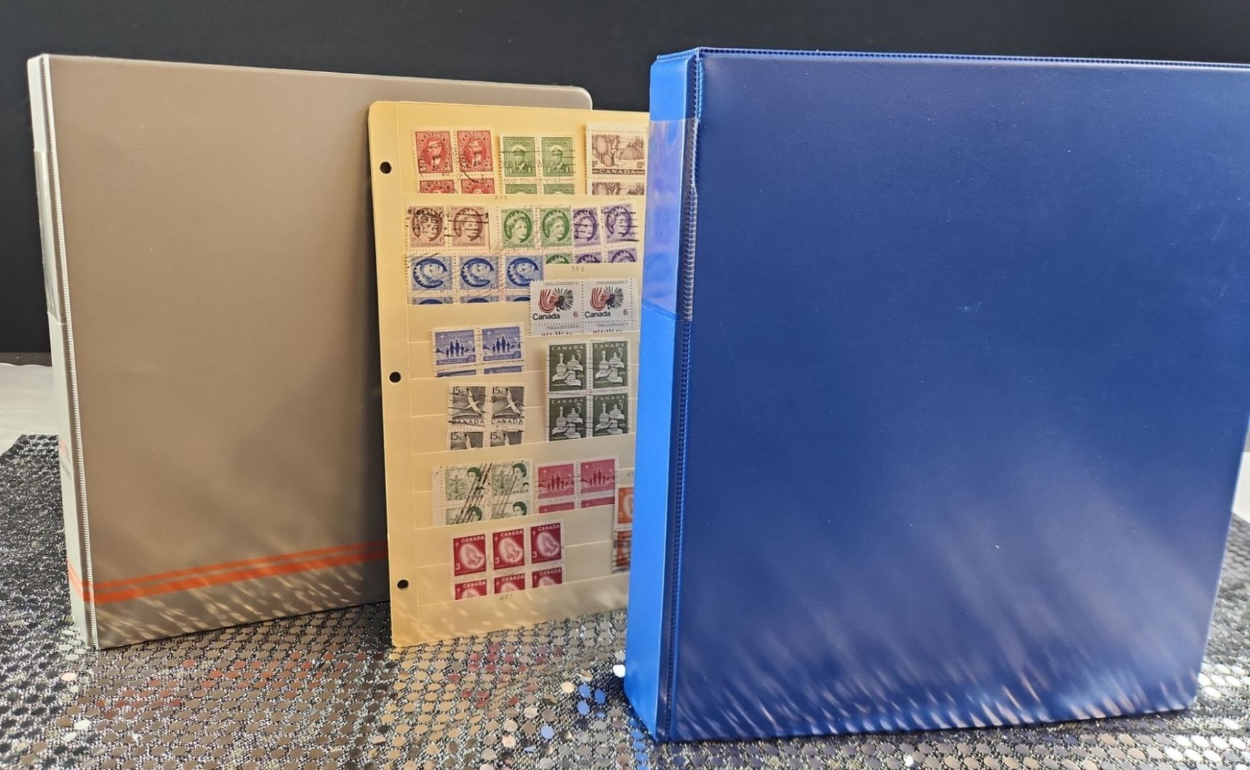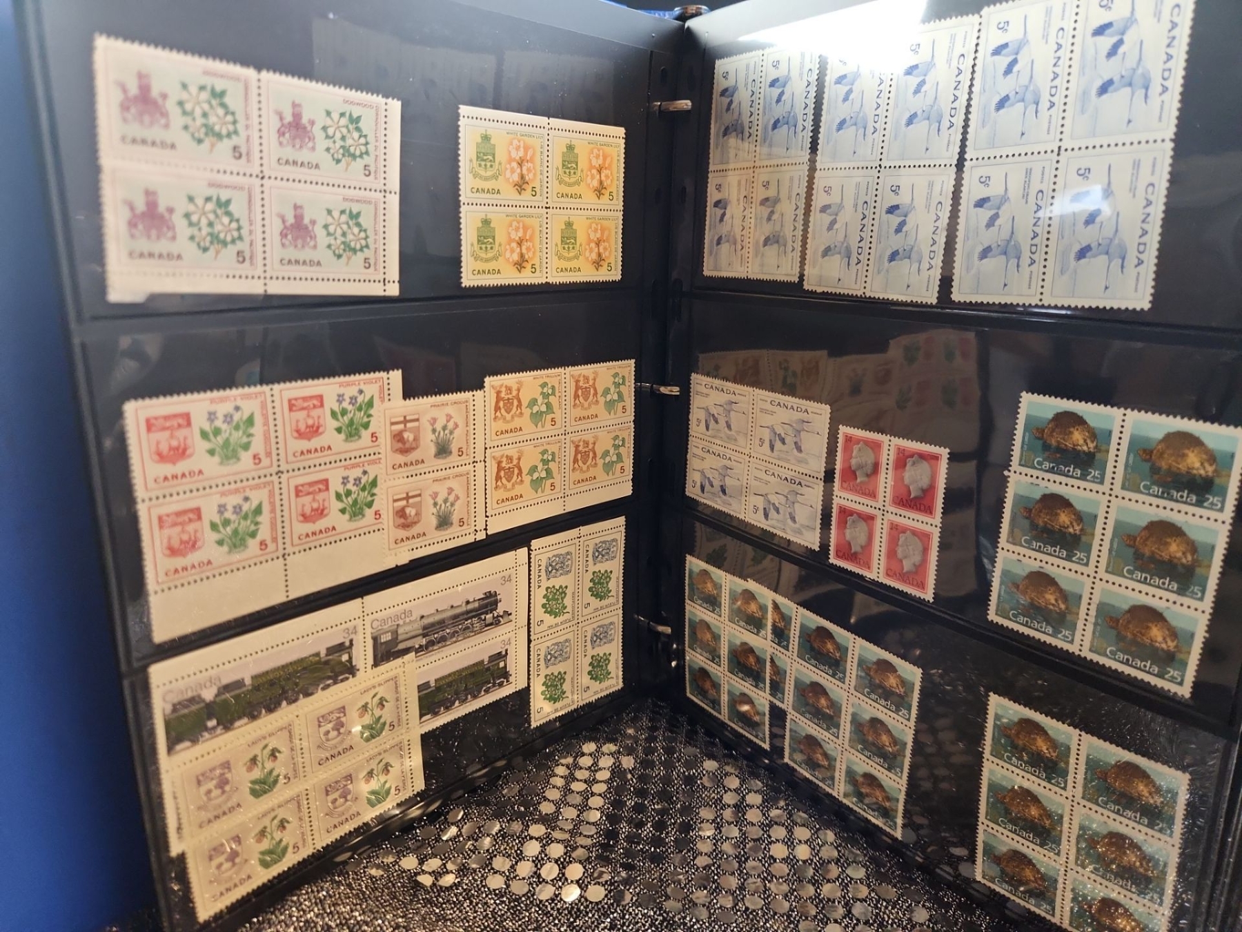 This 2 binder set contains a mixed collection of vintage Canadian postage stamps spanning several decades of postal history. Various themes include Year of The Snake, Canada 50, Canadian flora, fauna, historical locomotives, Anne of Green Gables, etc. Housed in protective plastic sheets.