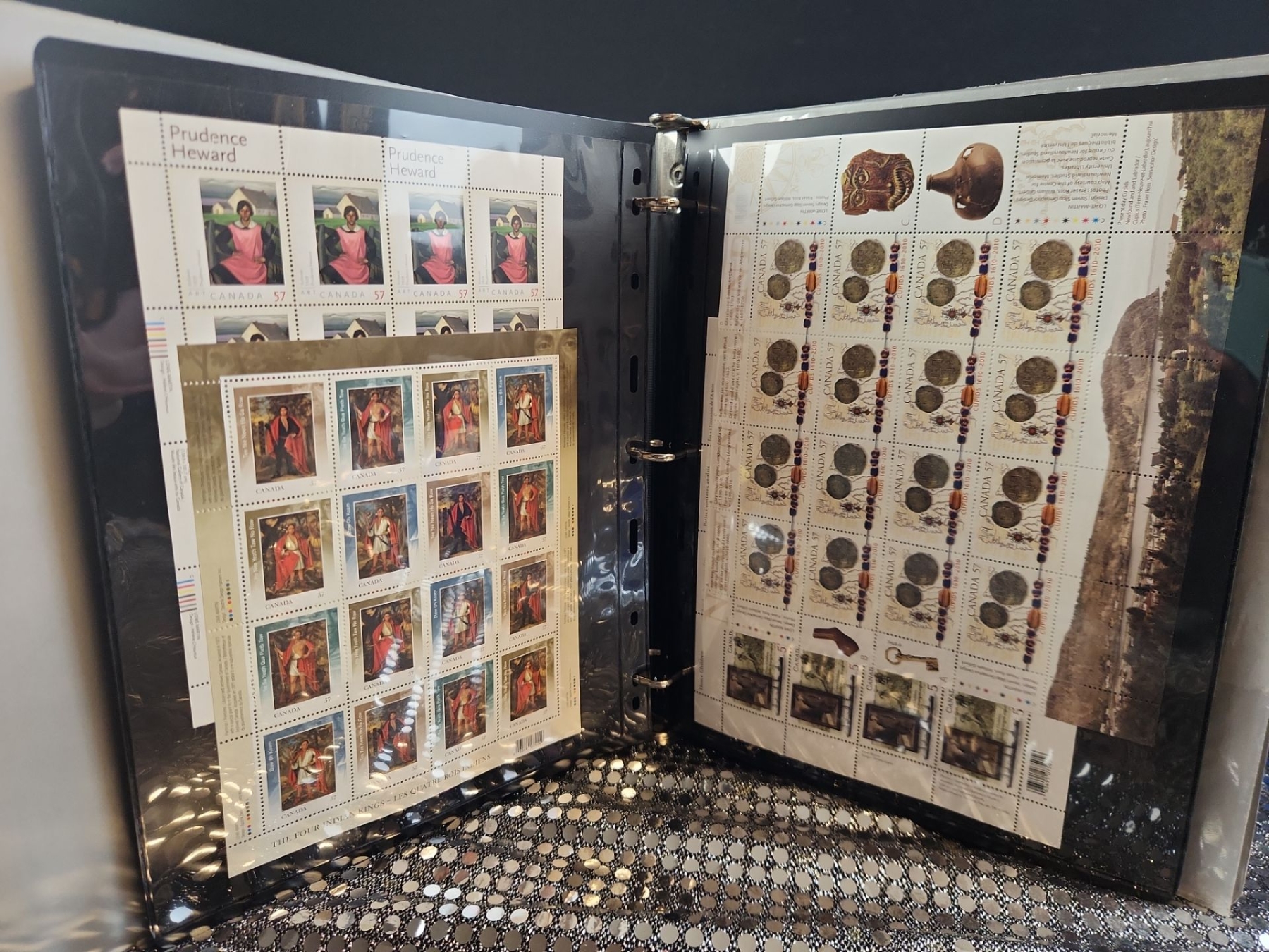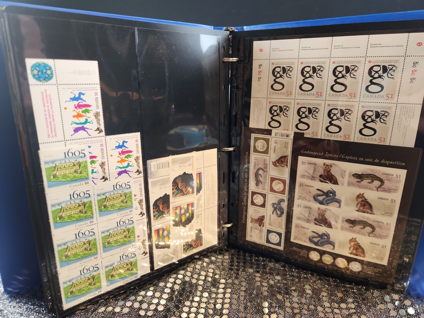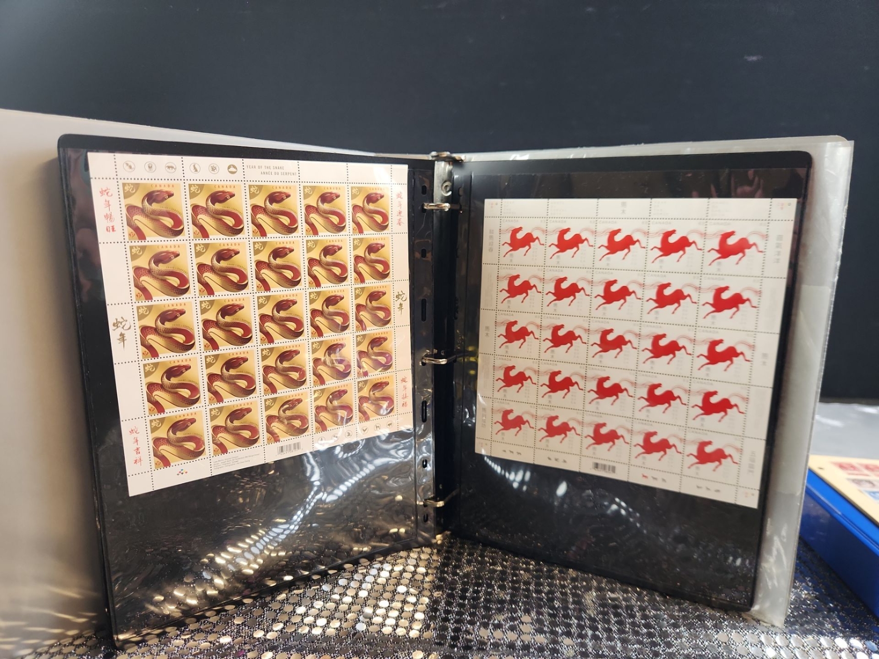 This 2 binder set contains a mixed collection of vintage Canadian postage stamps spanning several decades of postal history. Various themes include Year of The Snake, Canada 50, Canadian flora, fauna, historical locomotives, Anne of Green Gables, etc. Housed in protective plastic sheets.